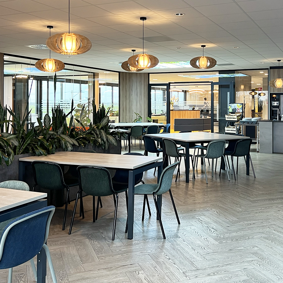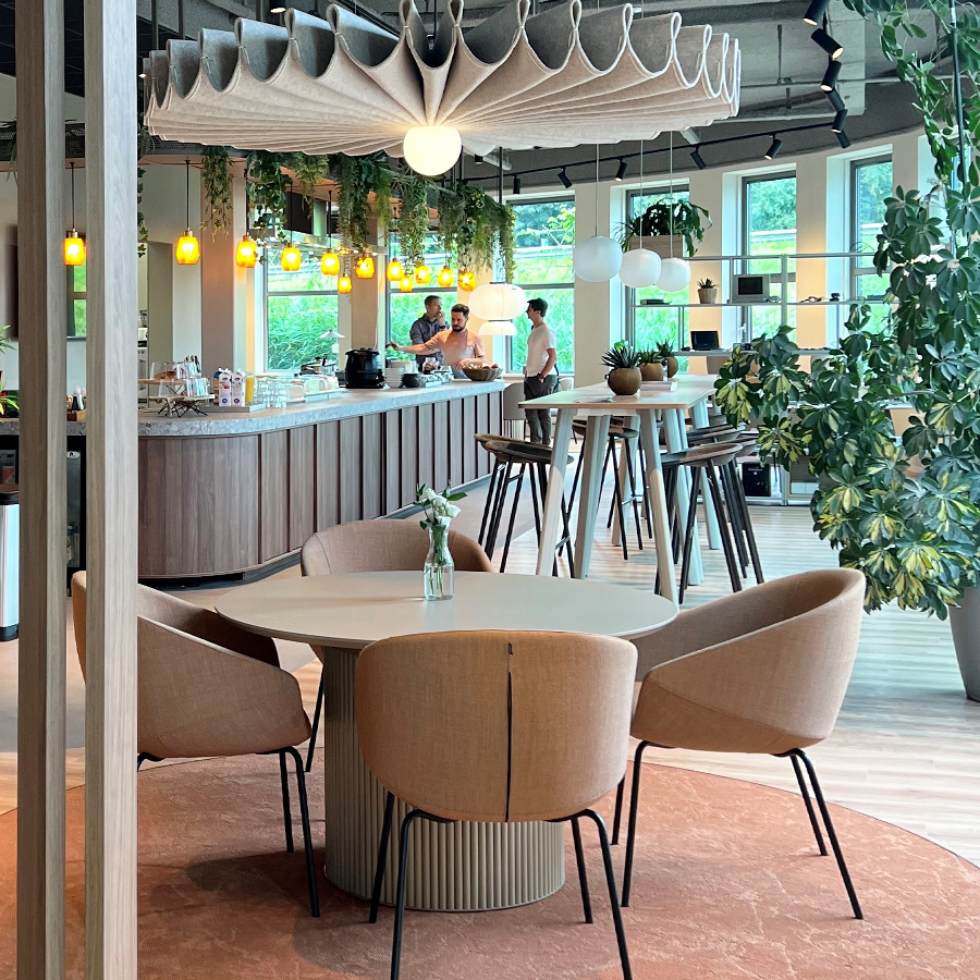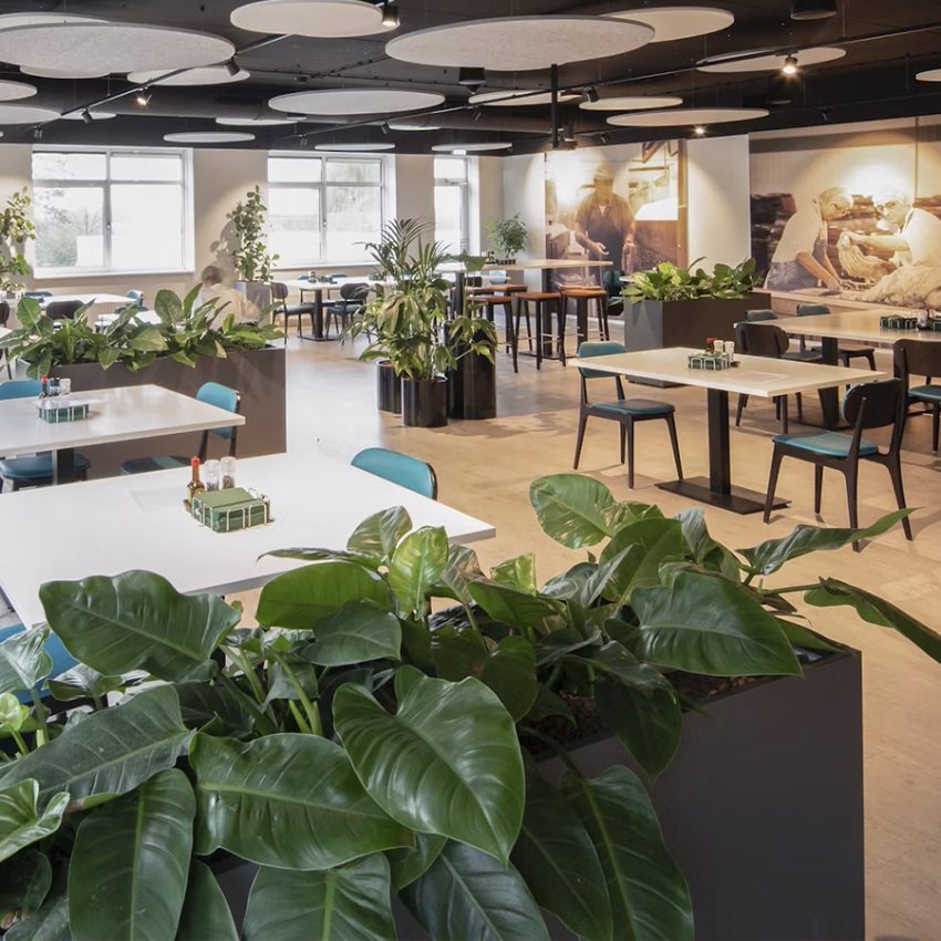 Kantine inrichting met planten en losse tafels.
