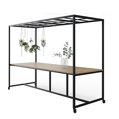 De benches zijn gecombineerd met efficiënte opbergmogelijkheden zoals vaste ladeblokken en kasten met daarop plantenbakken. Om contact tussen de werknemers mogelijk te houden zijn afscheidingen tussen de werkplekken niet te hoog en de beplanting laag.