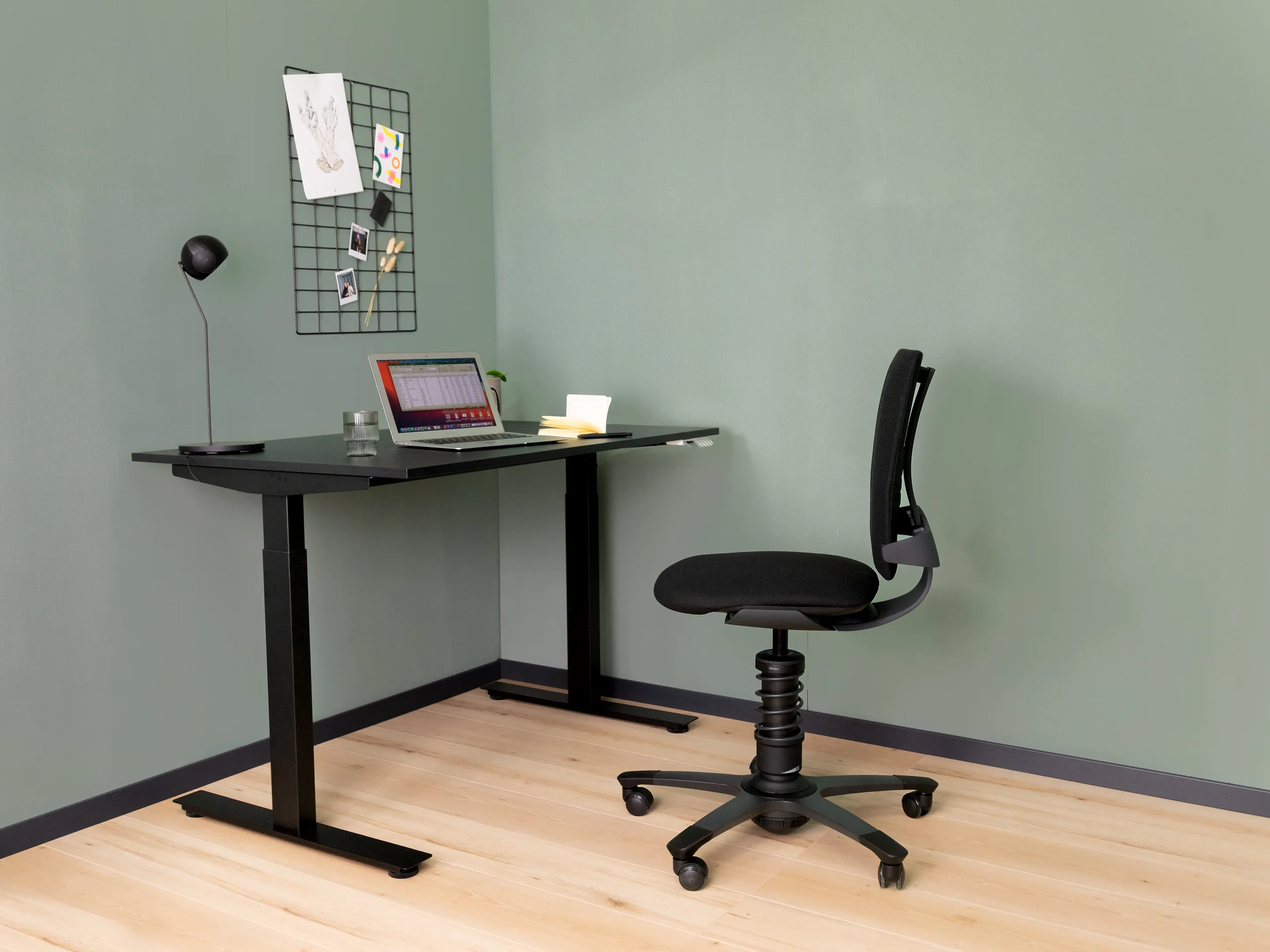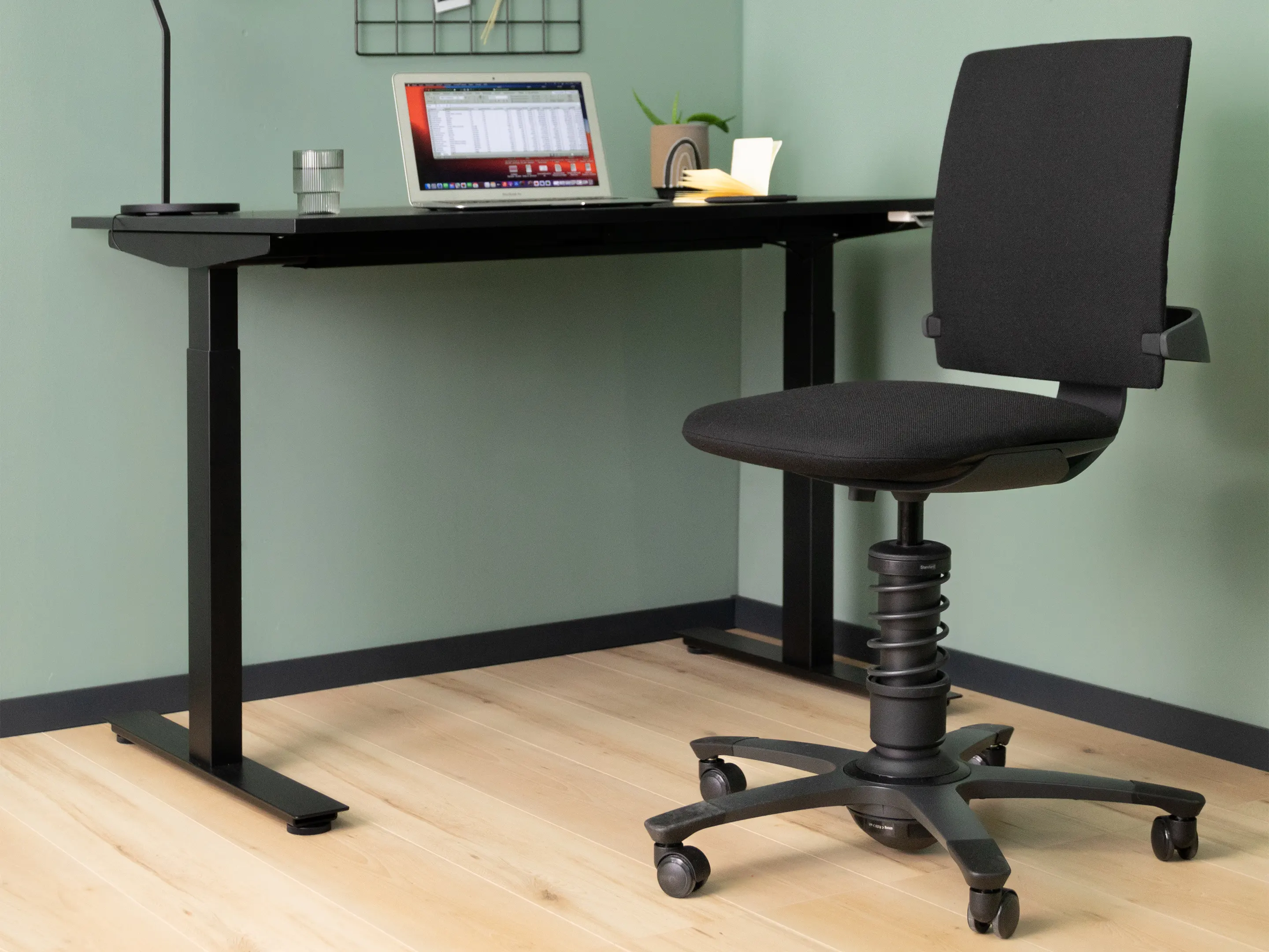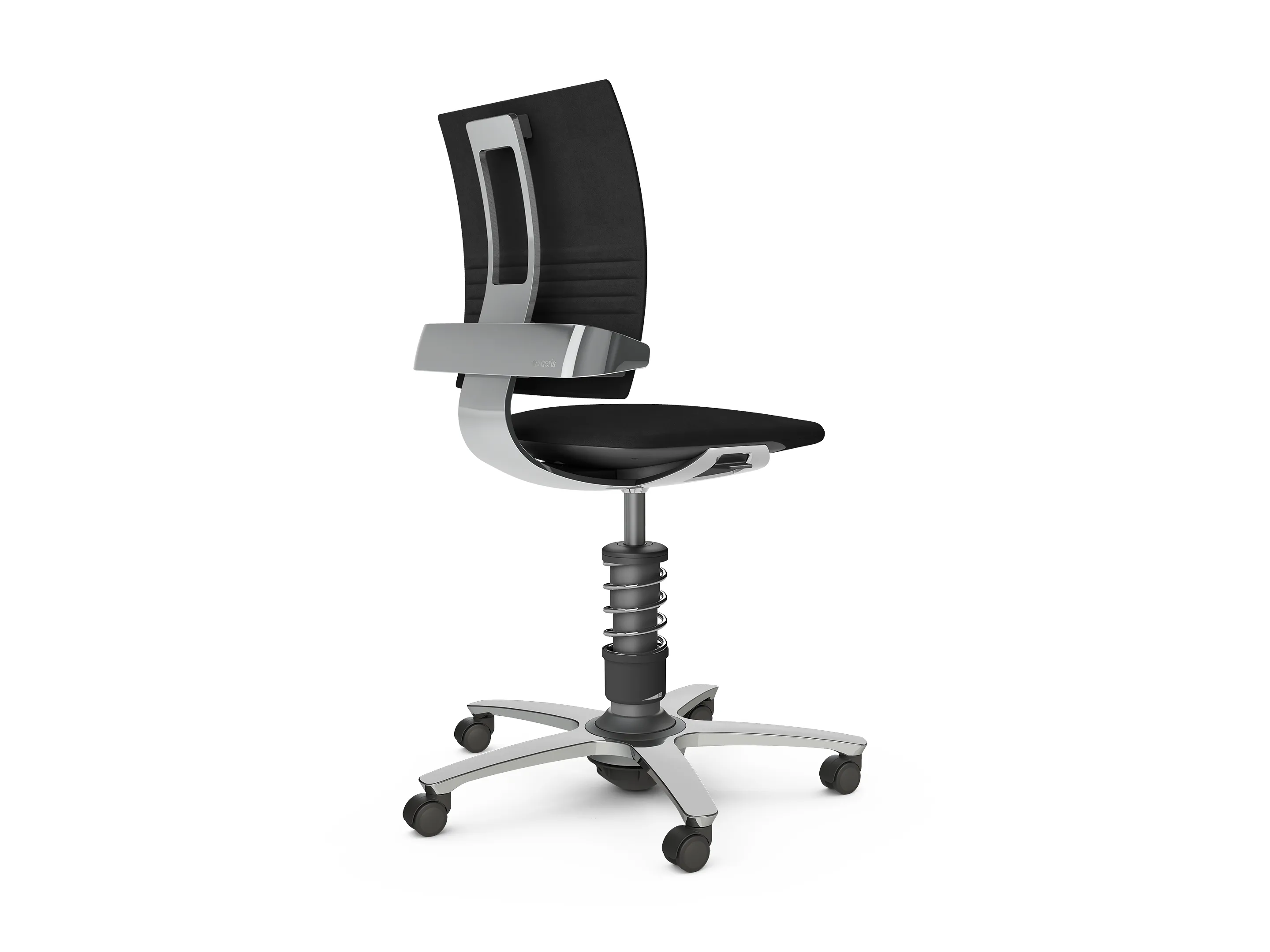 3Dee op wielen met een standaard veerpoot. Geschikt voor lichaamsgewicht 50-120kg, bereik hoogteverstelling belast: 420–560mm, bereik hoogteverstelling onbelast: 500–640mm.