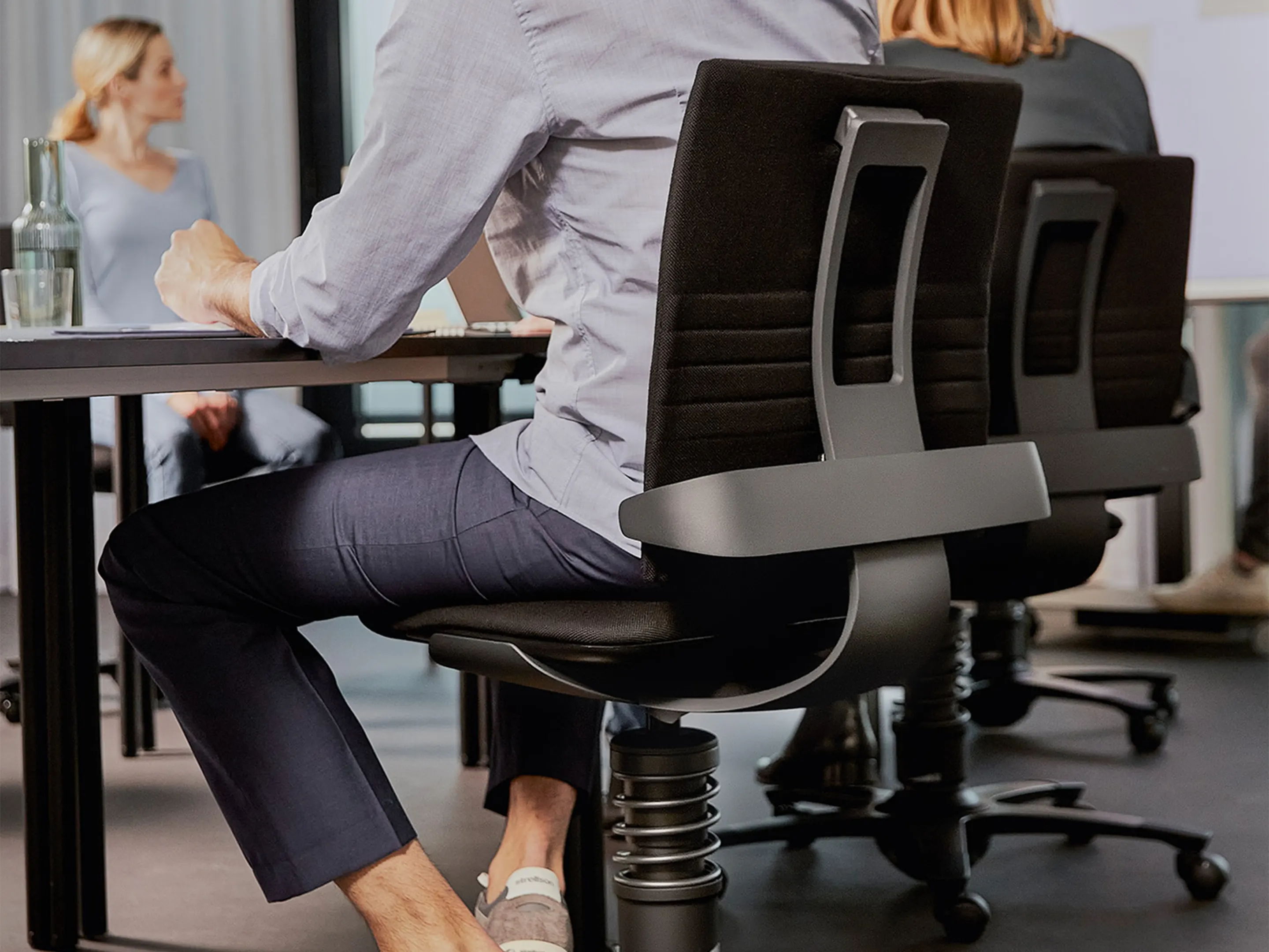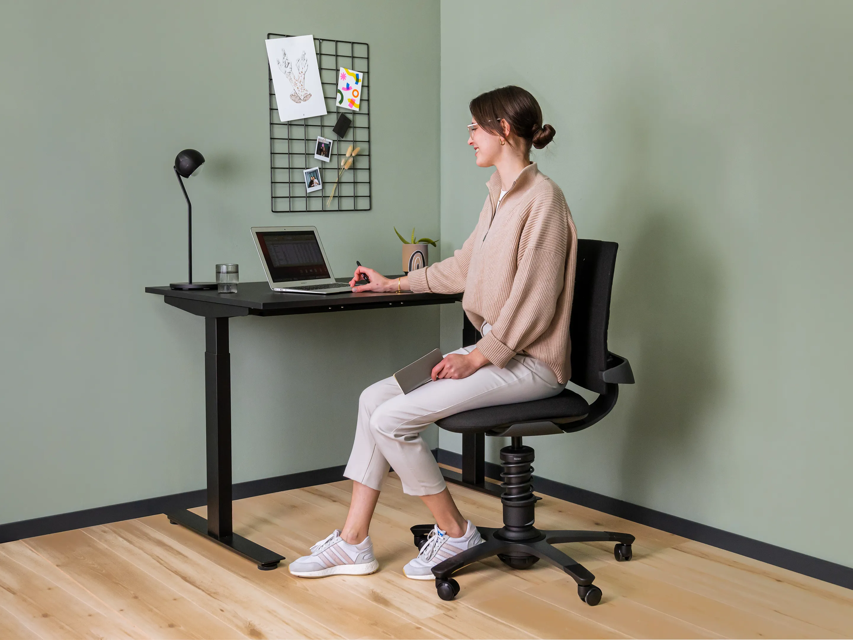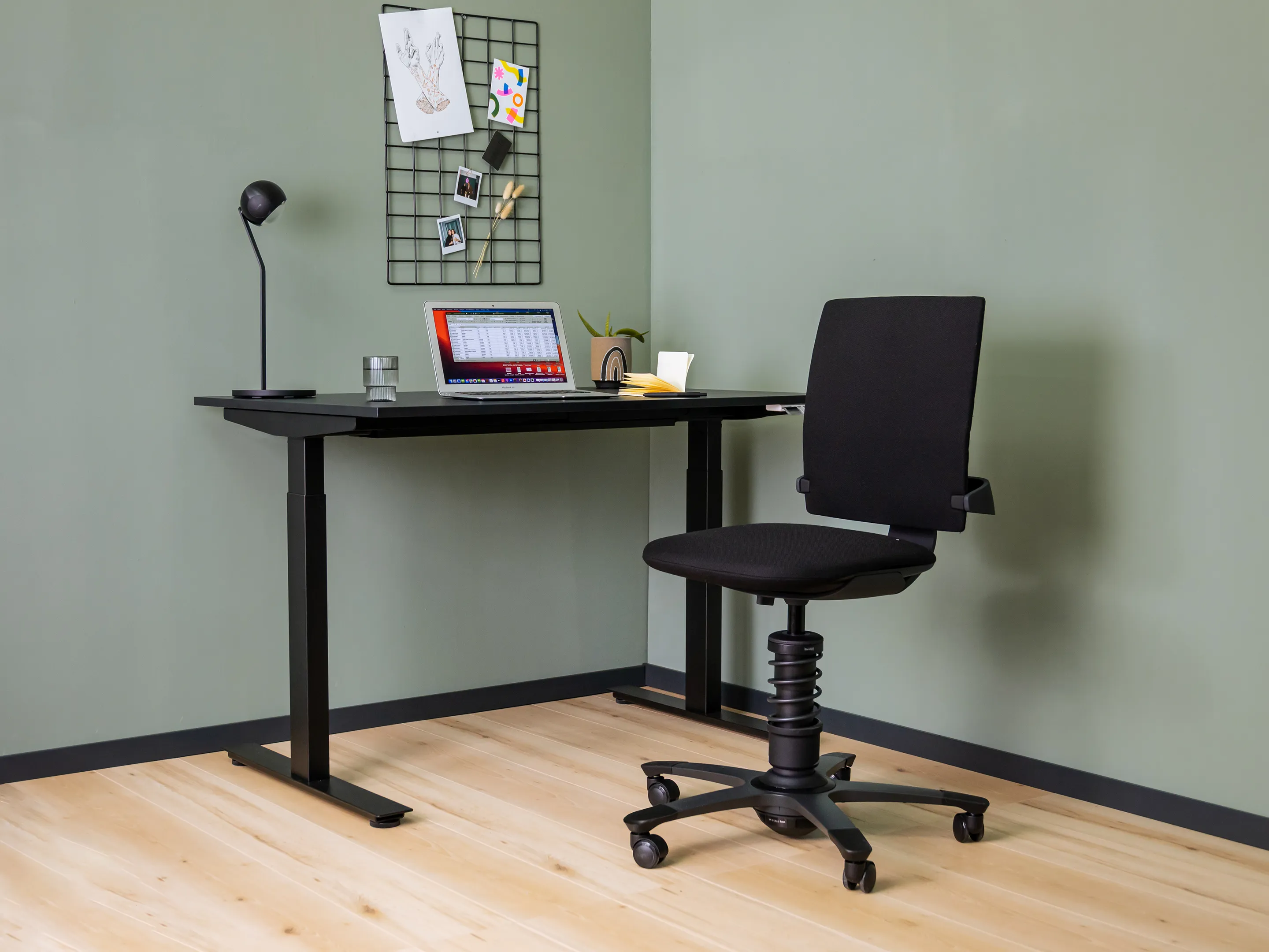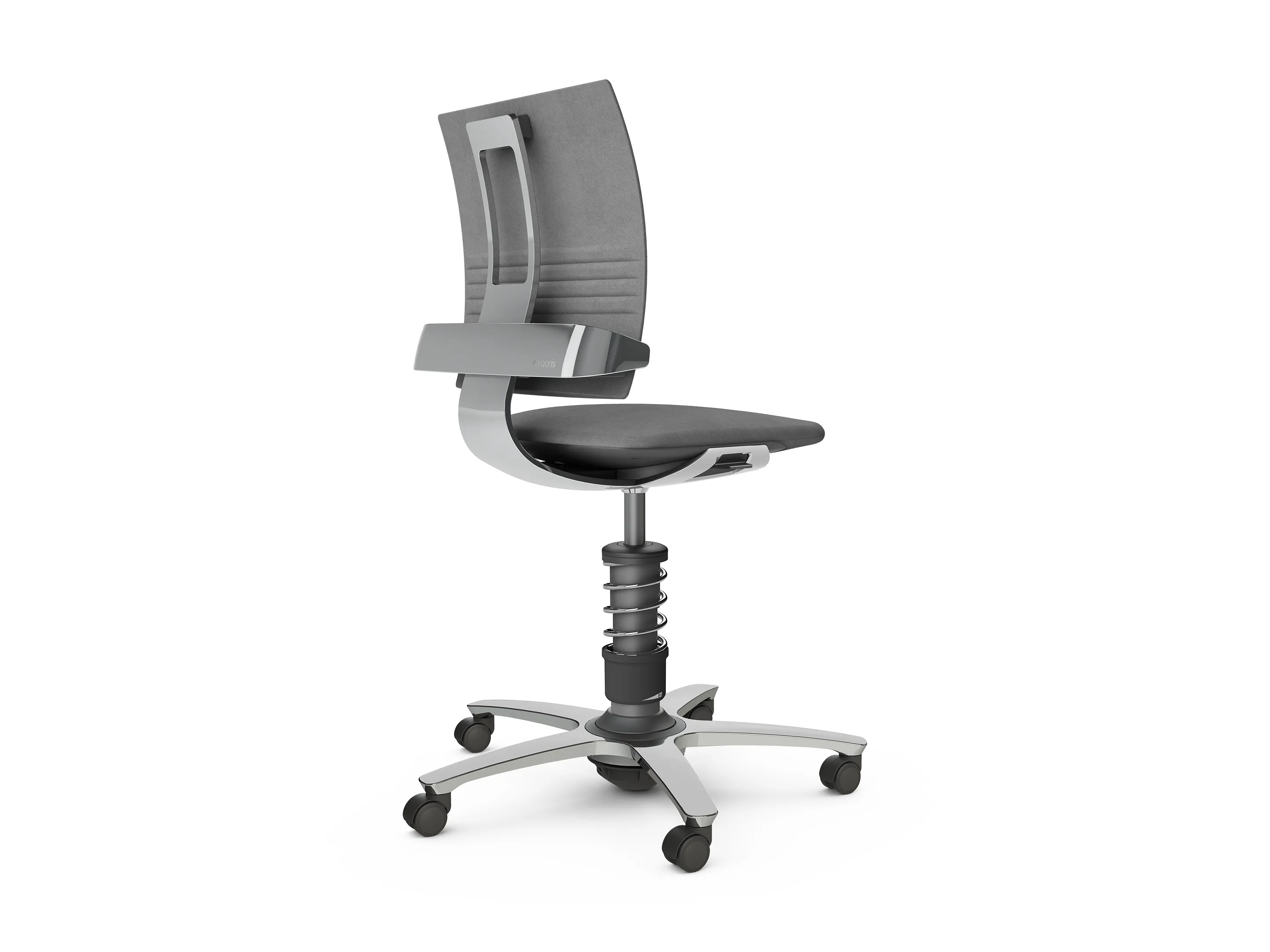 3Dee op wielen met een standaard veerpoot. Geschikt voor lichaamsgewicht 50-120kg, bereik hoogteverstelling belast: 420–560mm, bereik hoogteverstelling onbelast: 500–640mm.