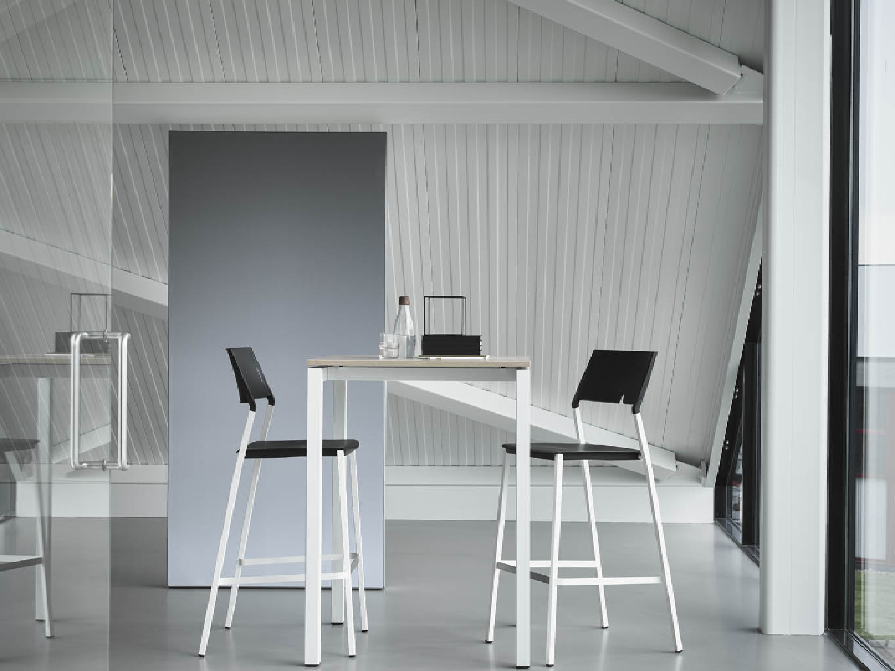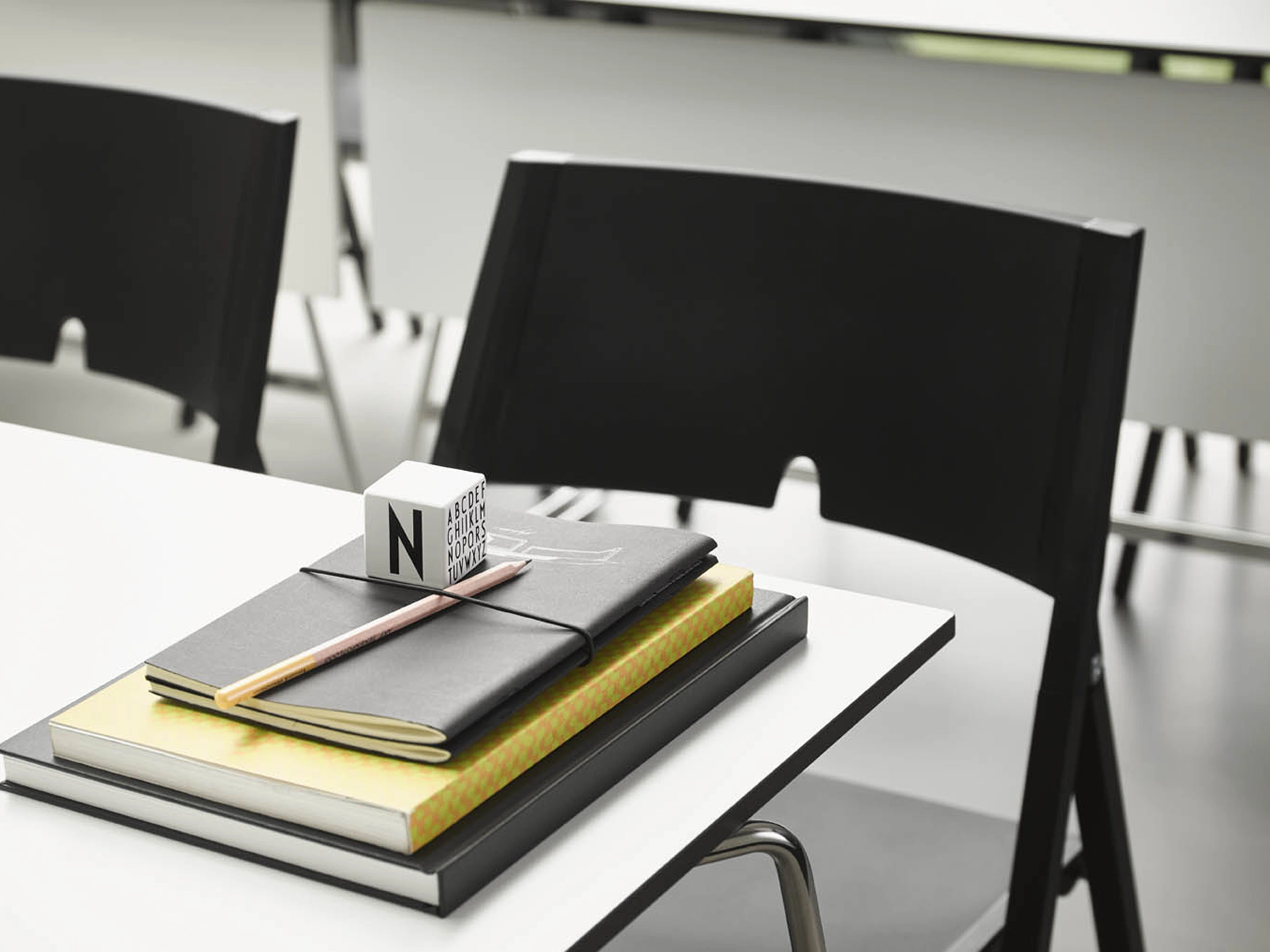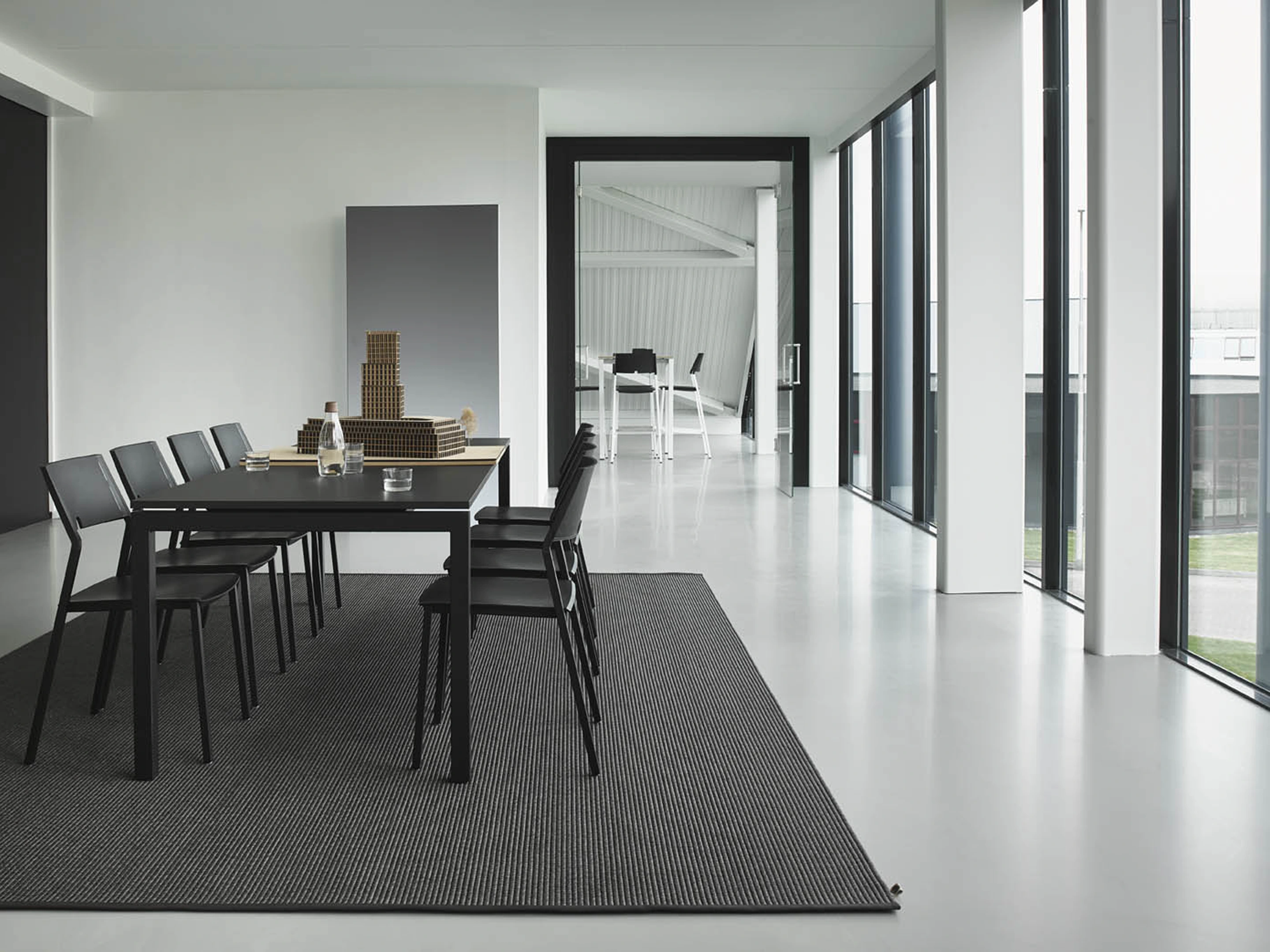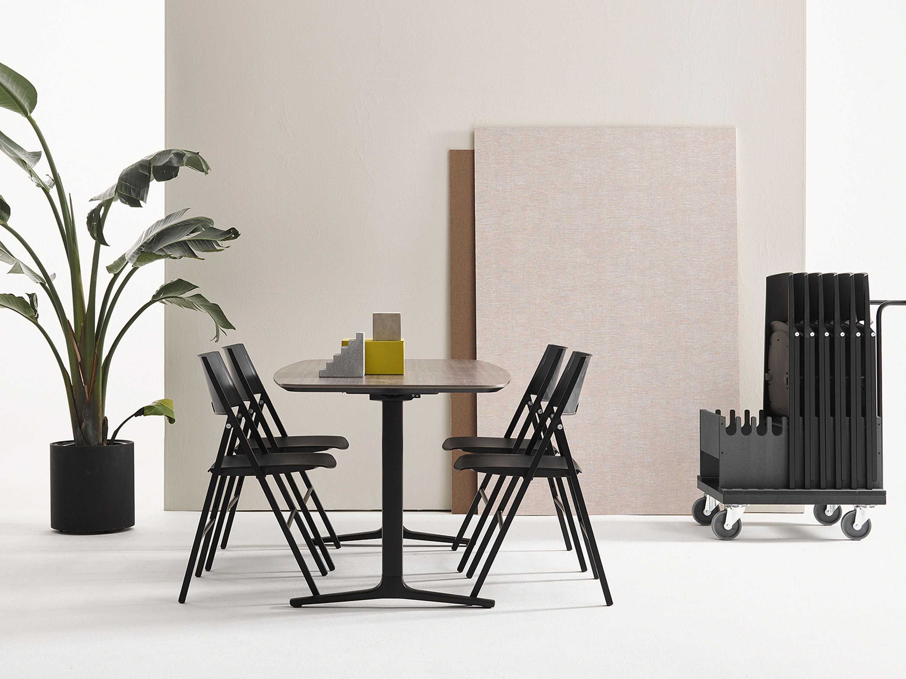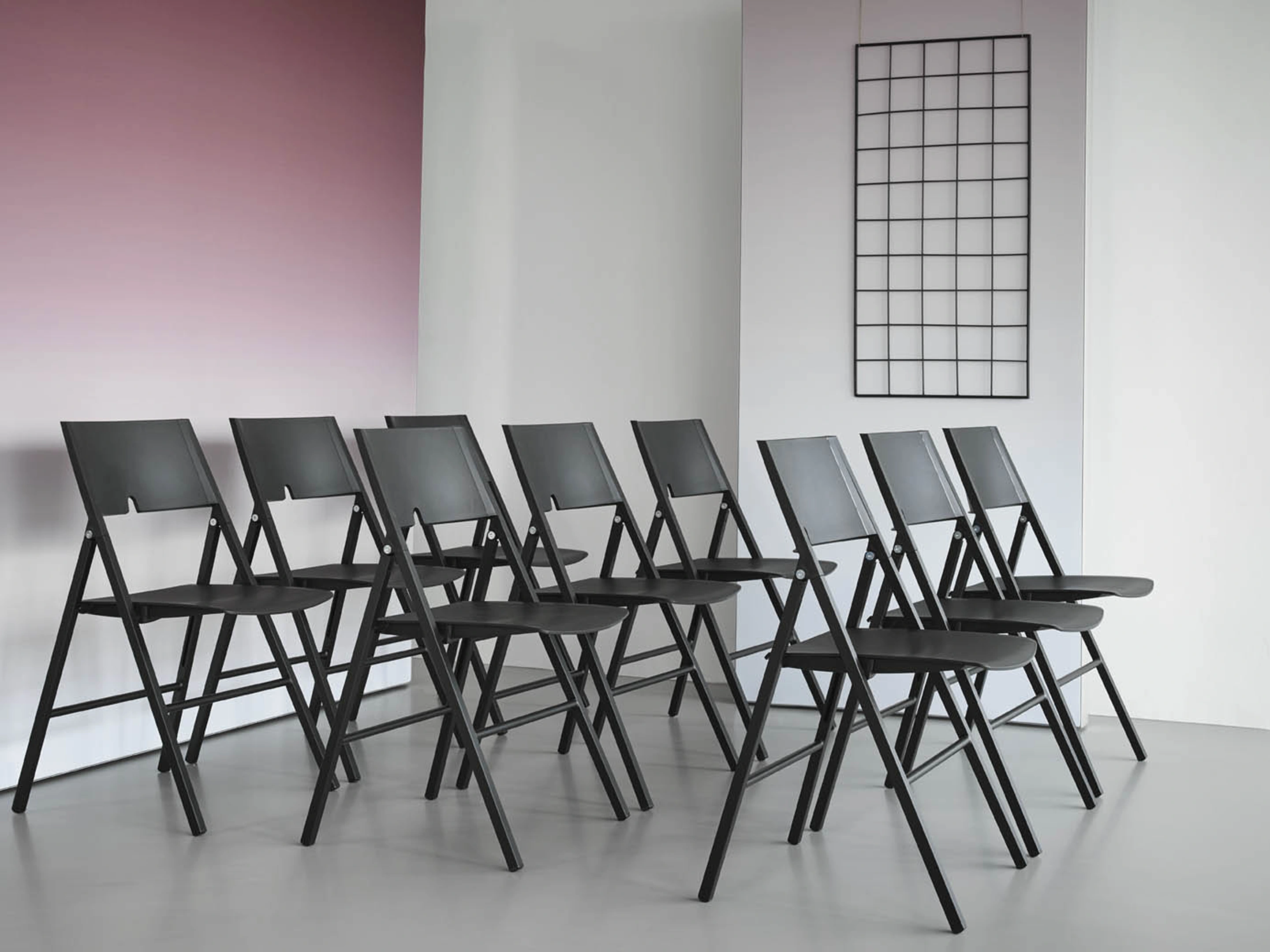 Opklapbare stoel met 4-poots frame voorzien van vilt glijders, frame, zitting en rug volledig in het zwart.