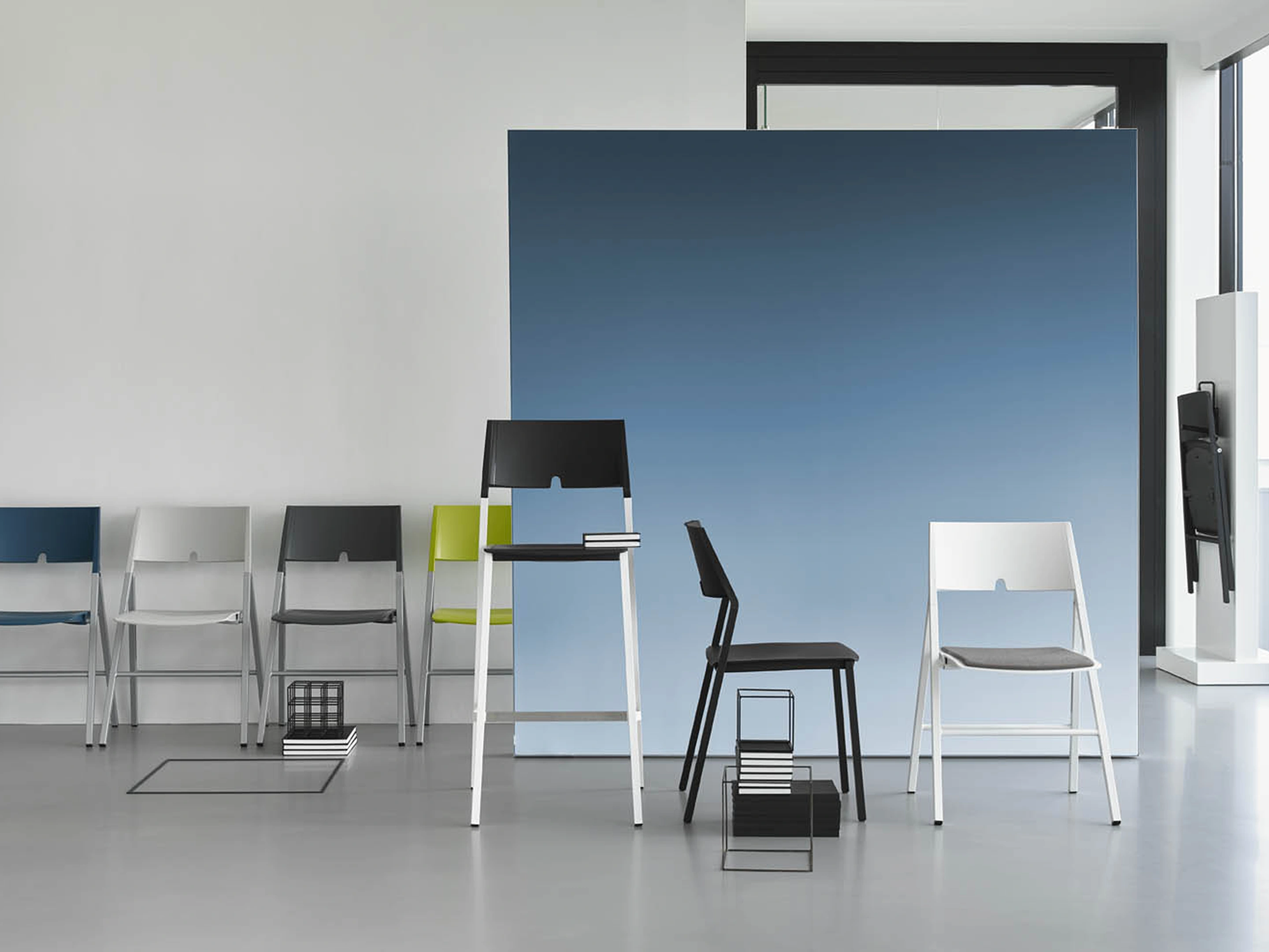 Opklapbare stoel met 4-poots frame voorzien van vilt glijders, met kunststof zitting en rug in kleur.