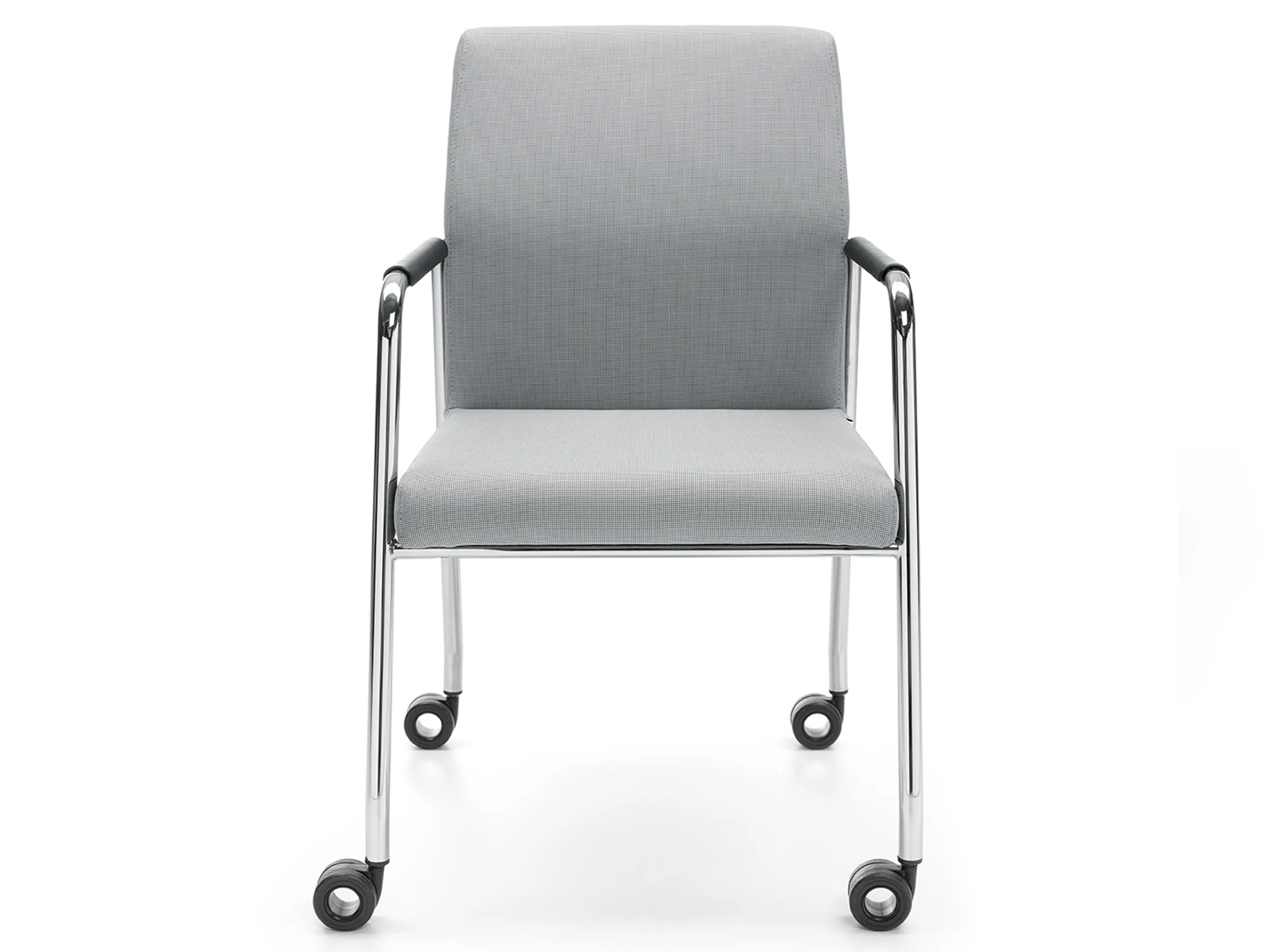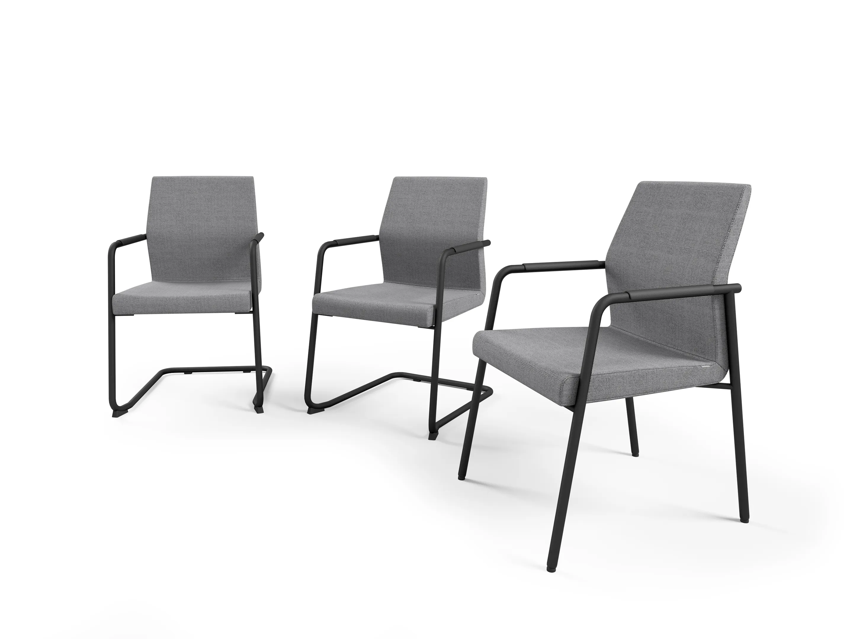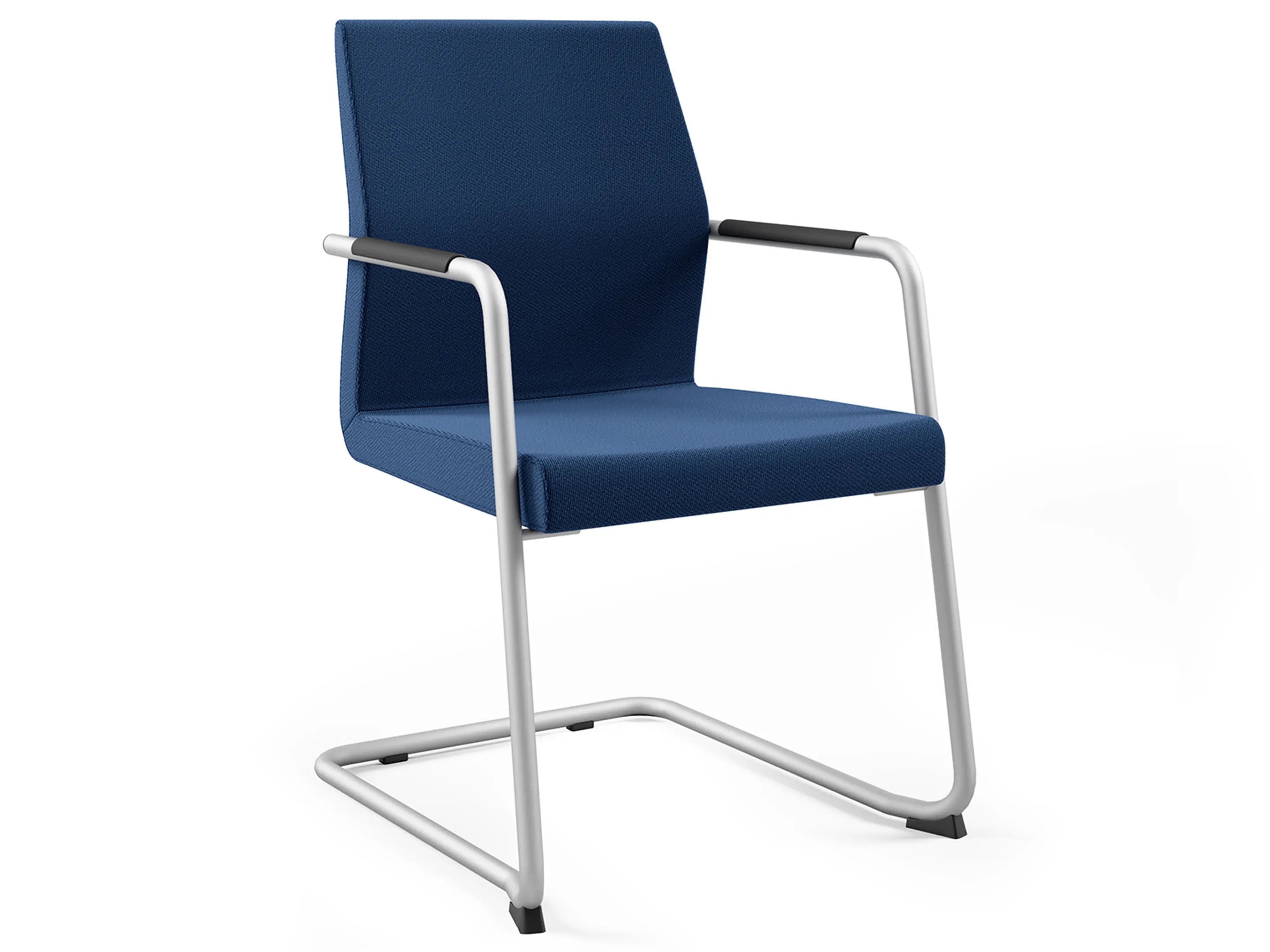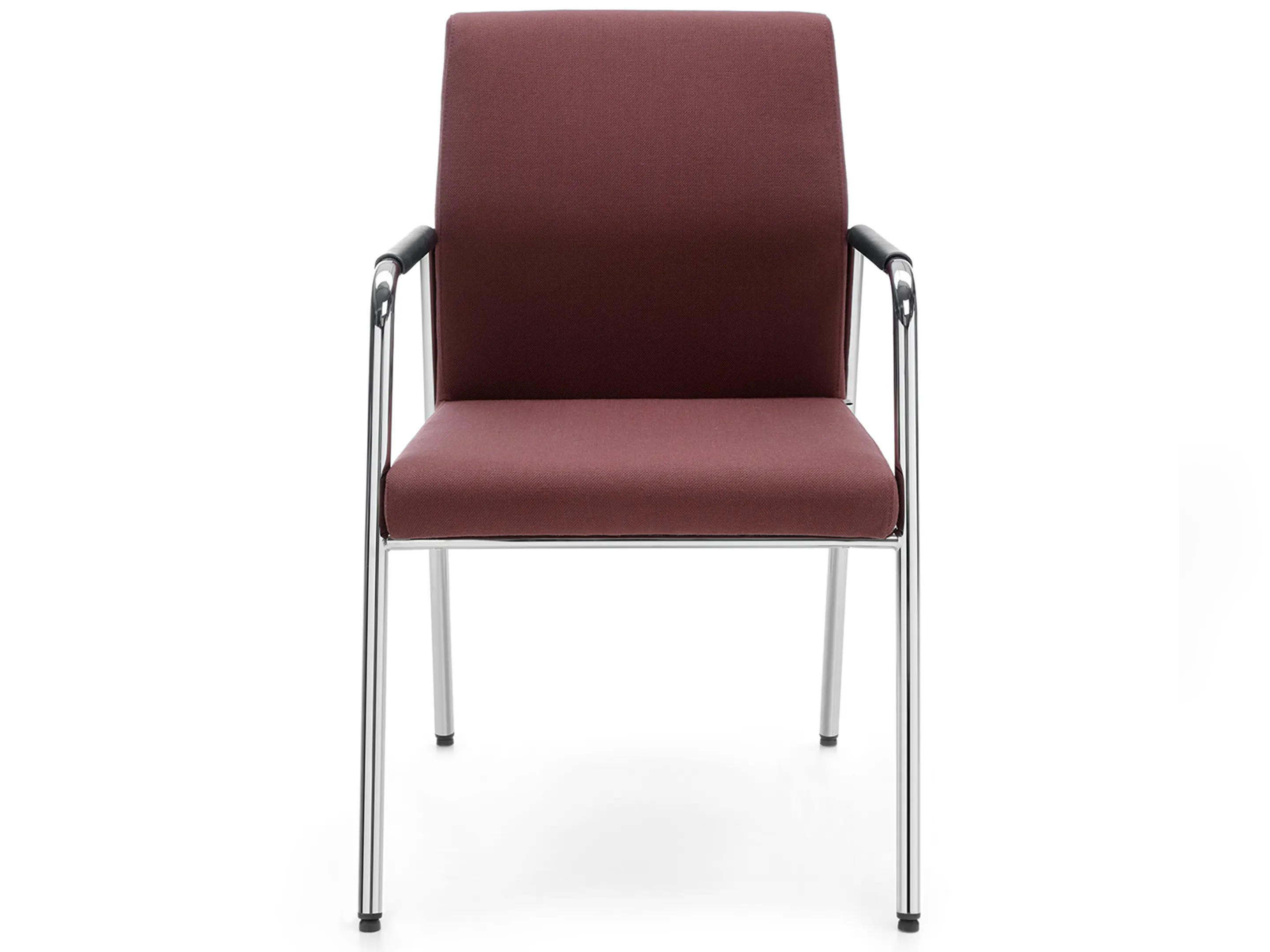 Volledig gestoffeerde vergaderstoel met armleggers met beklede pad op een sledeframe. Stapelbaar.