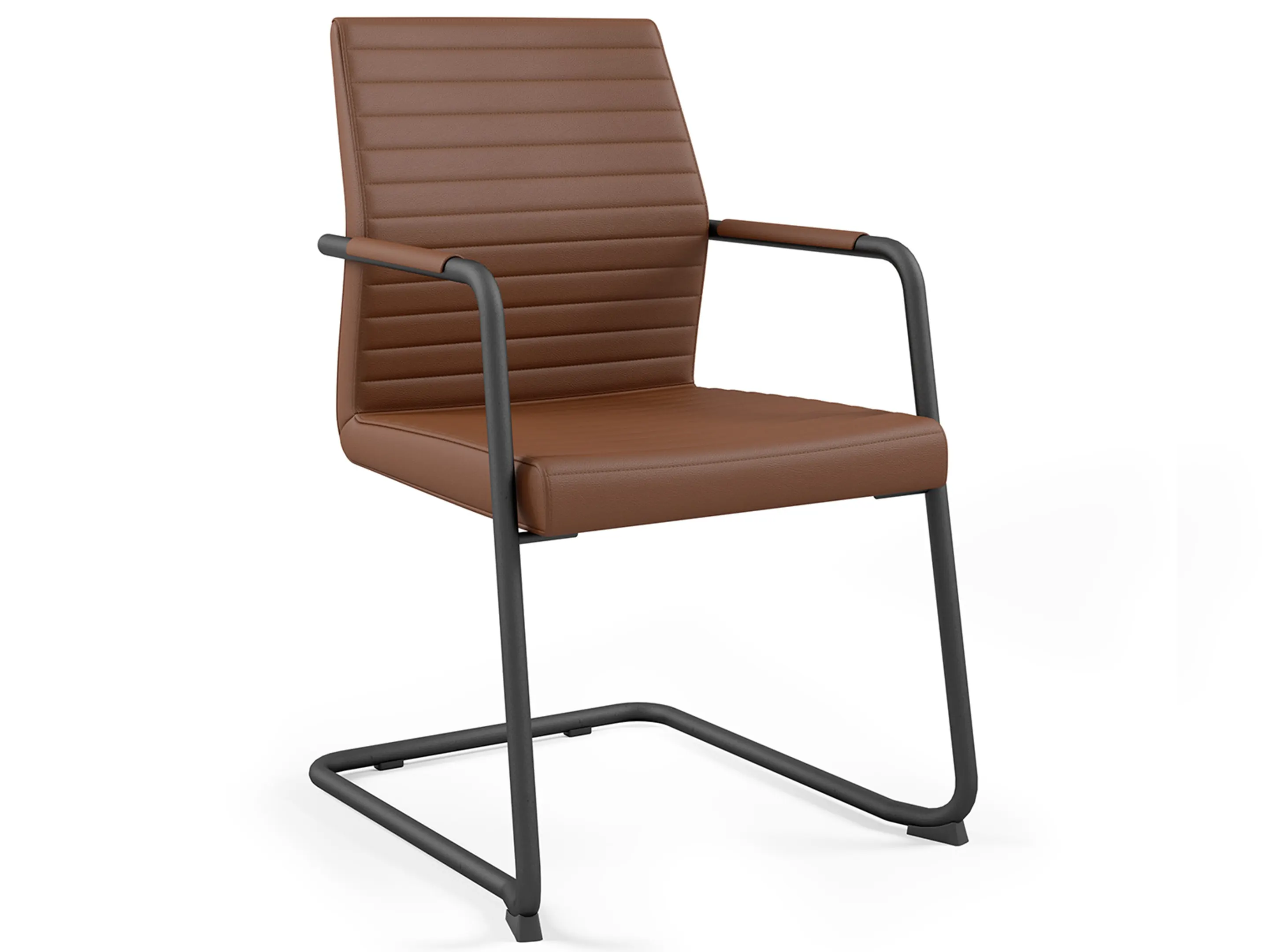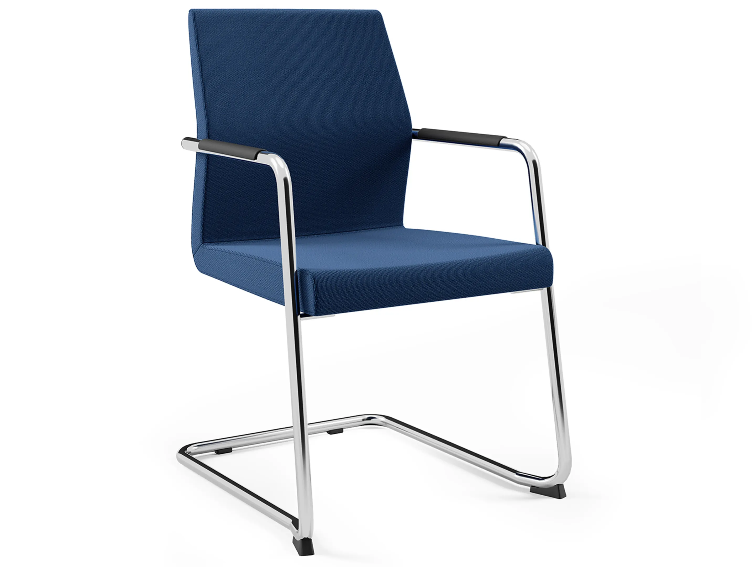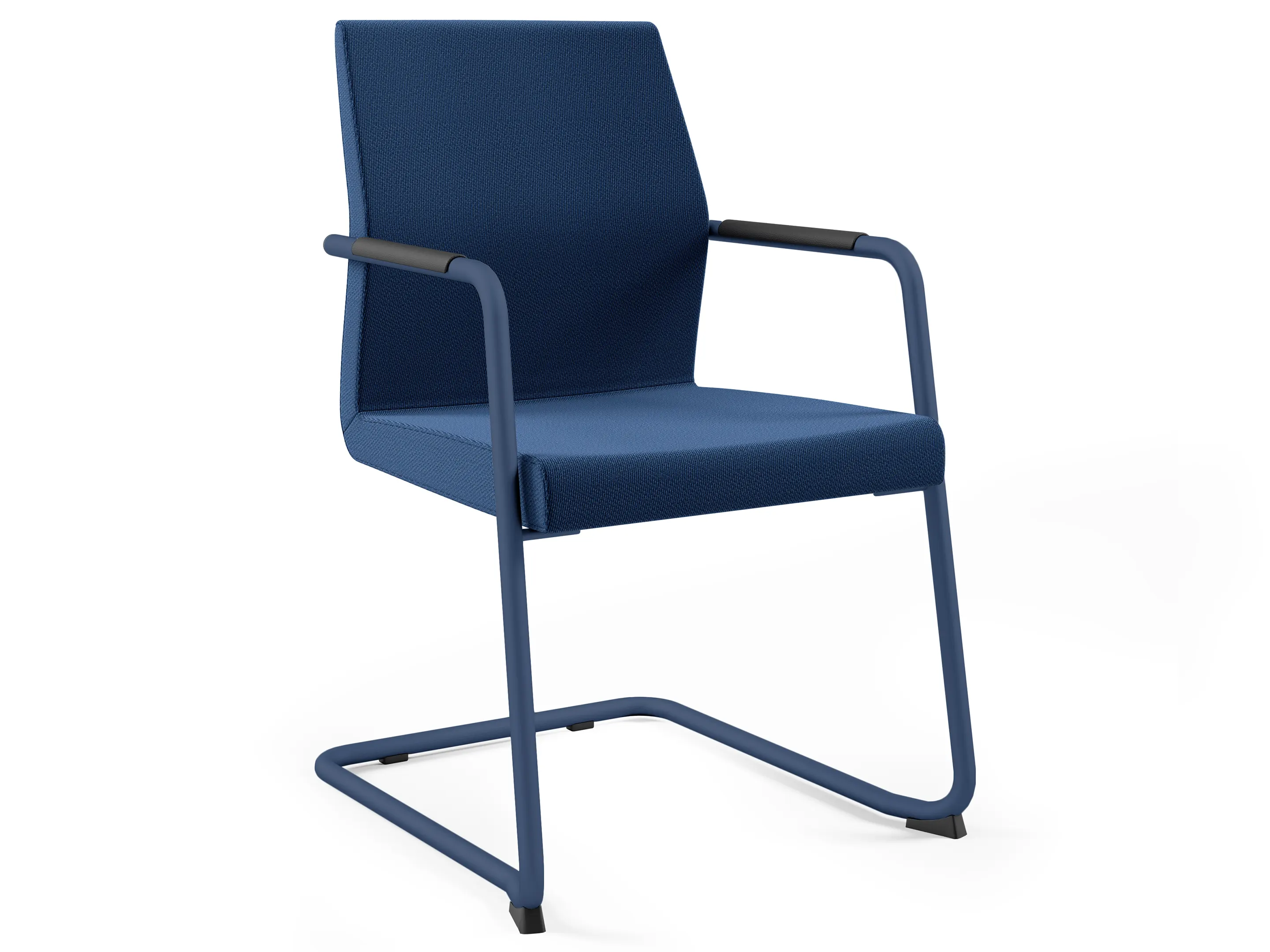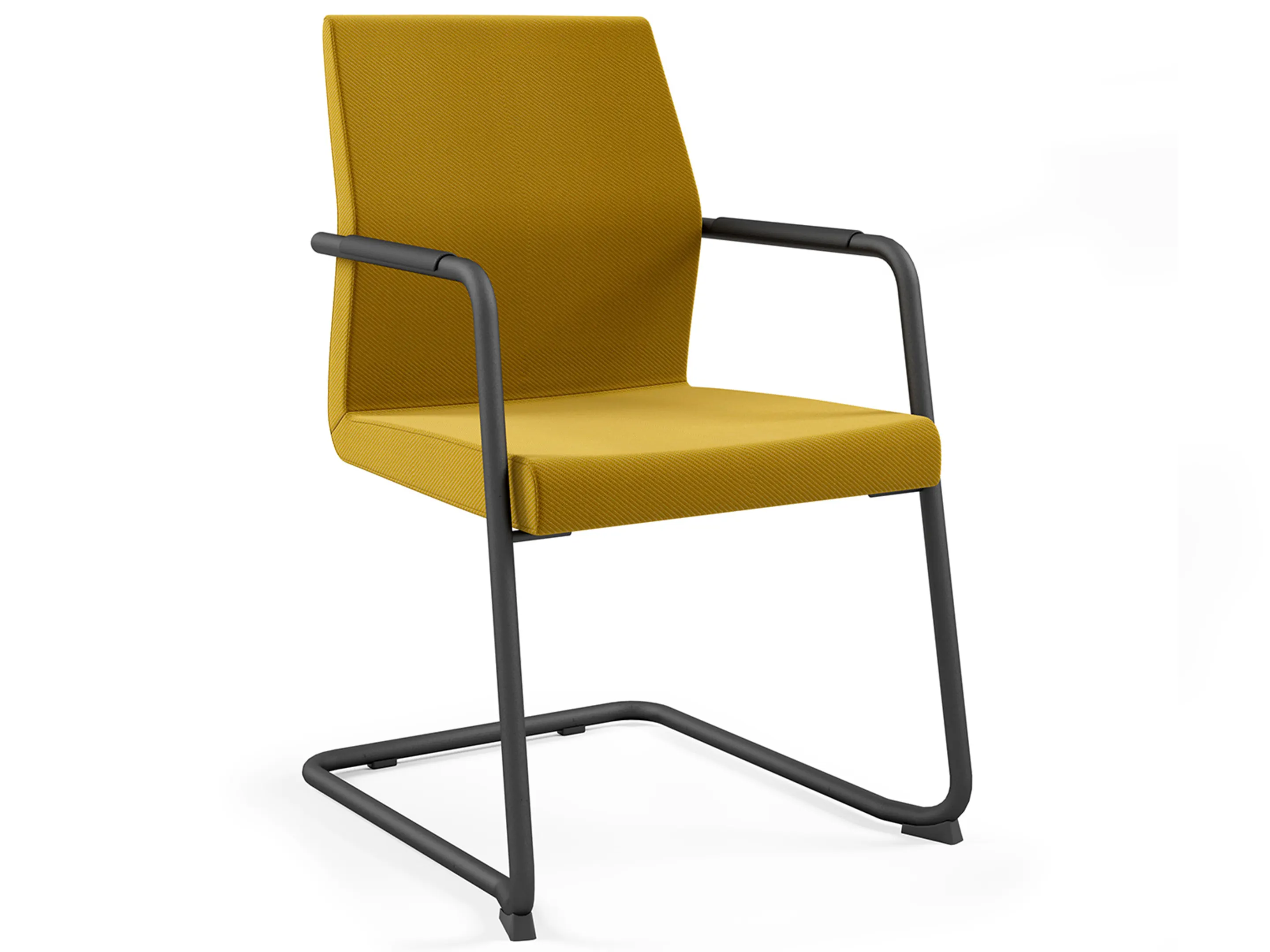Volledig gestoffeerde vergaderstoel met armleggers met beklede pad op een sledeframe. Stapelbaar.