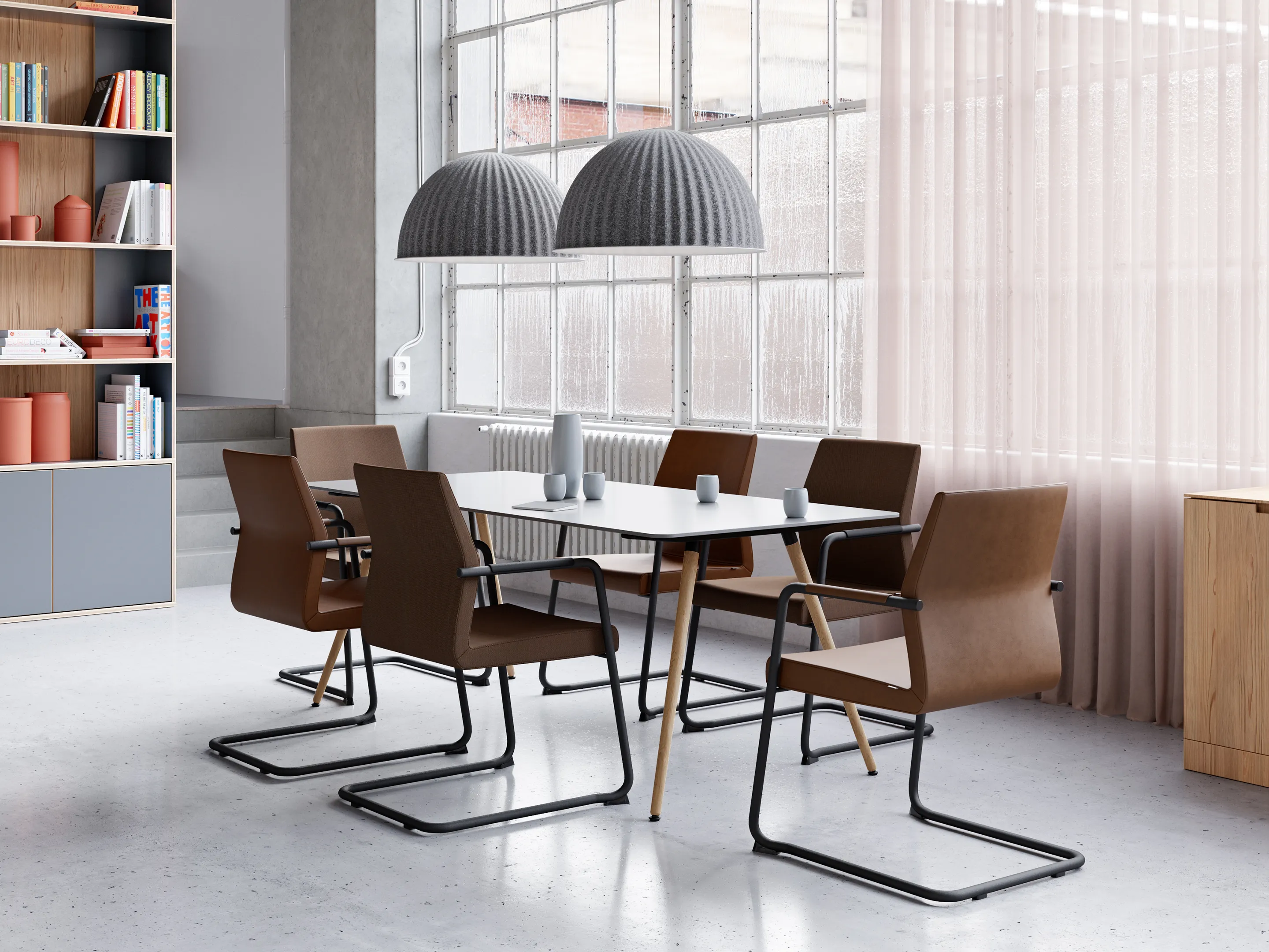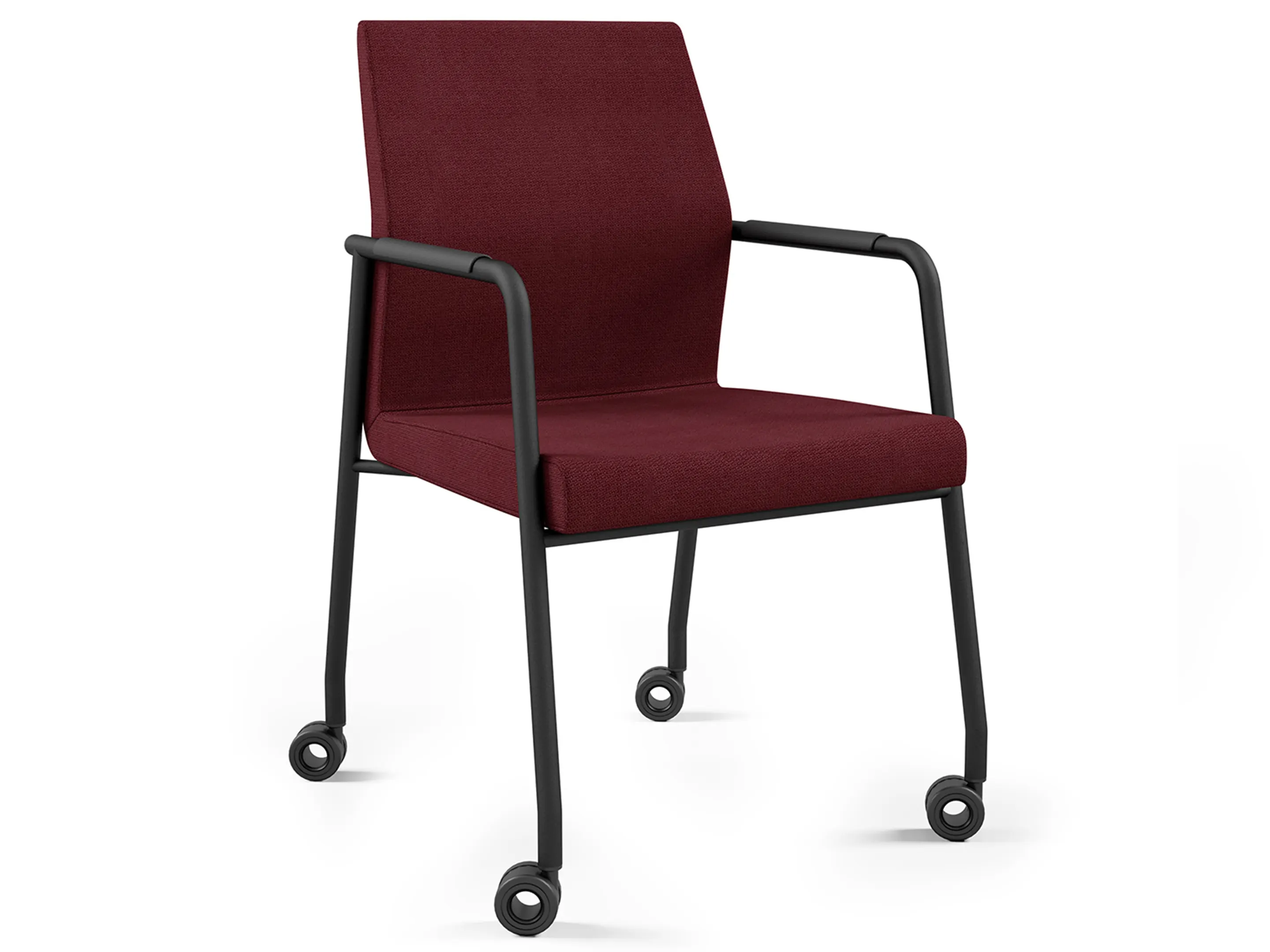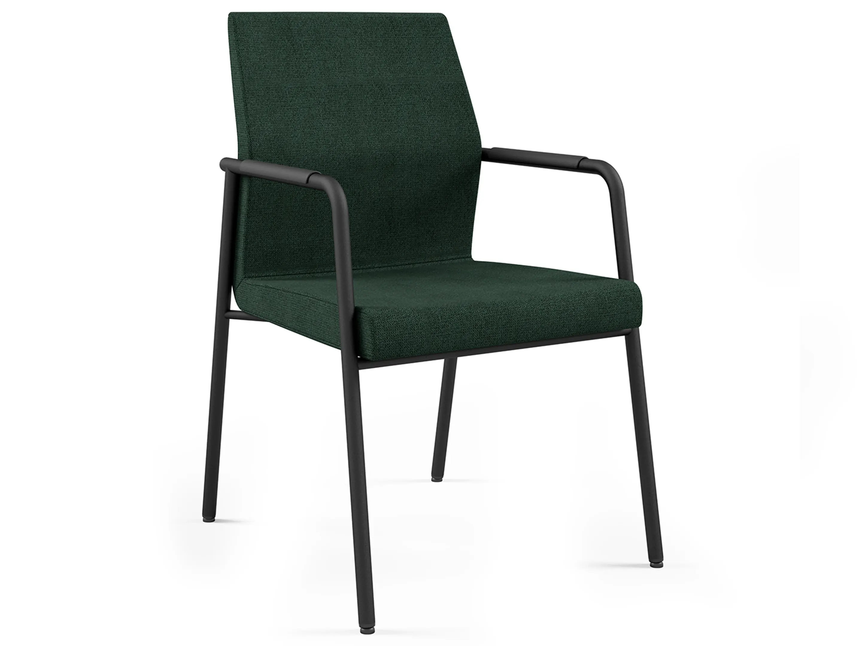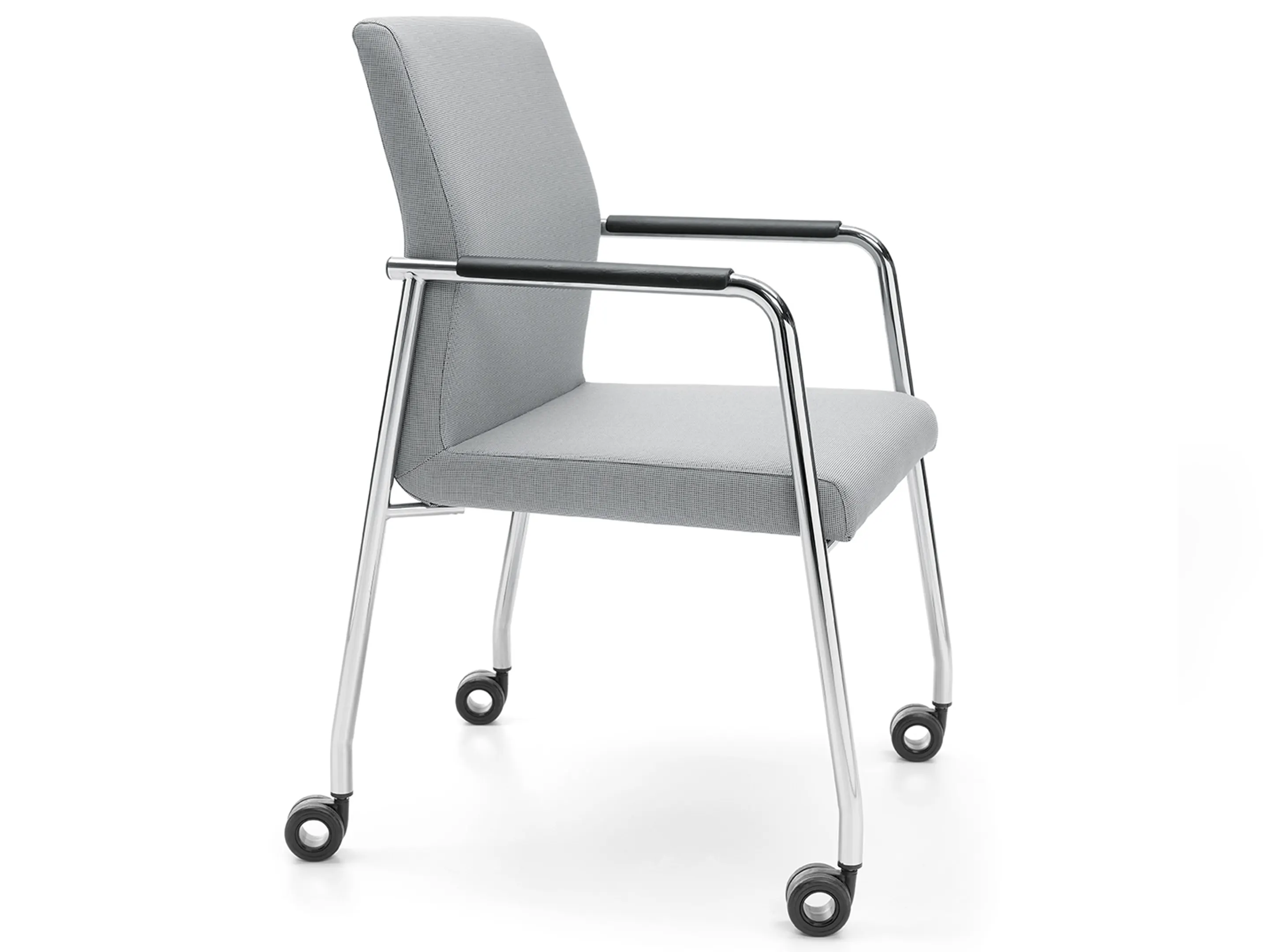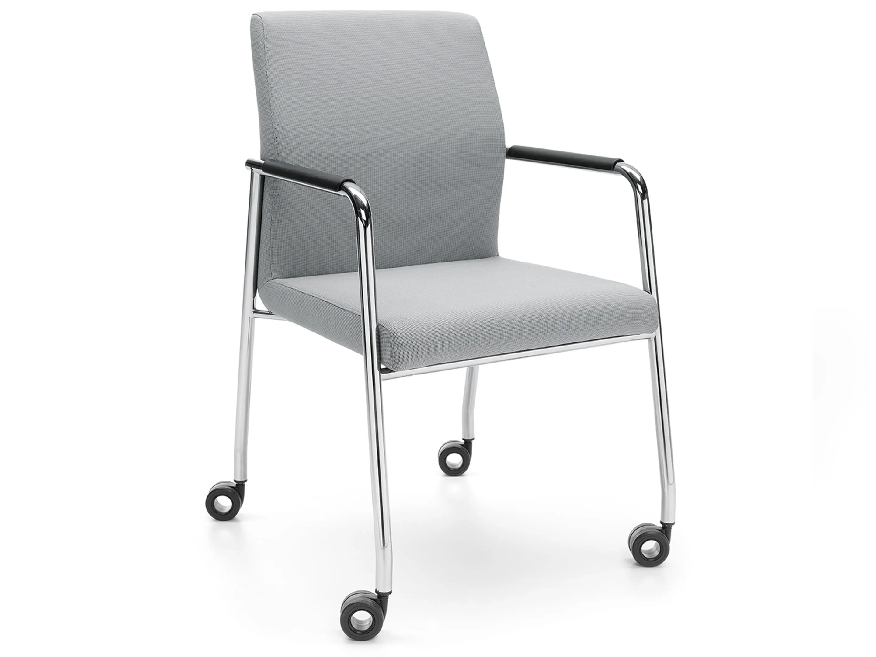Volledig gestoffeerde vergaderstoel met armleggers met beklede pad op een sledeframe. Stapelbaar.