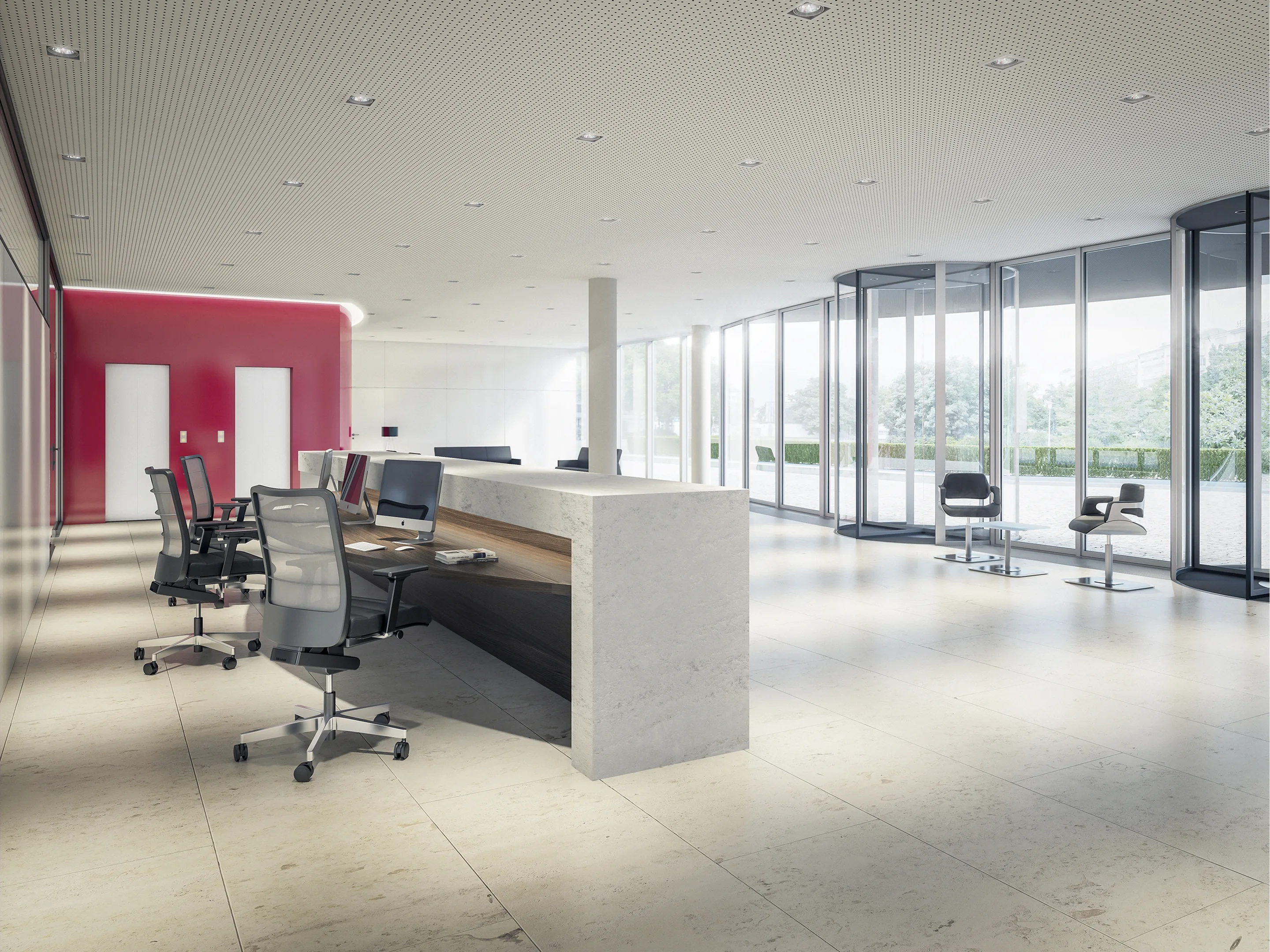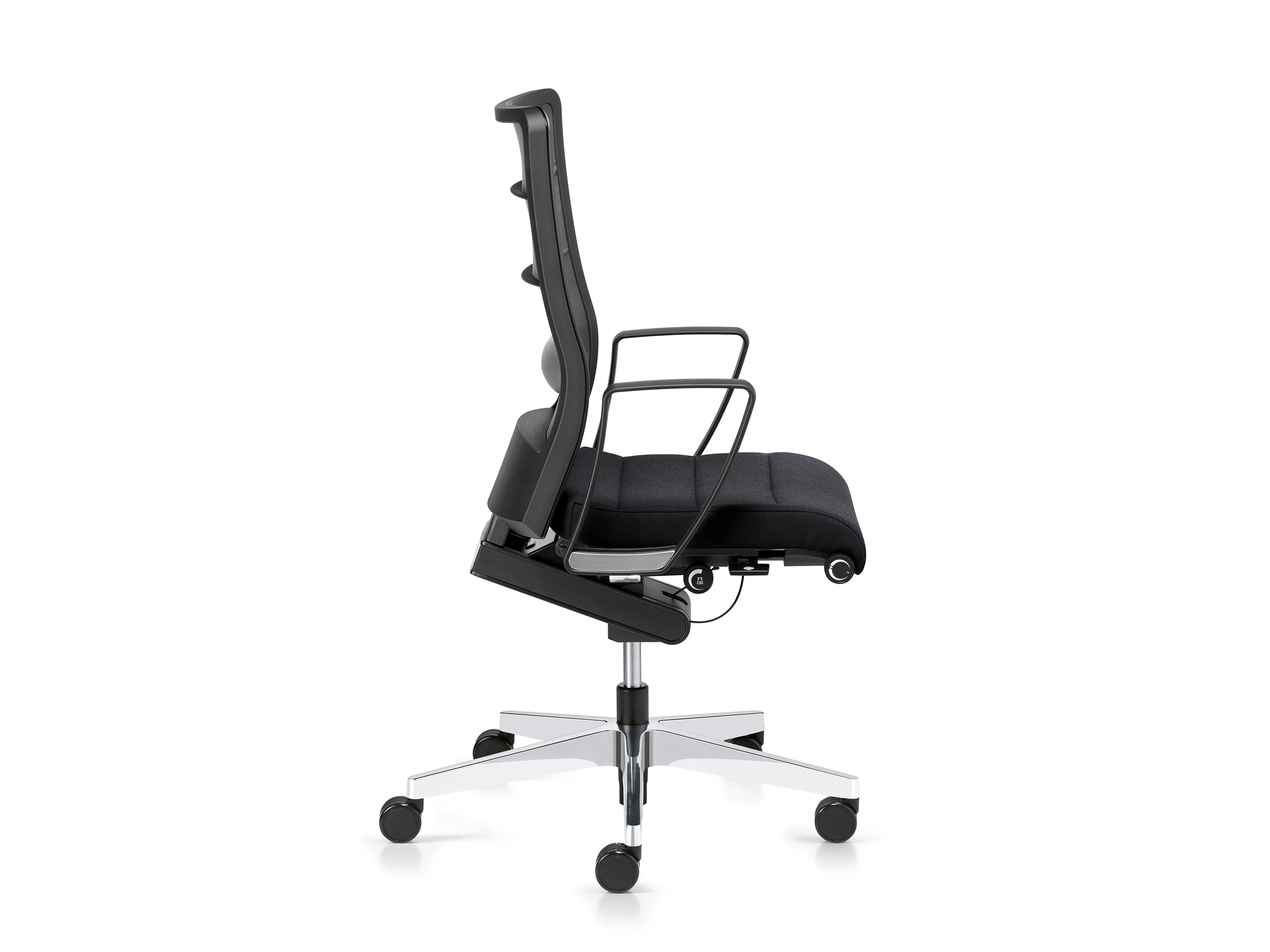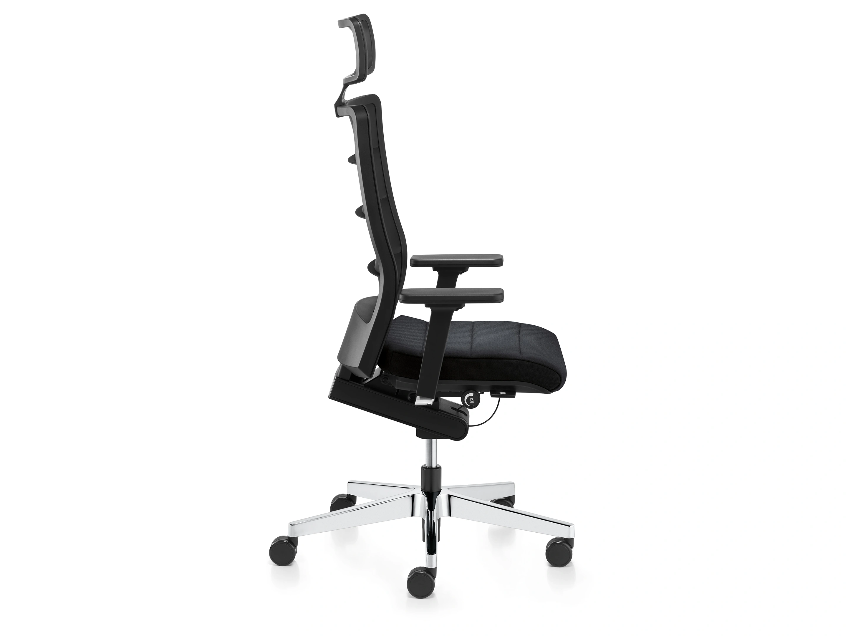 Bureaustoel met membraam (mesh) rugstoffering, Body-float synchroonmechaniek, gewichtsregeling traploosinstellbaar, zithoogte: 415-535mm, Rugleuning 5,5cm instelbaar, mechanische zitdieptevering, vaste hoofdsteun, standaard een kunststof voetkruis.
