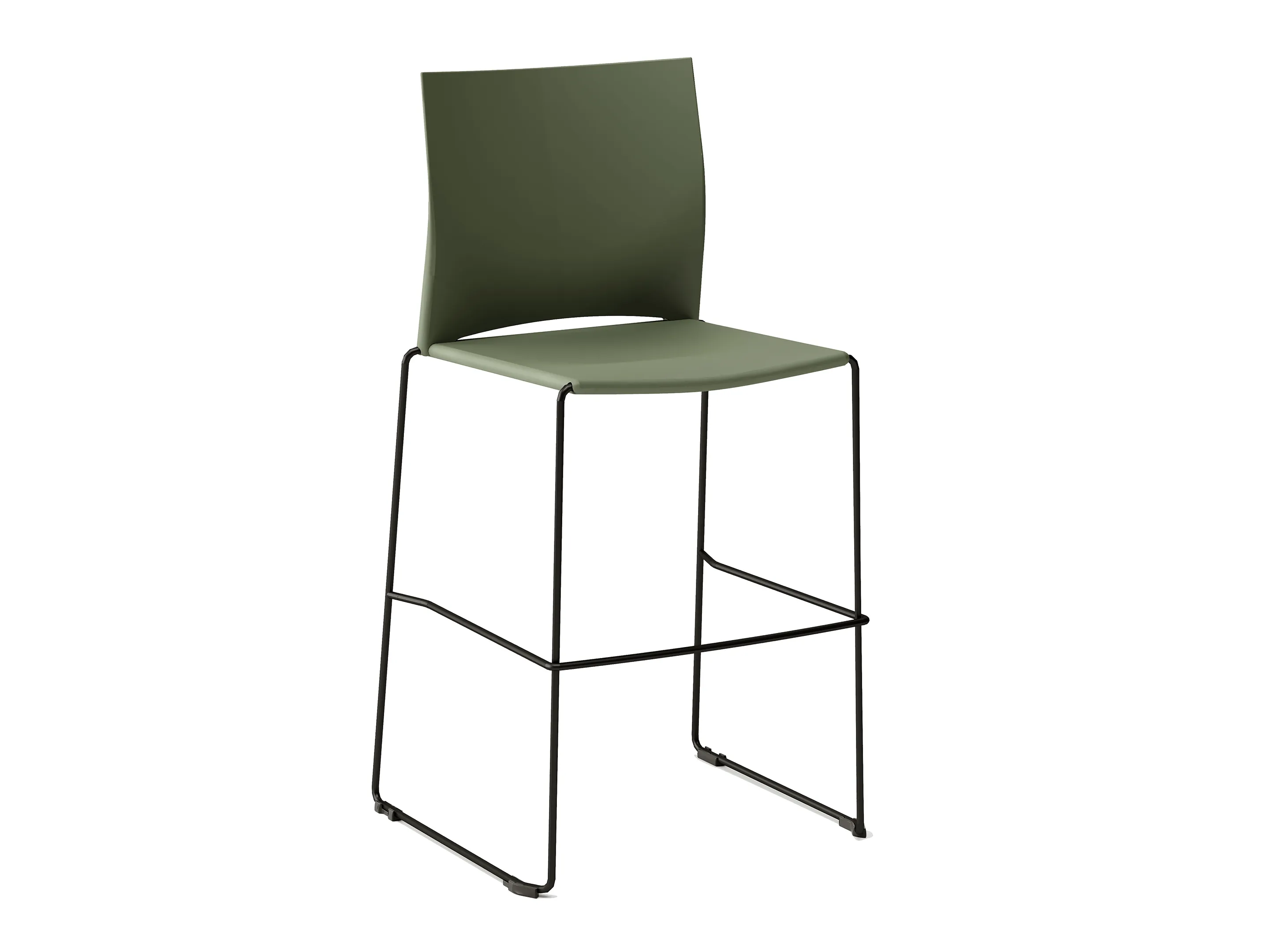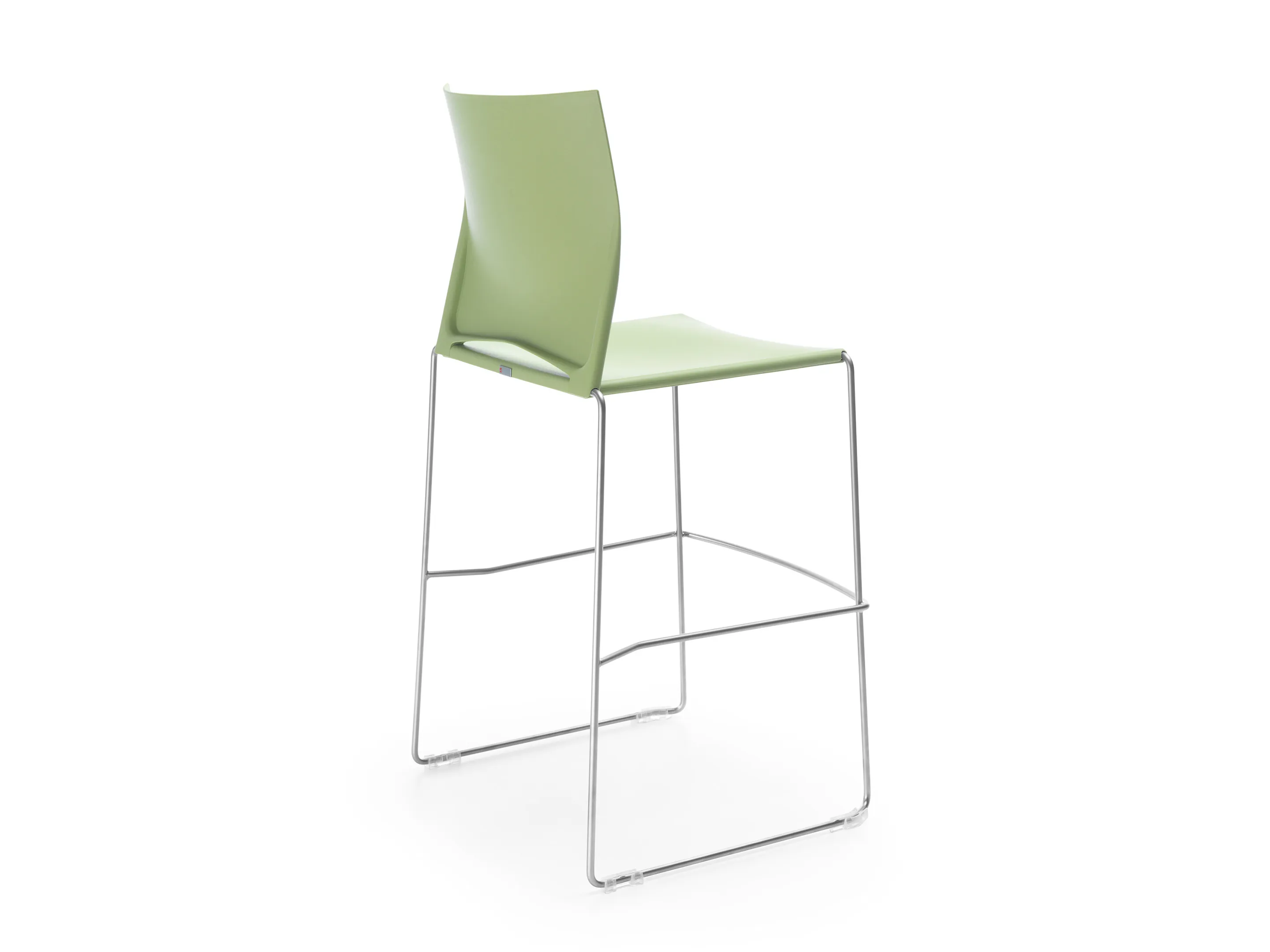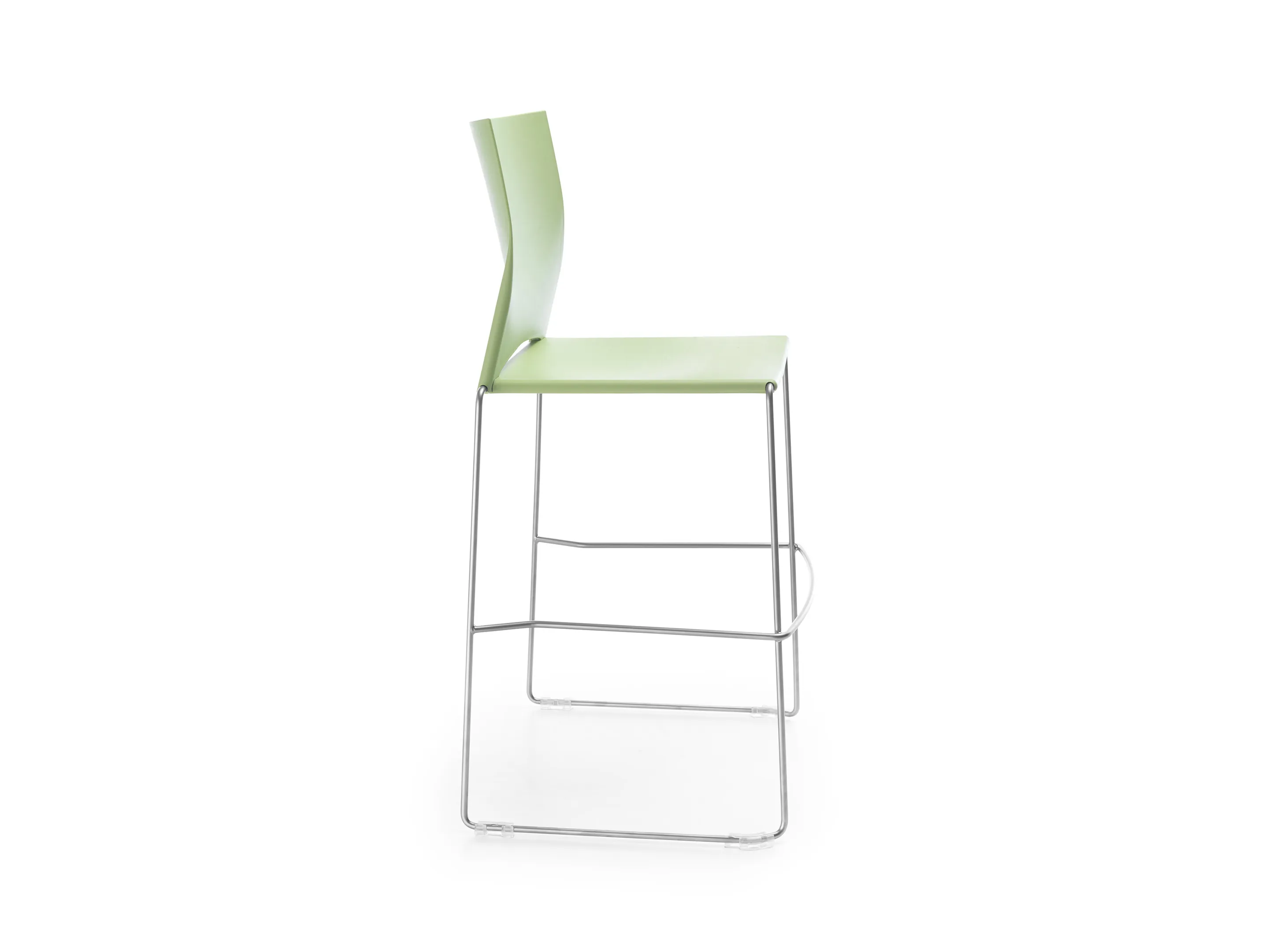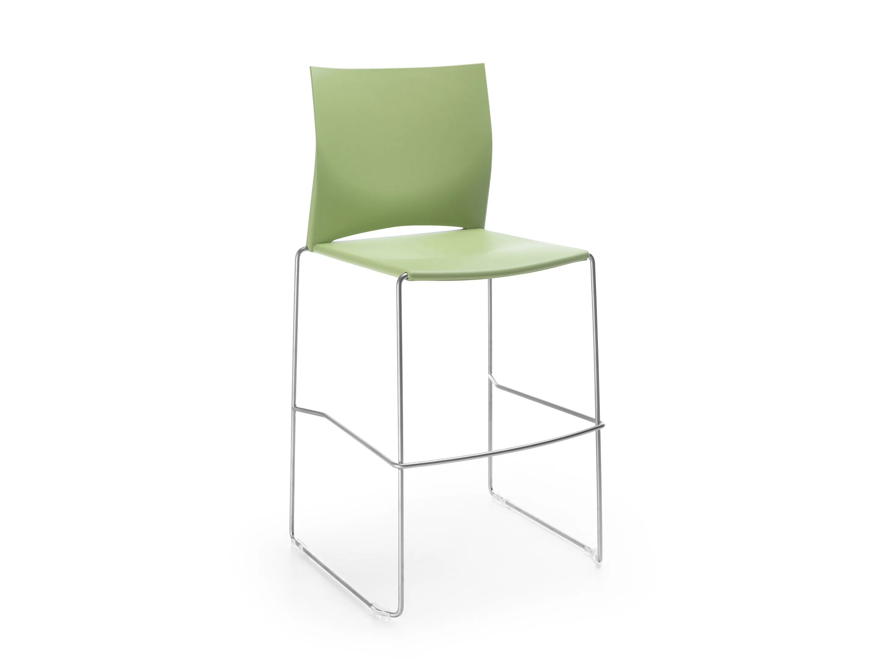 Barkruk met kunststof zitting en rugleuning op een sledeframe. Standaard zonder armleggers.