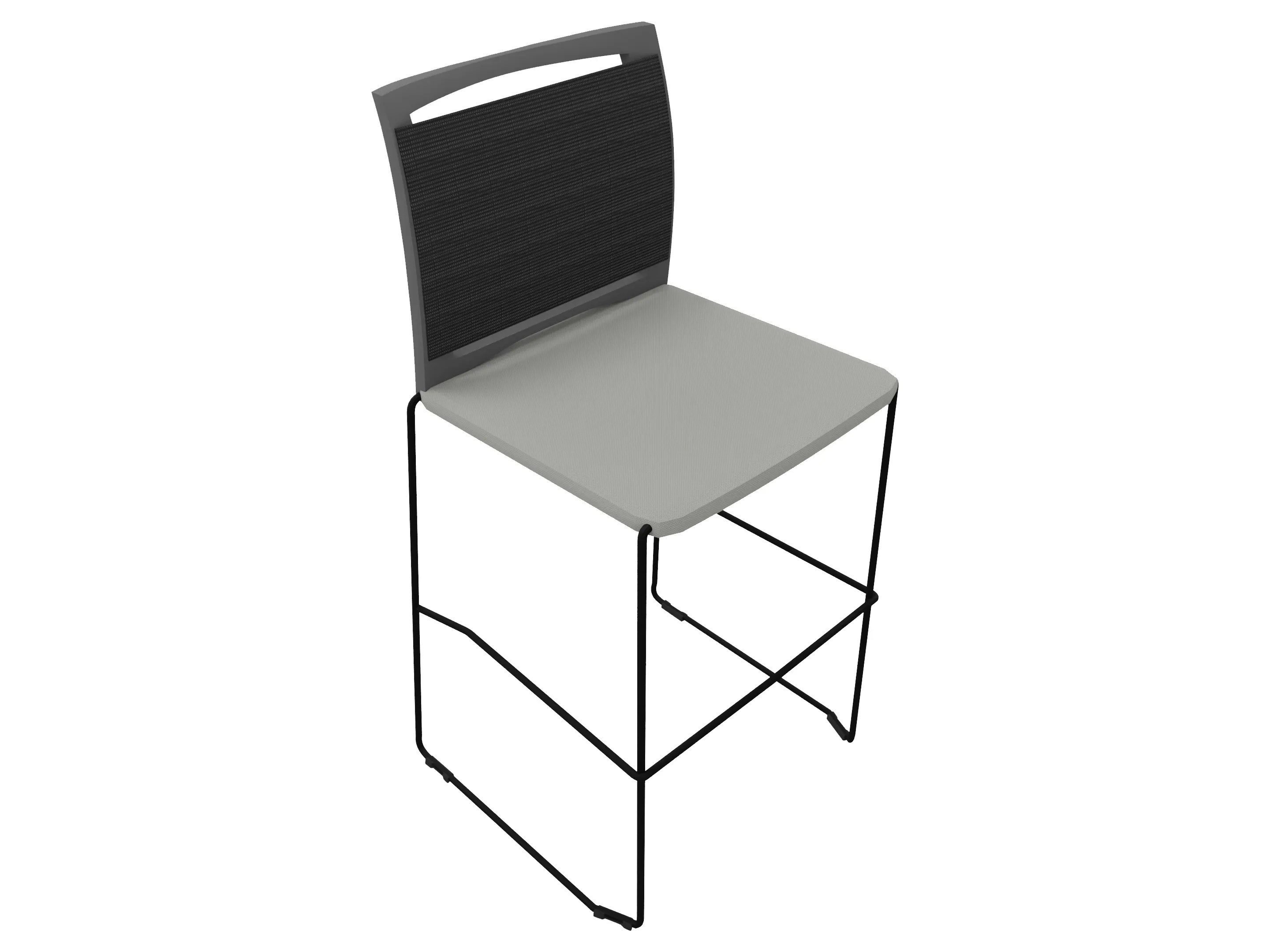 Barkruk met gestoffeerde zitting en mesh rugleuning op een sledeframe. Standaard zonder armleggers.