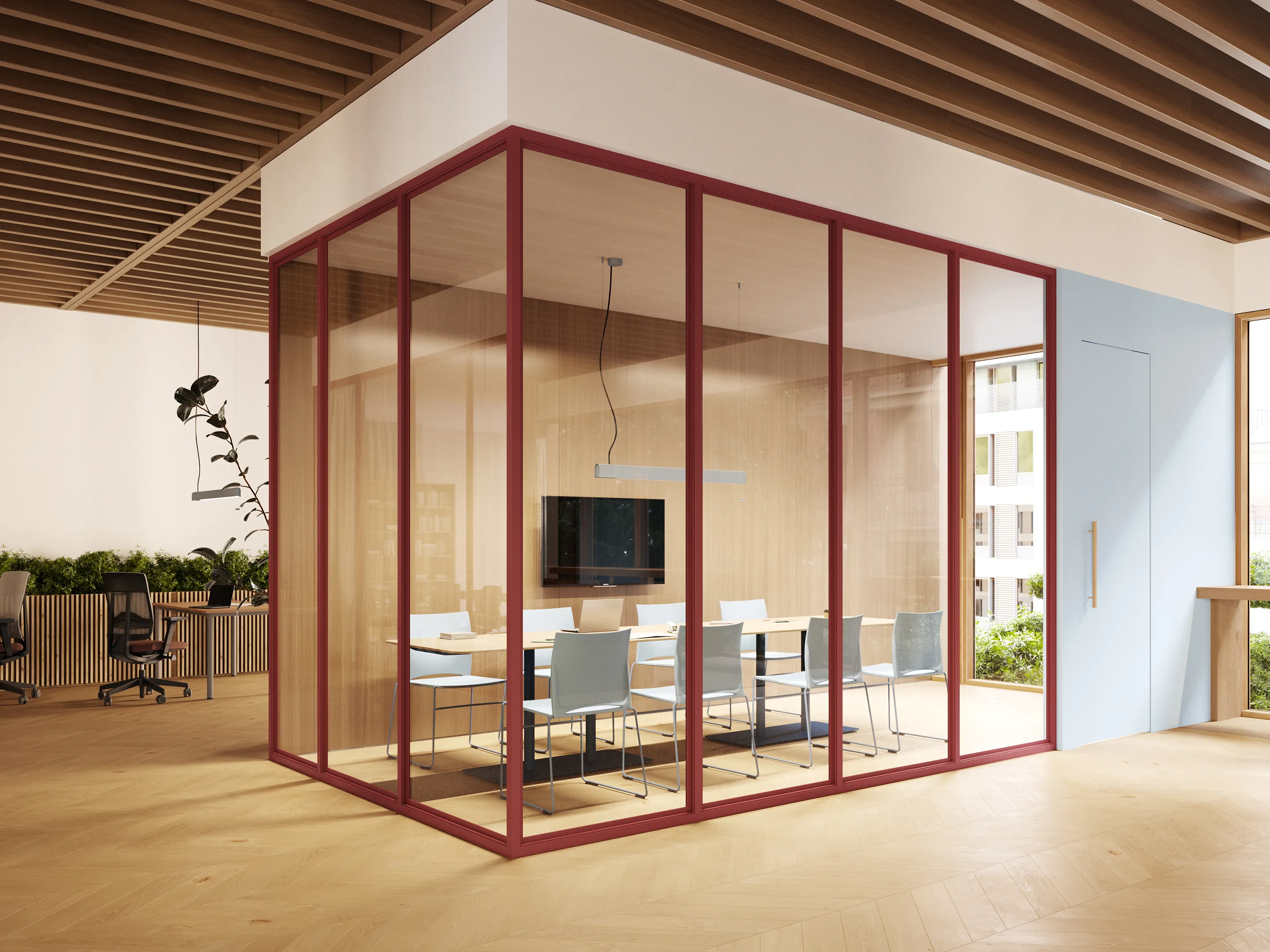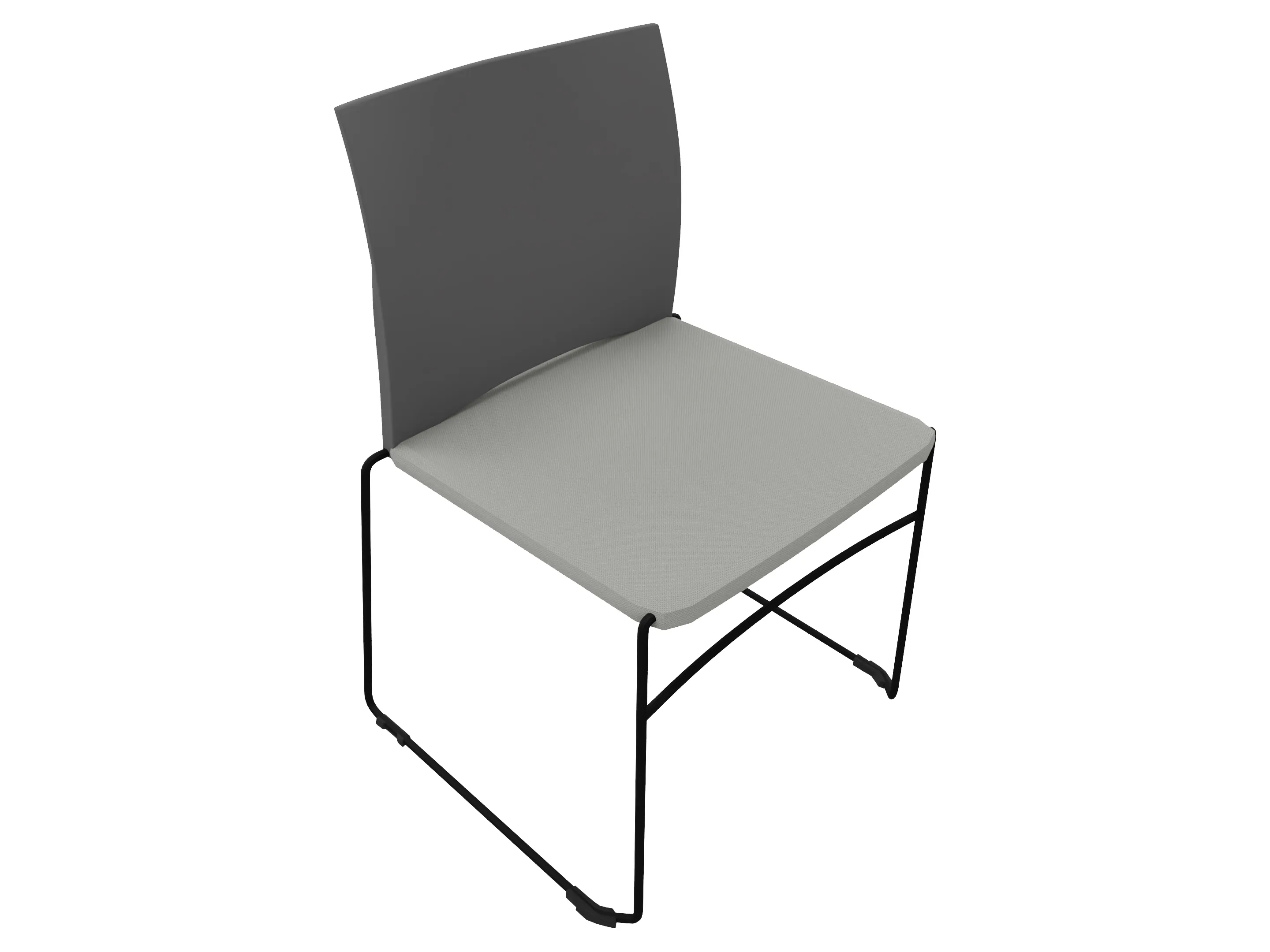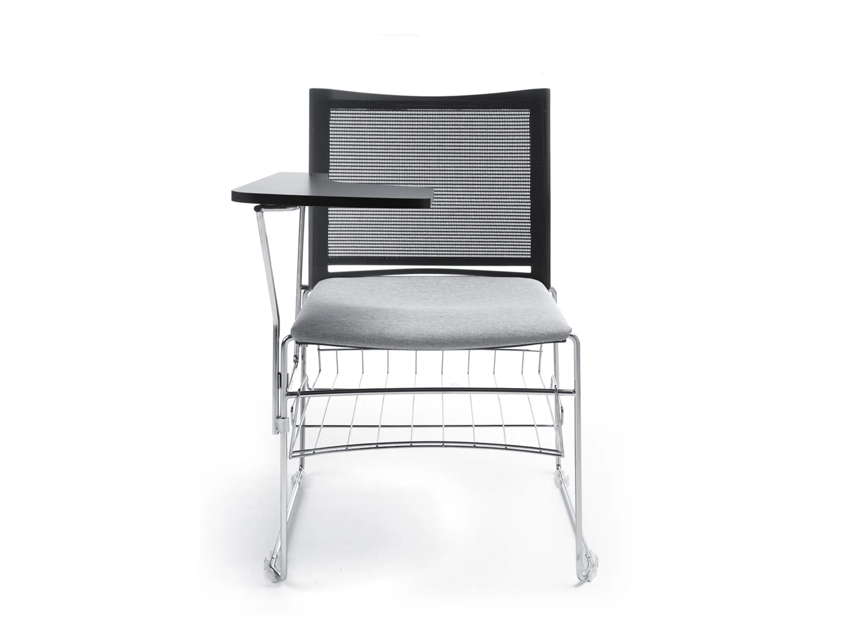 Bijzetstoel met gestoffeerde zitting en mesh rugleuning op een sledeframe. Stapelbaar tot 45 stuks op een transporttrolley. Standaard zonder armleggers.