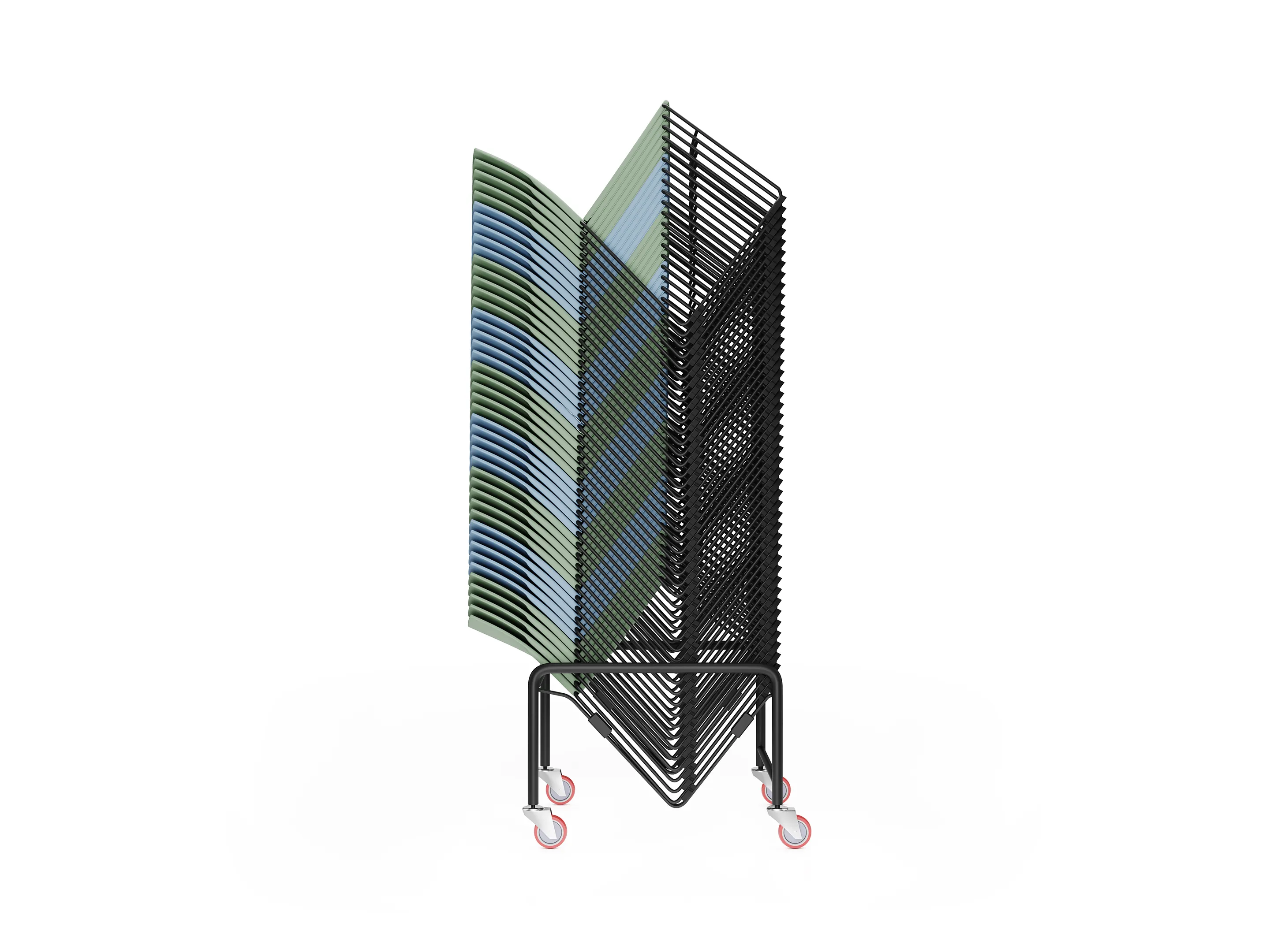 Bijzetstoel met kunststof zitting en mesh rugleuning op een sledeframe. Stapelbaar tot 45 stuks op een transporttrolley. Standaard zonder armleggers.
