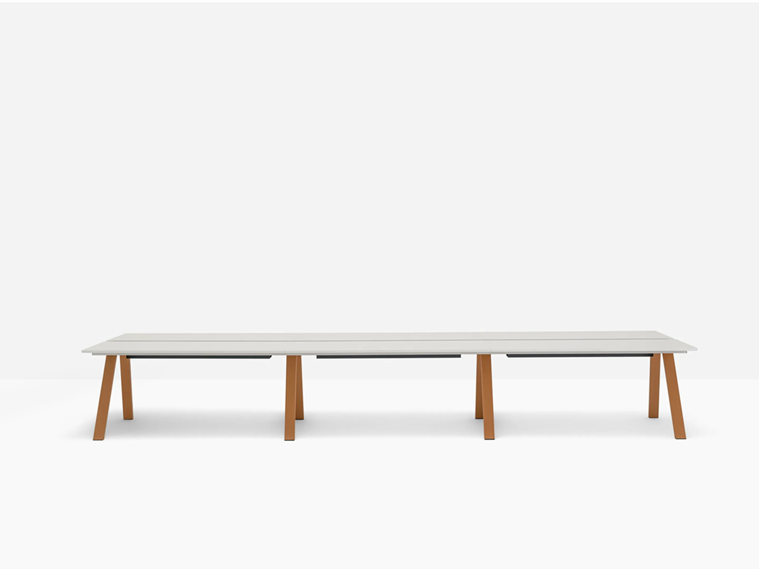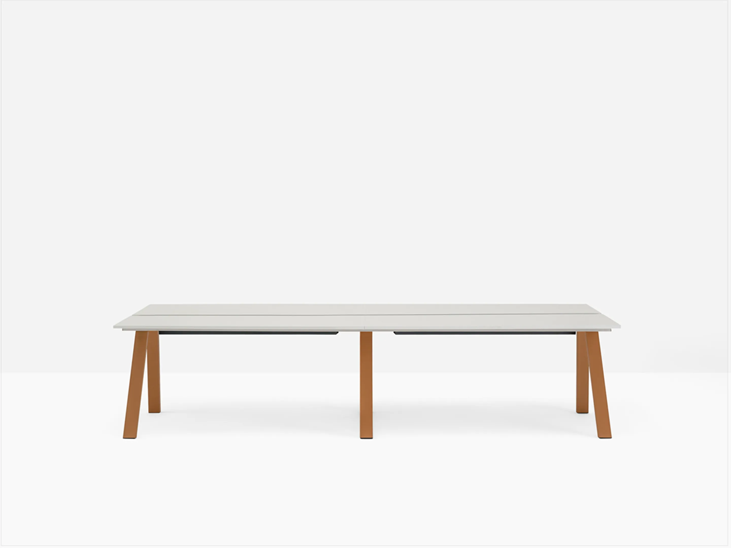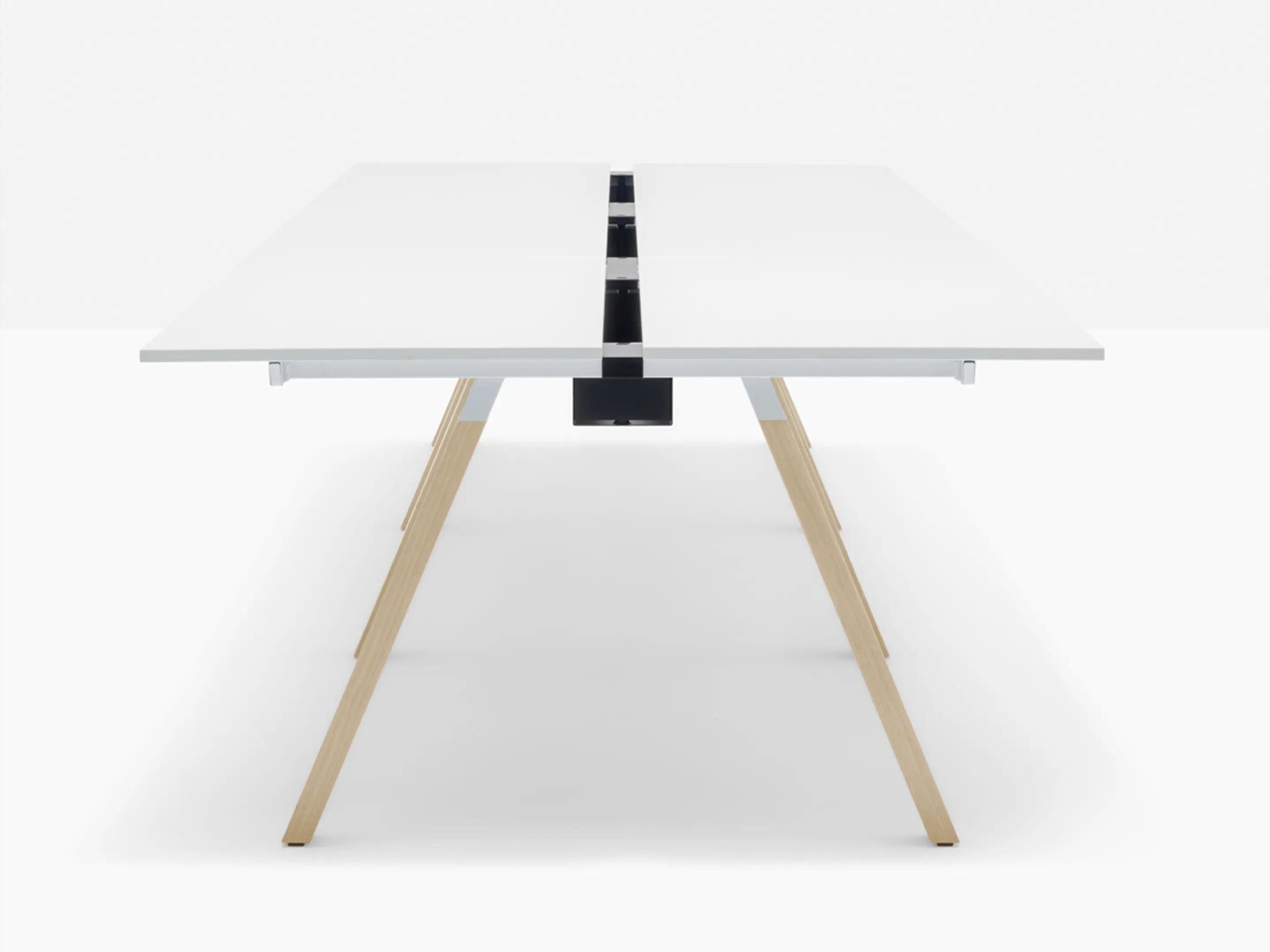 Werkstation met vier werkplekken met een breedte van 3180mm. Tussen afstand tussen de bladen is 60mm voor doorgang naar kabelmanagement (aan onderzijde gemonteerd).