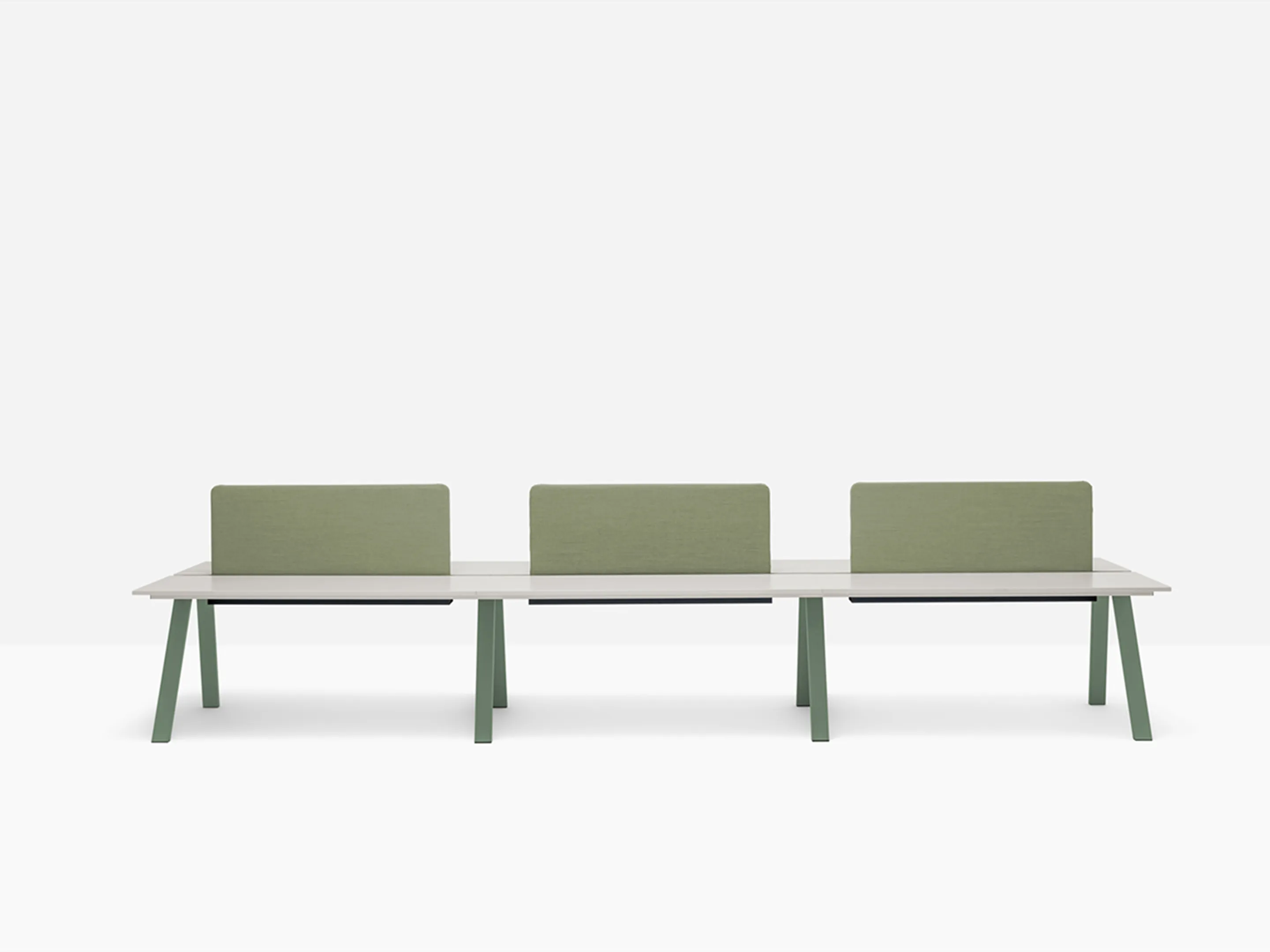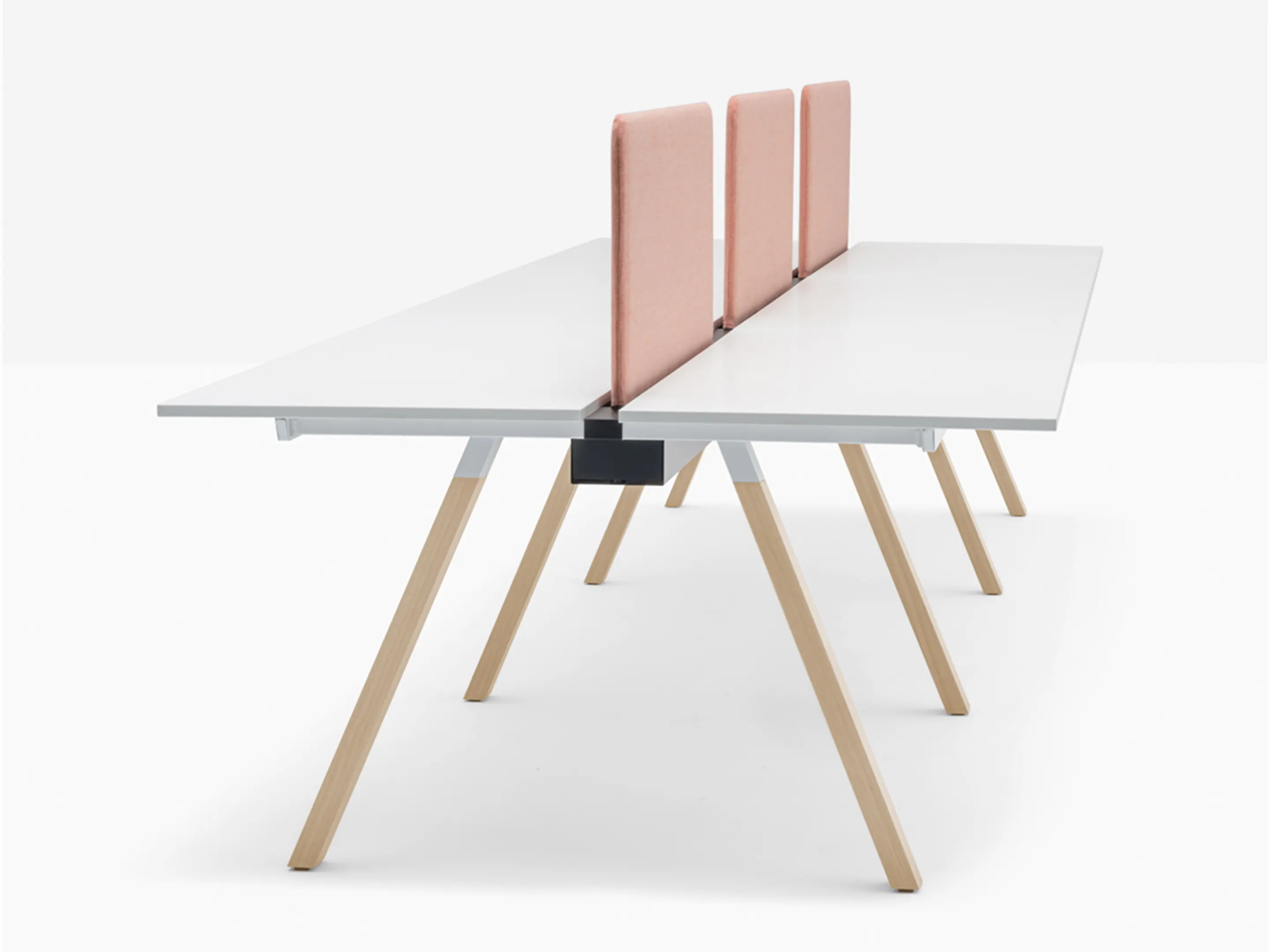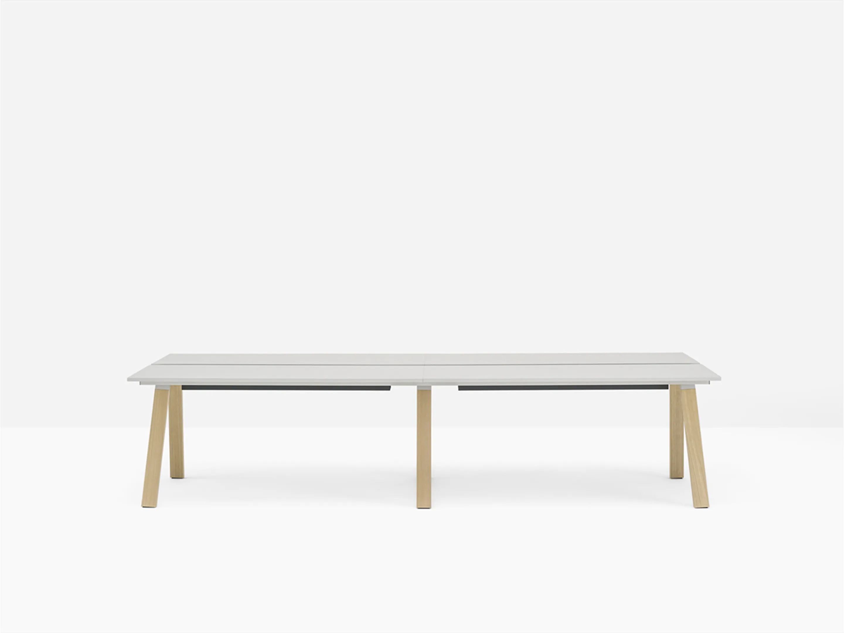 Werkstation met vier werkplekken met een breedte van 3180mm. Tussen afstand tussen de bladen is 60mm voor doorgang naar kabelmanagement (aan onderzijde gemonteerd).