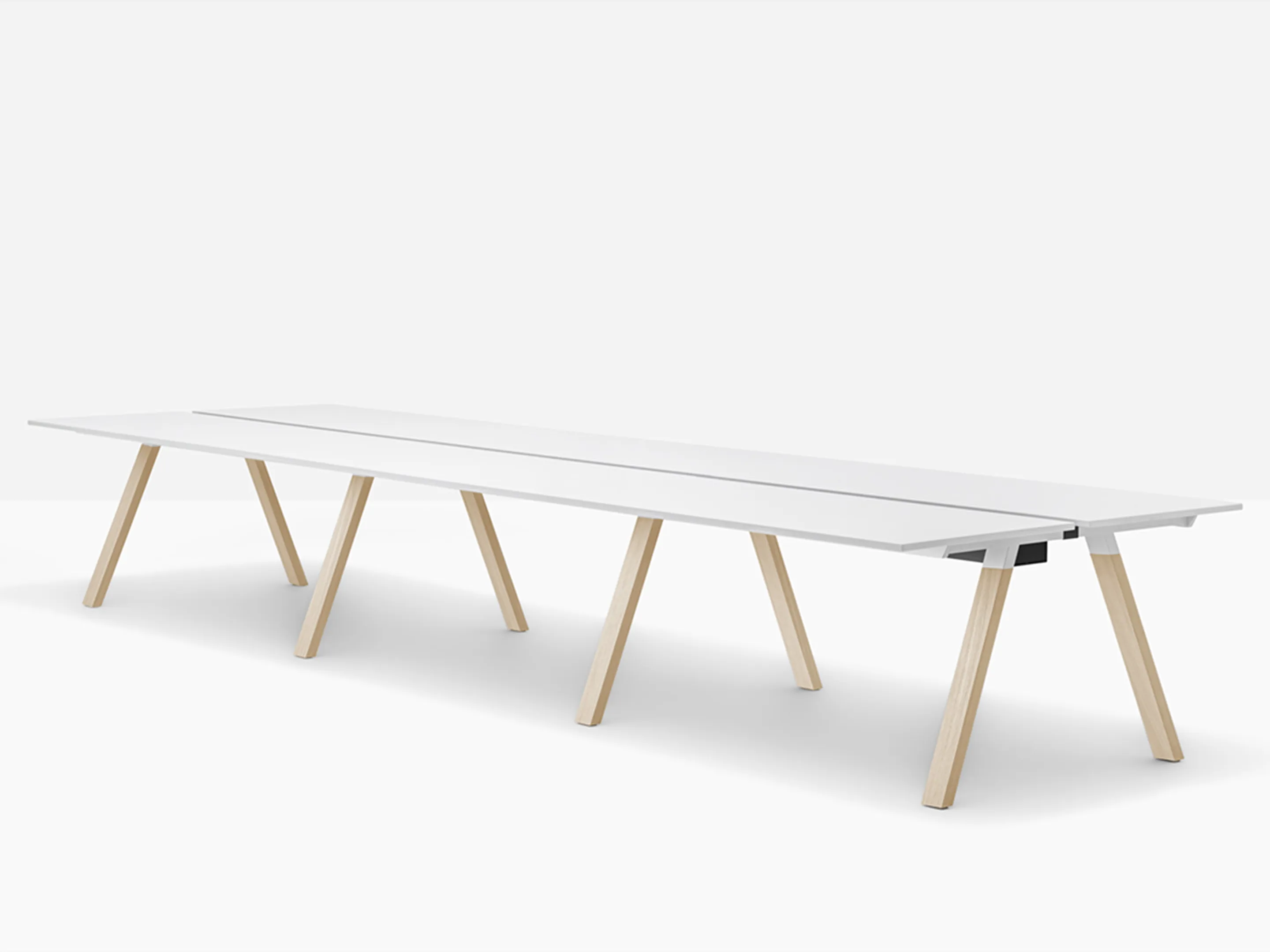 Werkstation met zes werkplekken met een breedte van 4770mm. Tussen afstand tussen de bladen is 60mm voor doorgang naar kabelmanagement (aan onderzijde gemonteerd).