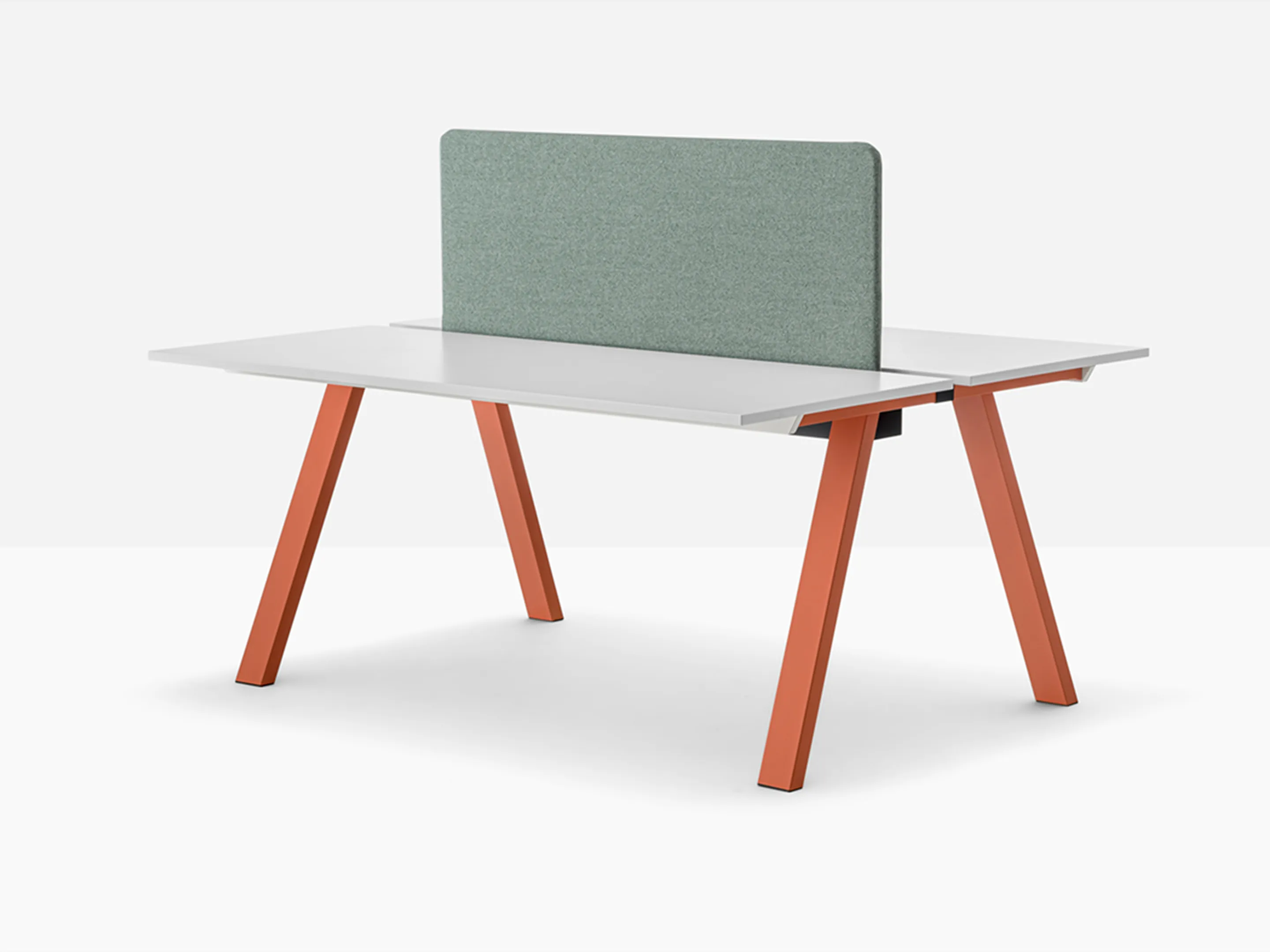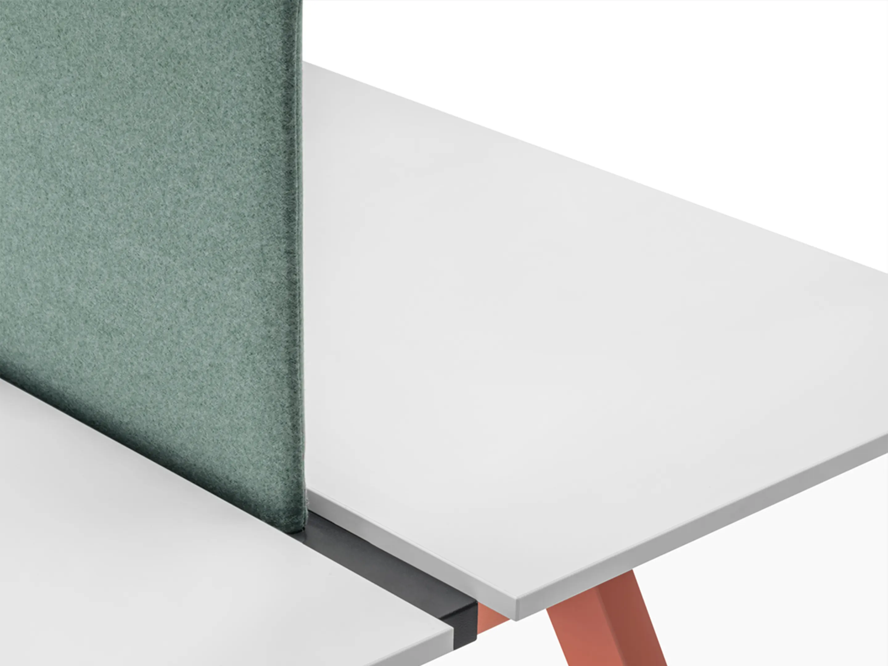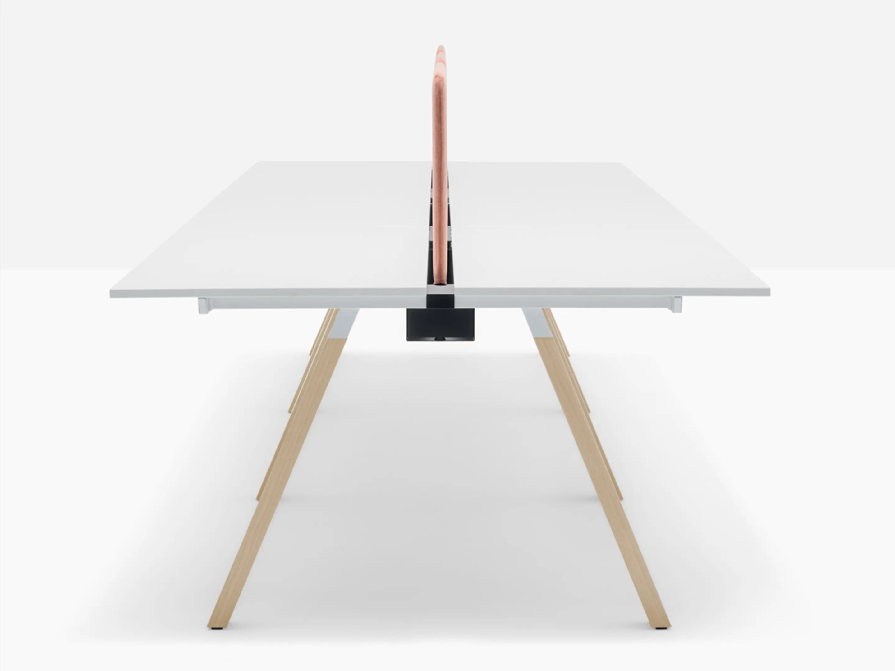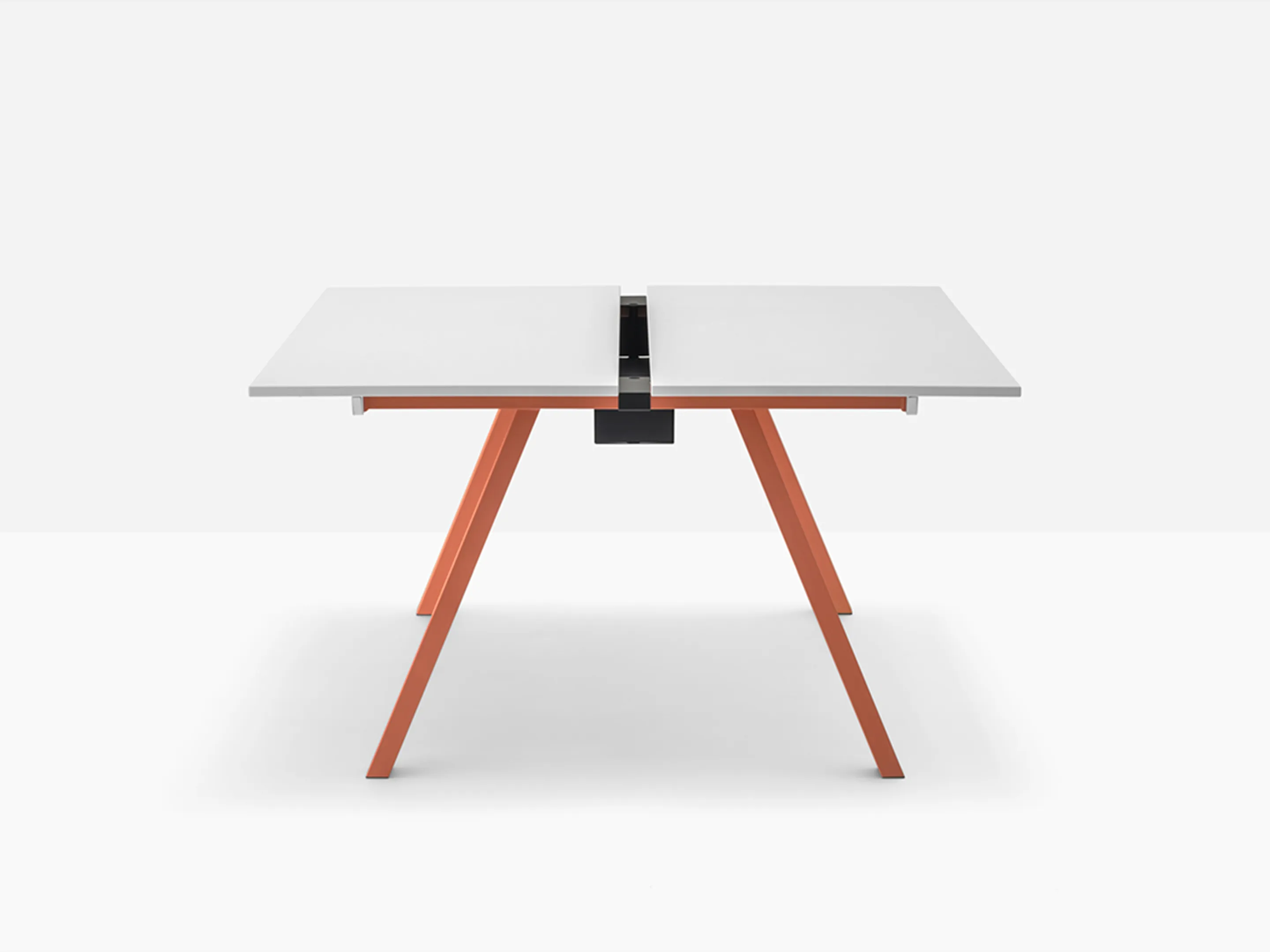 Werkstation met twee werkplekken met een breedte van 1590mm. Tussen afstand tussen de bladen is 60mm voor doorgang naar kabelmanagement (aan onderzijde gemonteerd).