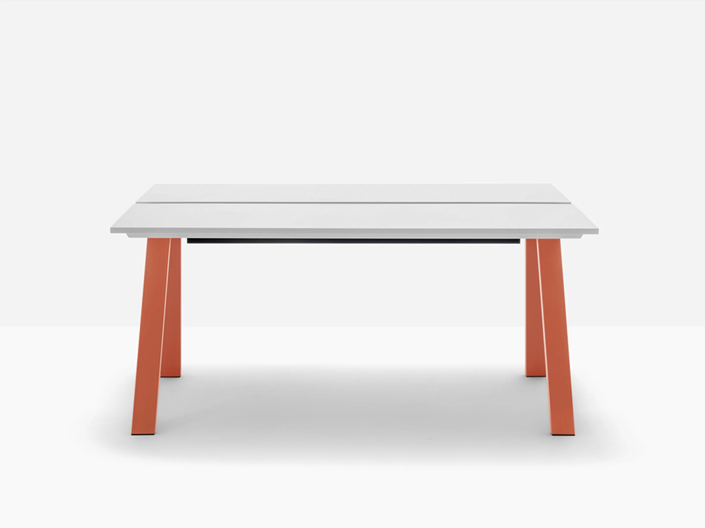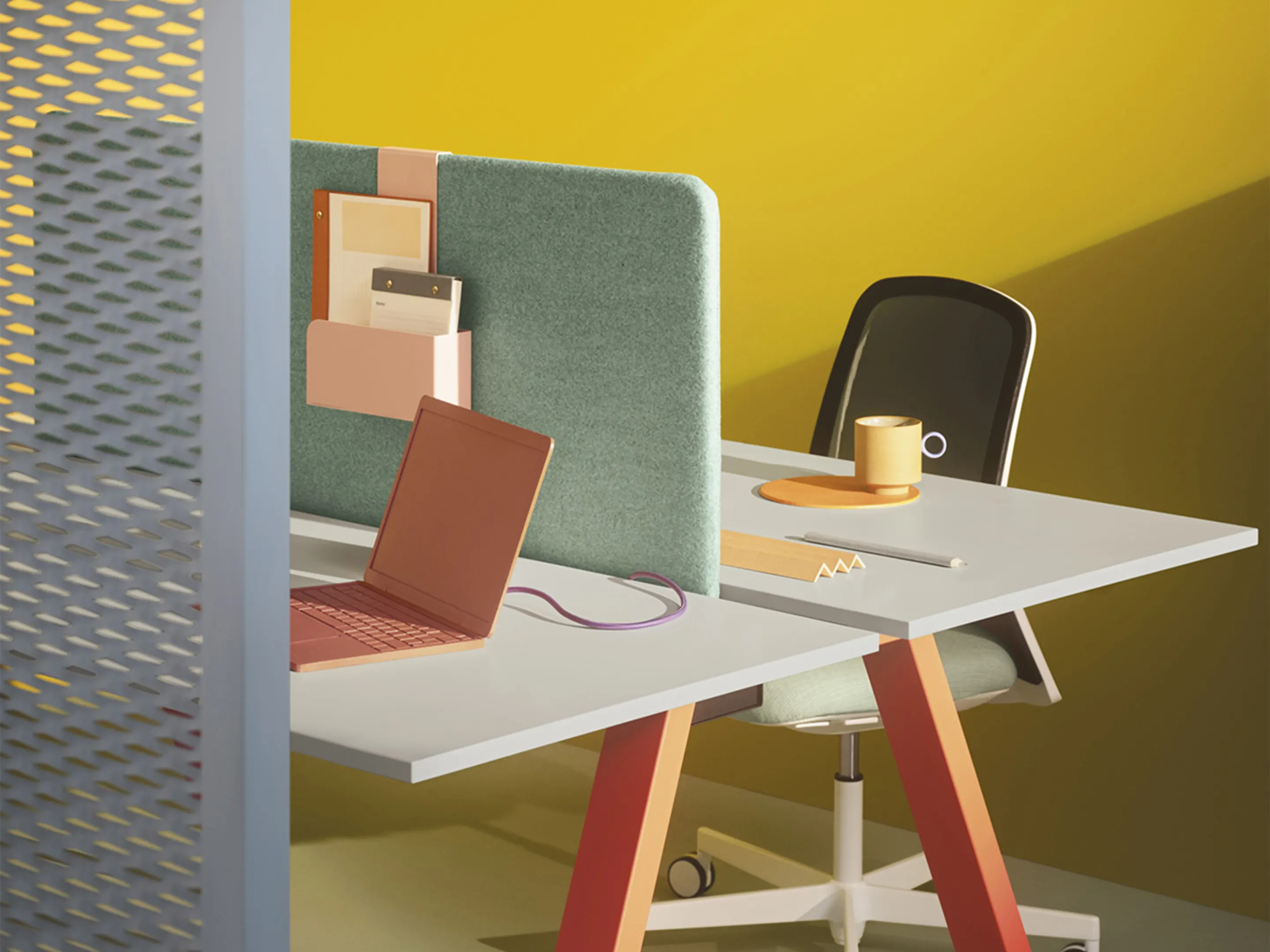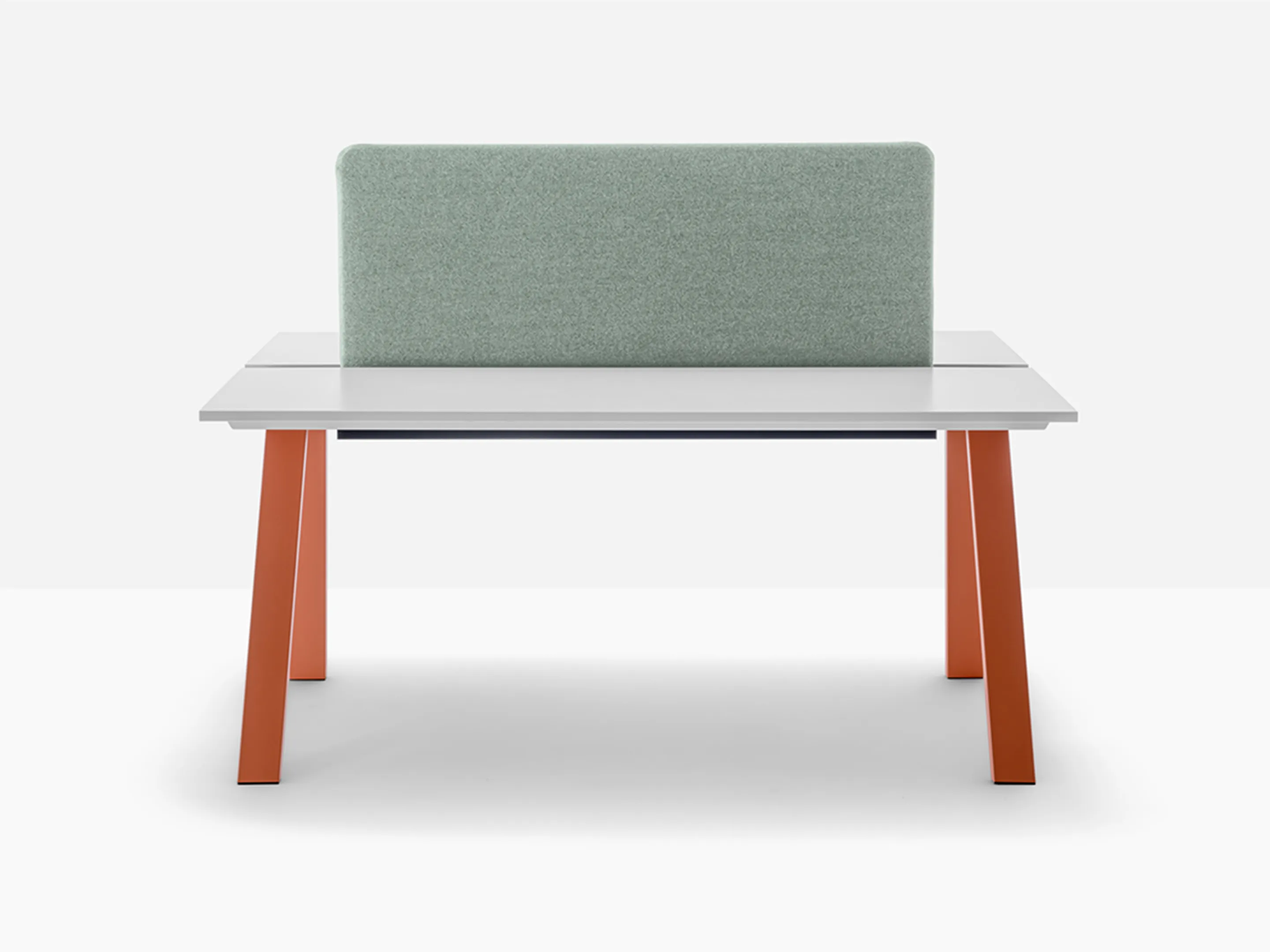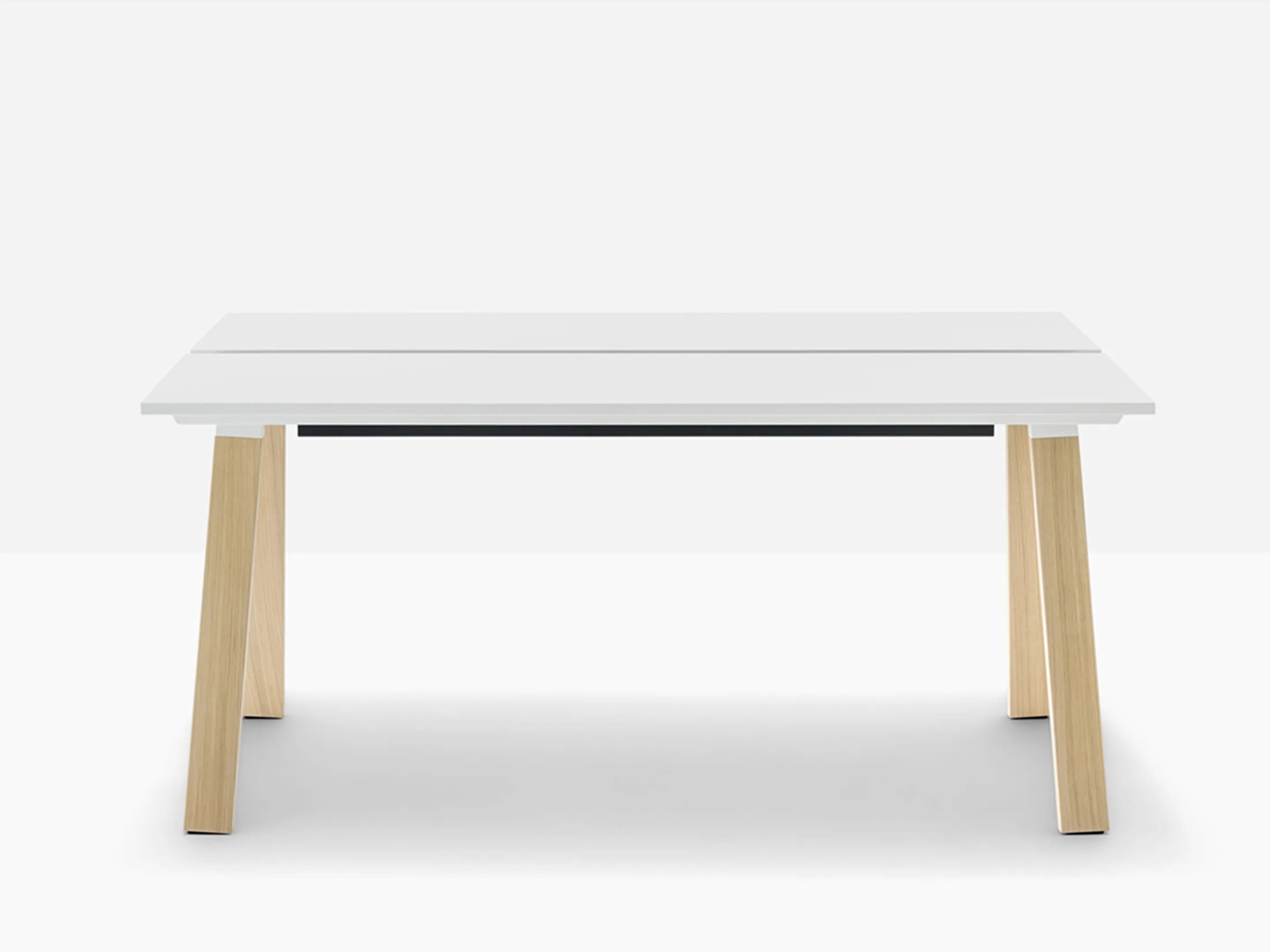 Werkstation met twee werkplekken met een breedte van 1590mm. Tussen afstand tussen de bladen is 60mm voor doorgang naar kabelmanagement (aan onderzijde gemonteerd).