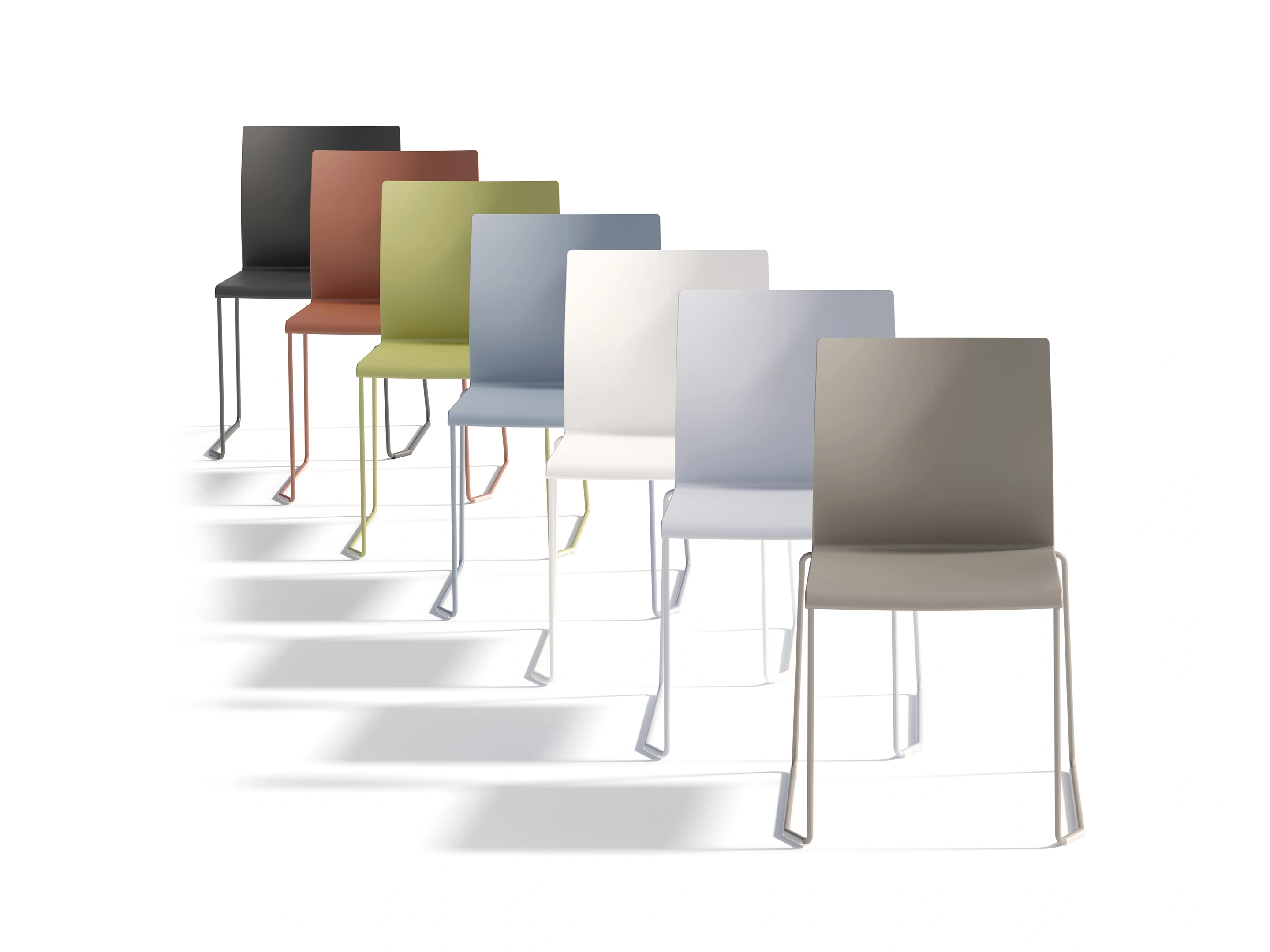 Stapelbaar kantinestoel met een 100% recyclebare, volledige kunststof kuip op een sledeframe, exclusief armleggers. Frame leverbaar in zwart, wit of chroom, aangeven bij bestelling!