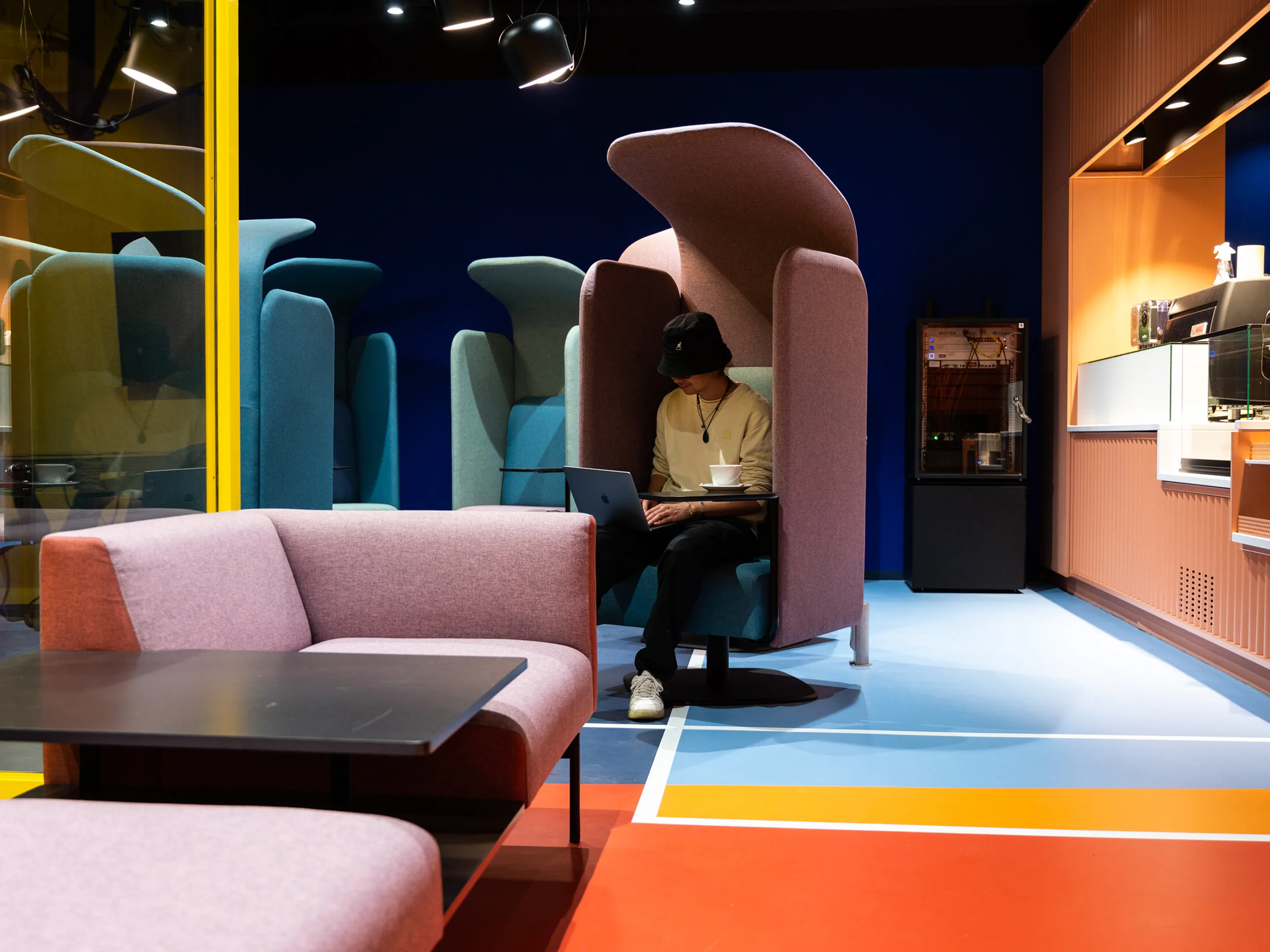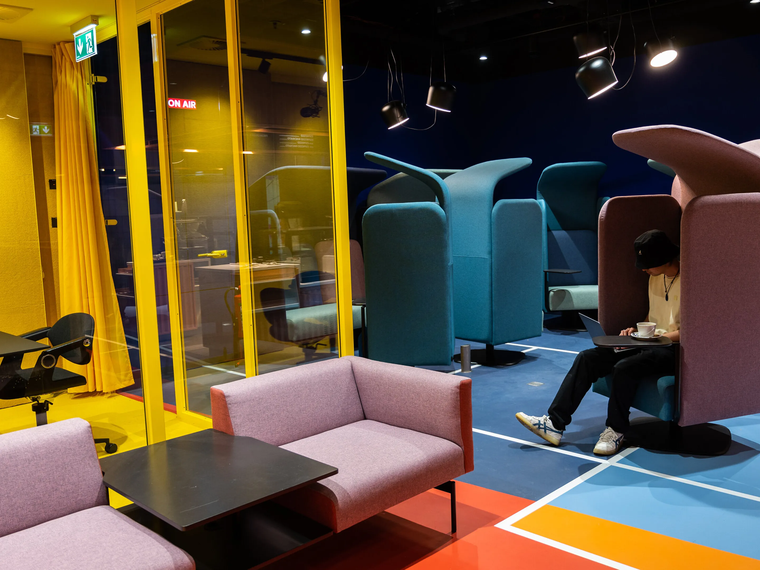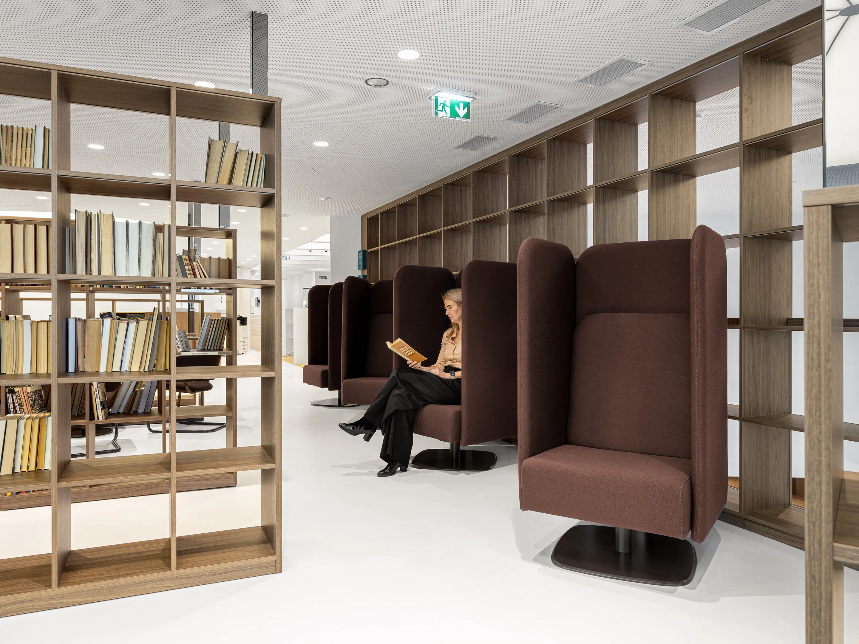 Volledig gestoffeerde 1-zits bank met hoge akoestische ombouw aan de zijkanten en achterkant op een 360° draaibaar onderstel. 780 x 750 x 1080mm (B x D x H).
