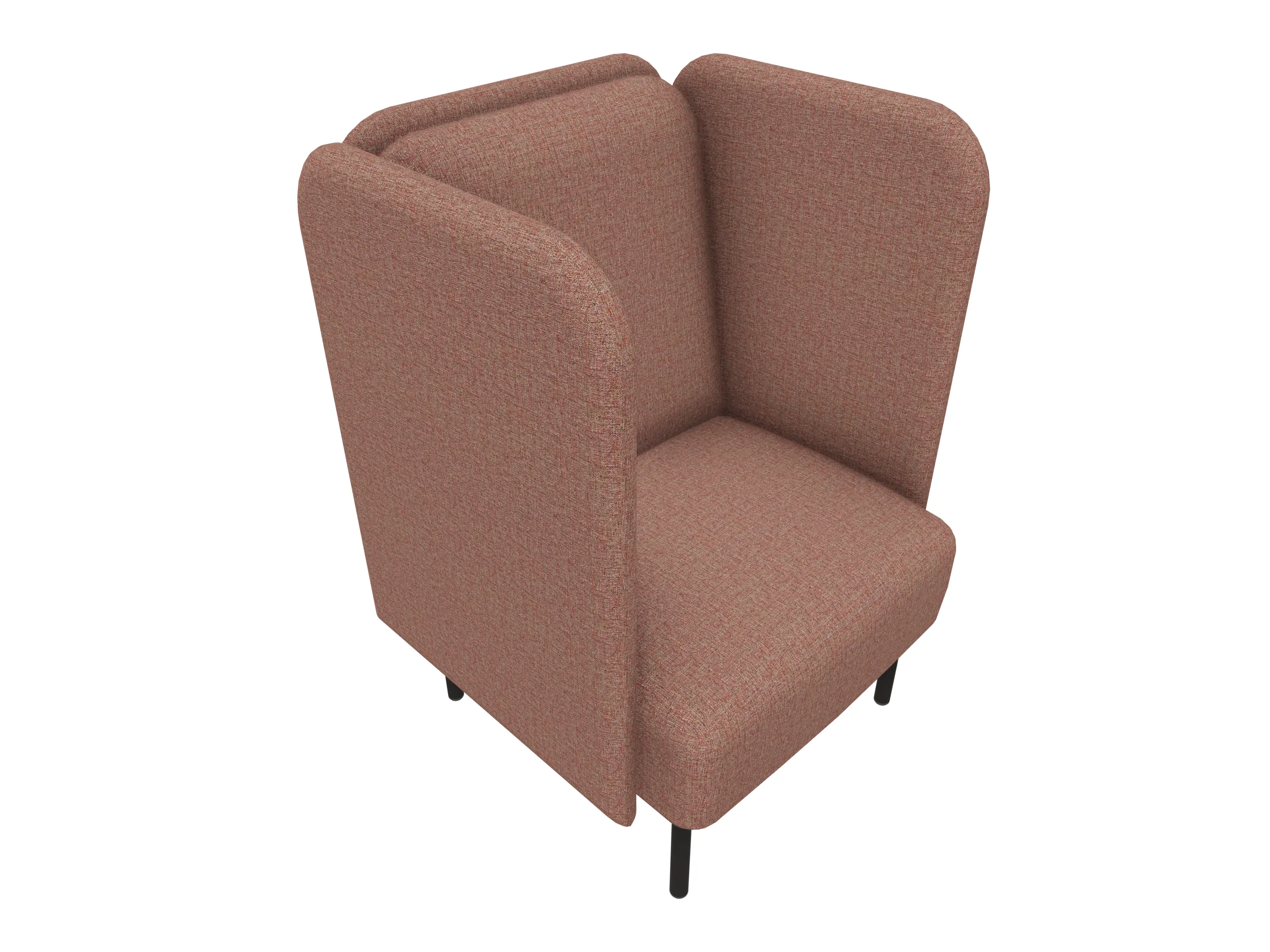 Volledig gestoffeerde 1-zits bank met hoge akoestische ombouw aan de zijkanten en achterkant op een 4-poots onderstel. 780 x 750 x 1080mm (B x D x H).