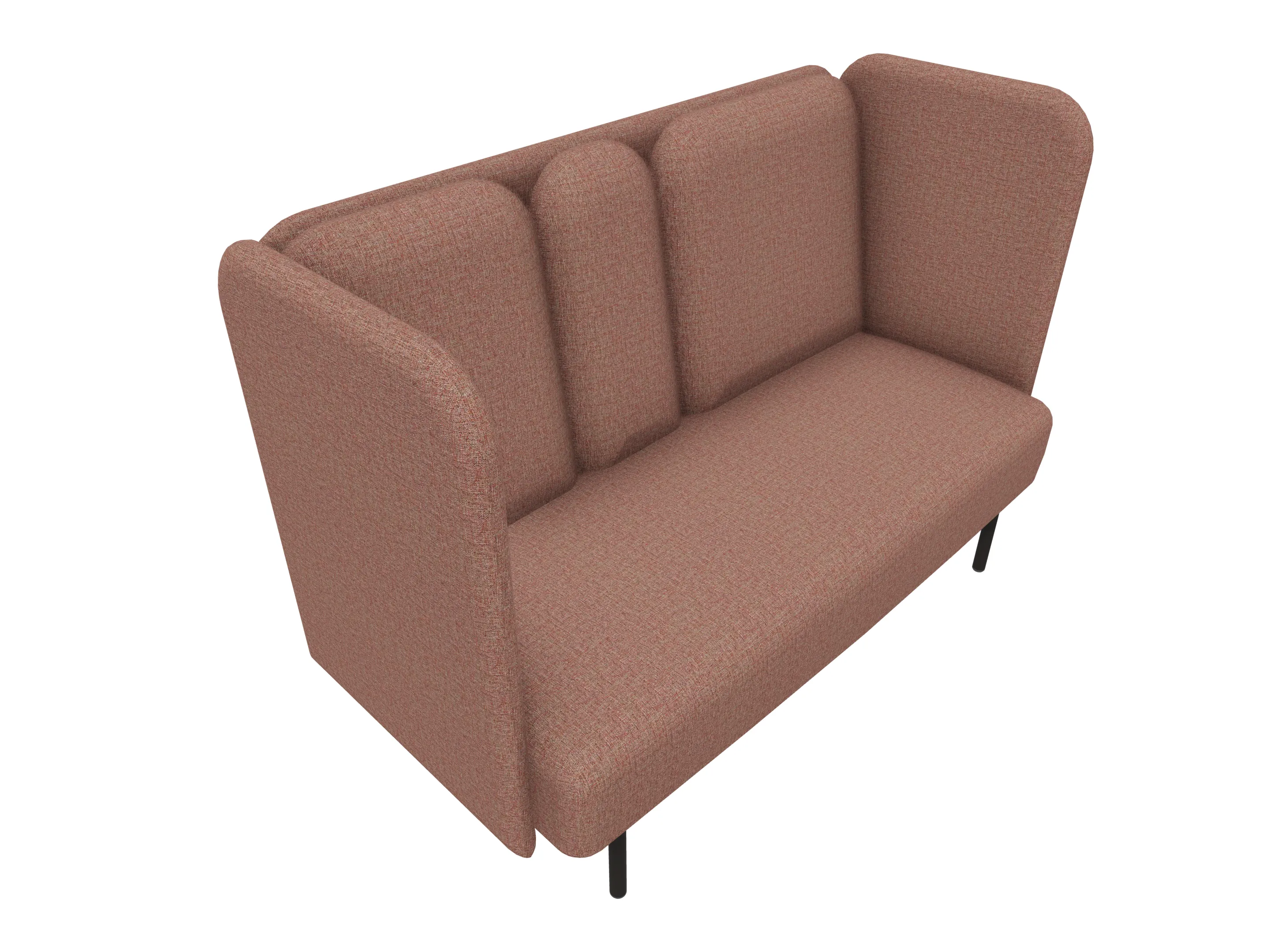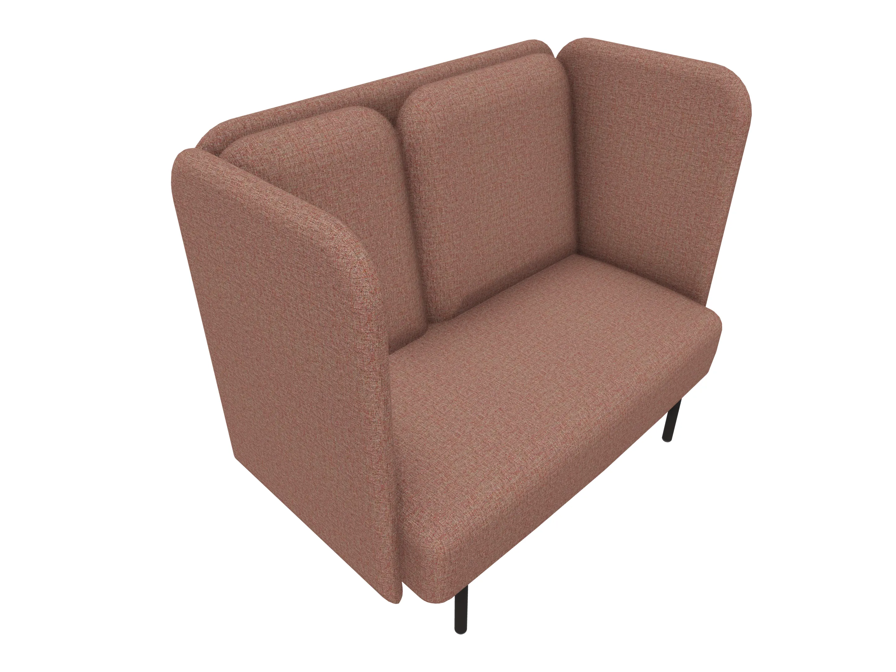 Volledig gestoffeerde 2-zits bank met hoge akoestische ombouw aan de zijkanten en achterkant op een 4-poots onderstel. 1280 x 750 x 1080mm (B x D x H).