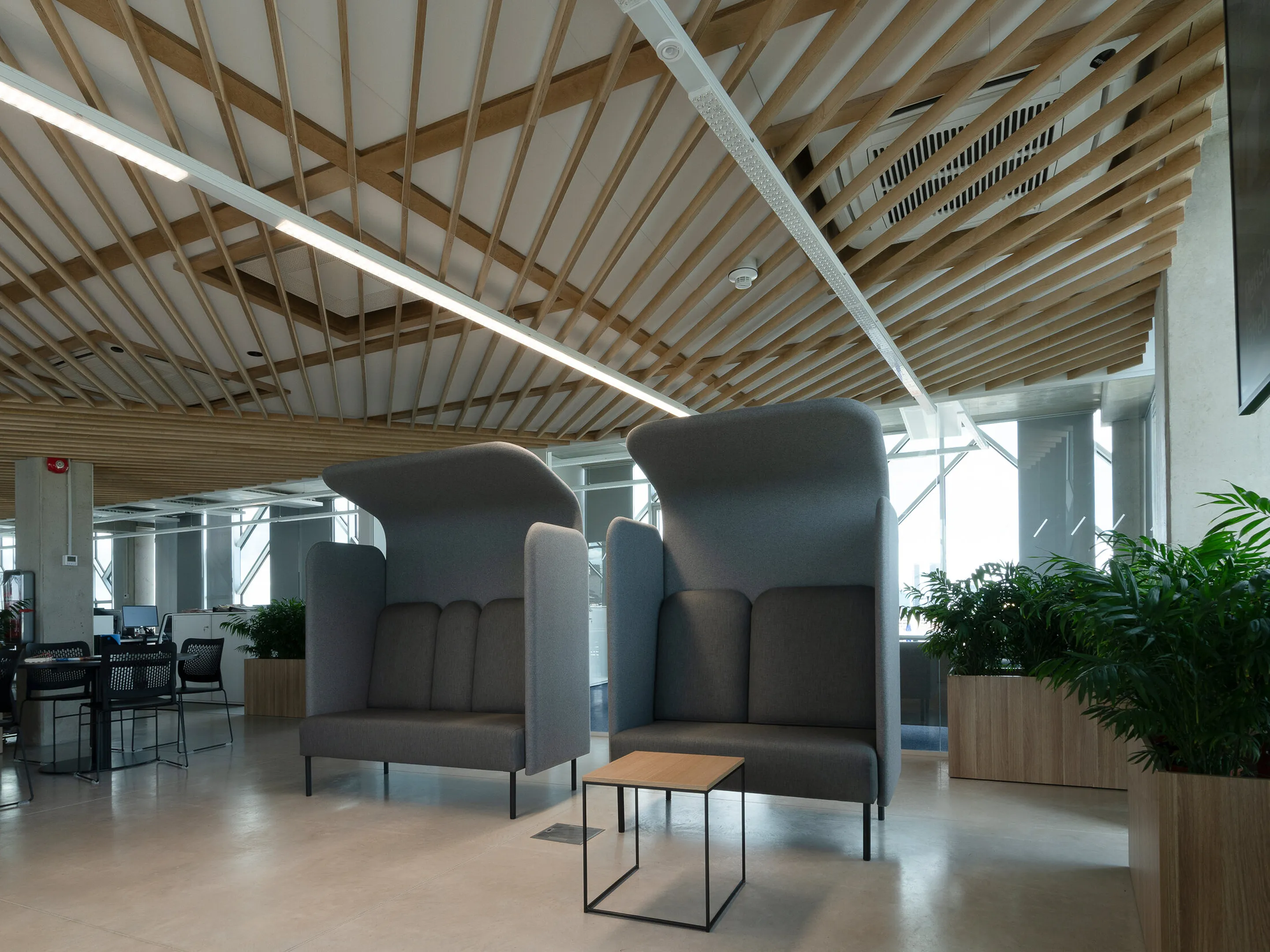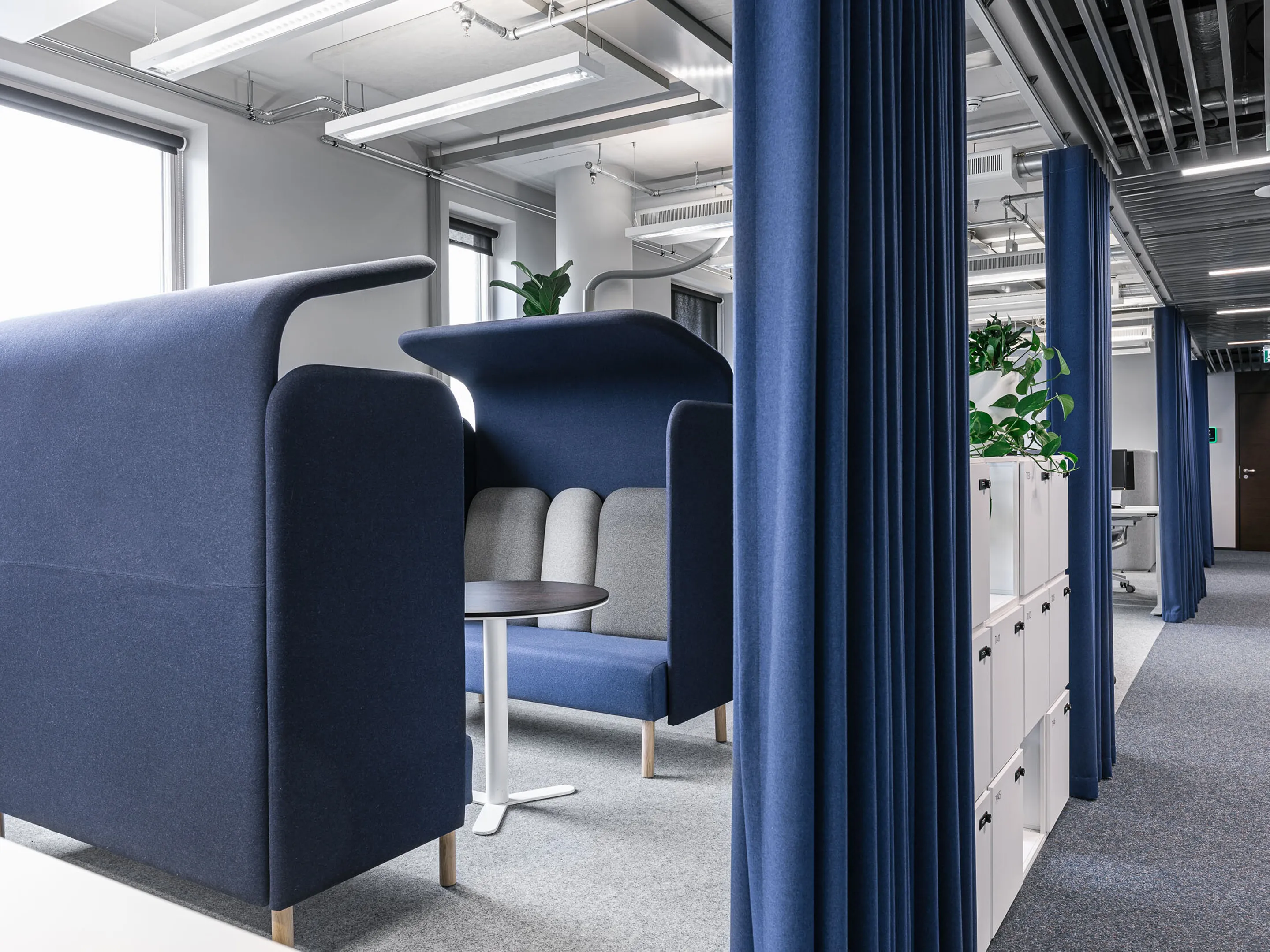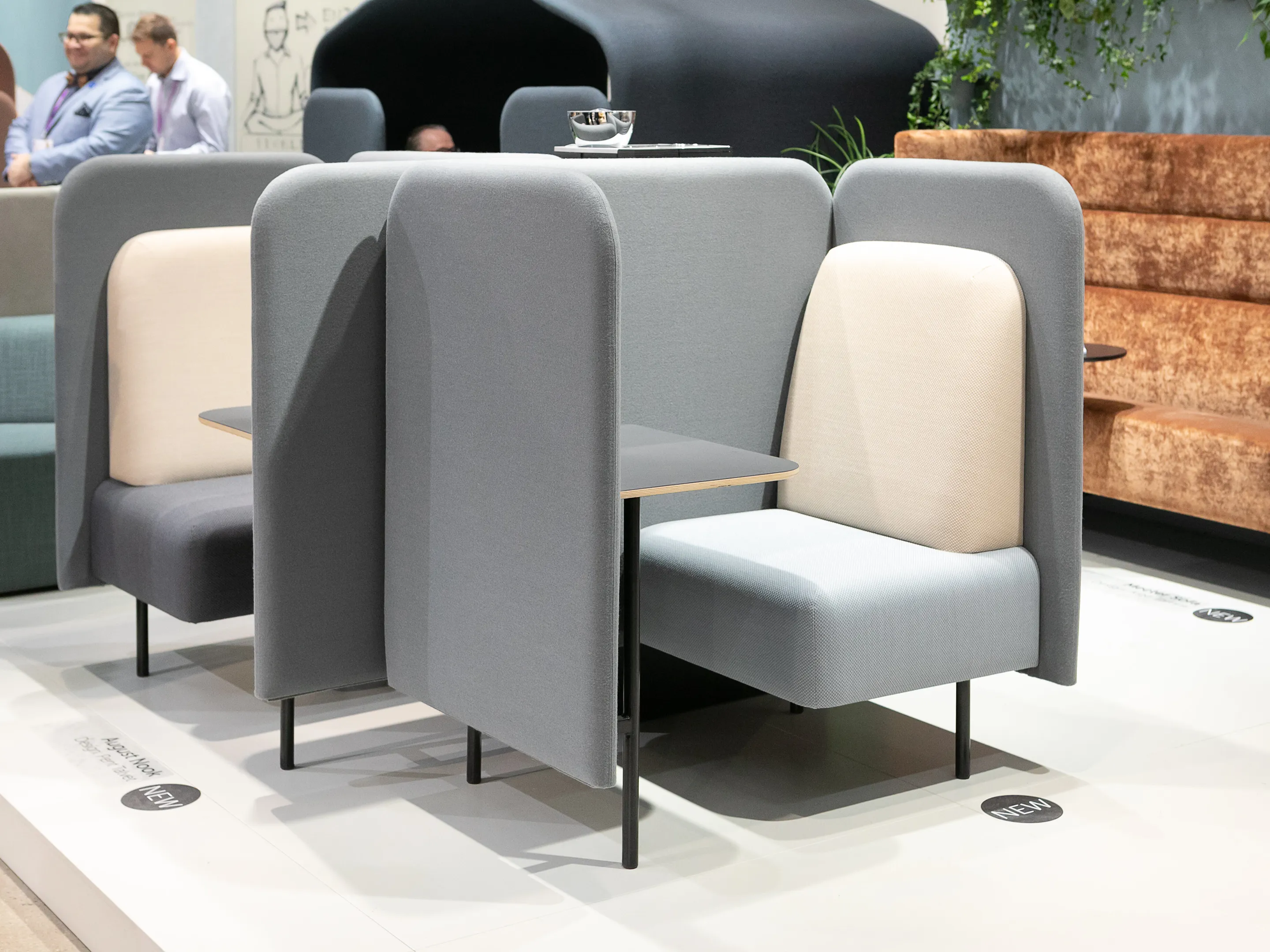 Volledig gestoffeerde workbay met 2x 1-zits bank tegenover elkaar met extra hoge akoestische ombouw aan de zijkanten en achterkant op een 8-poots onderstel. 2300 x 780 x 1450mm (B x D x H). Excl. tafel. Deze moet los worden bijbesteld.