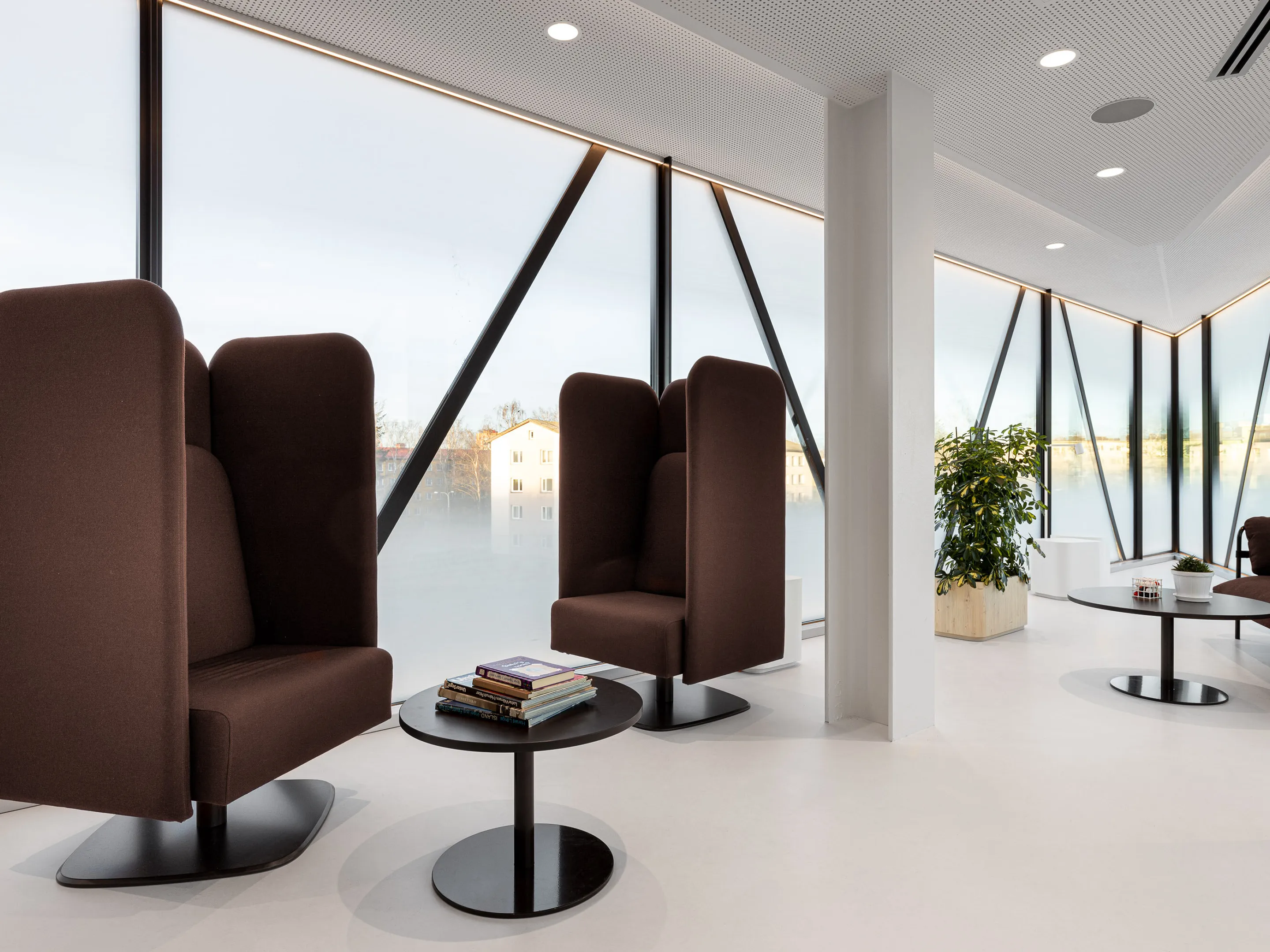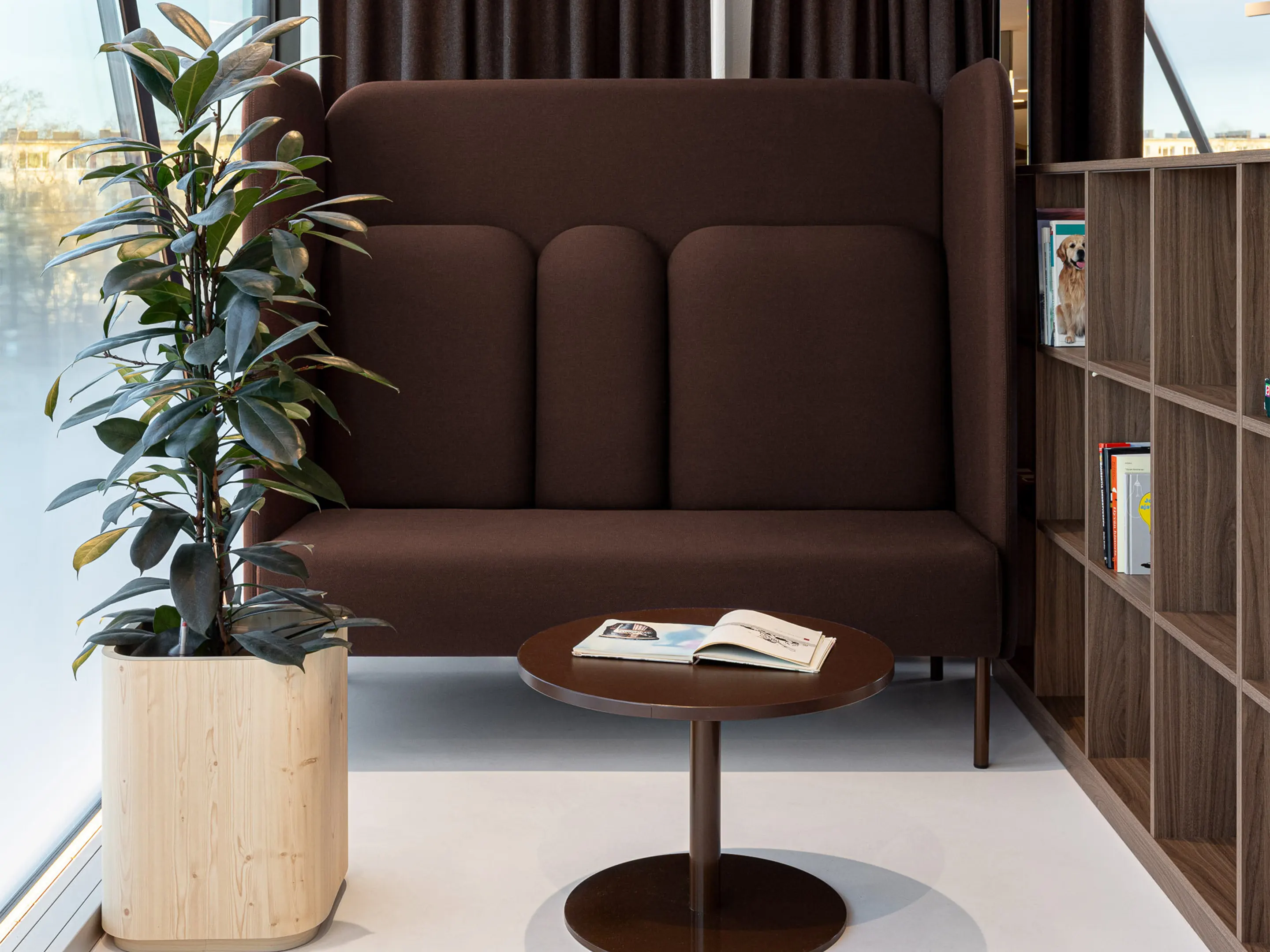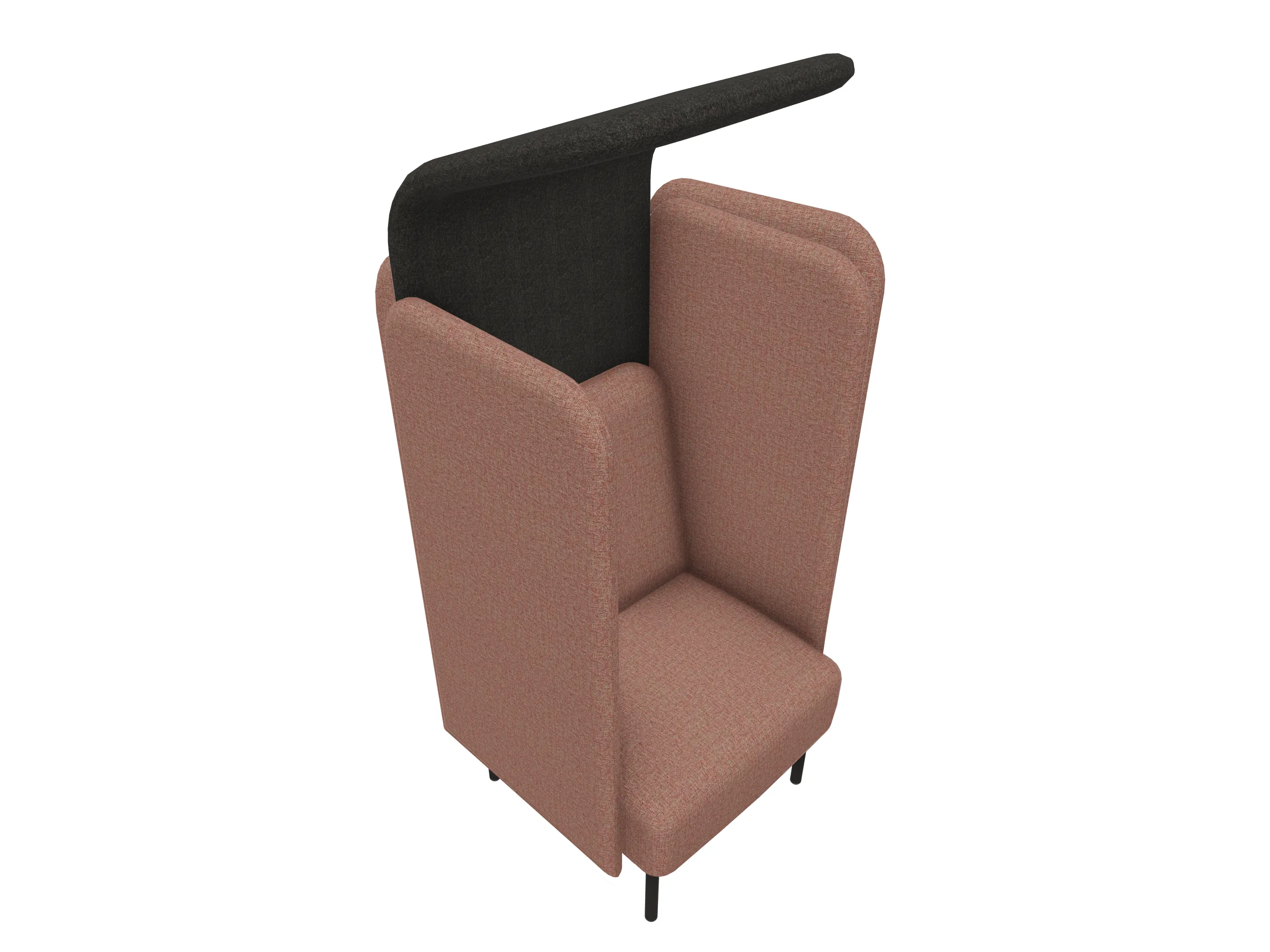 Volledig gestoffeerde 1-zits bank met extra hoge akoestische ombouw aan de zijkanten en achterkant en een schuin dak op een 360° draaibaar onderstel. 780 x 750 x 1850mm (B x D x H).
