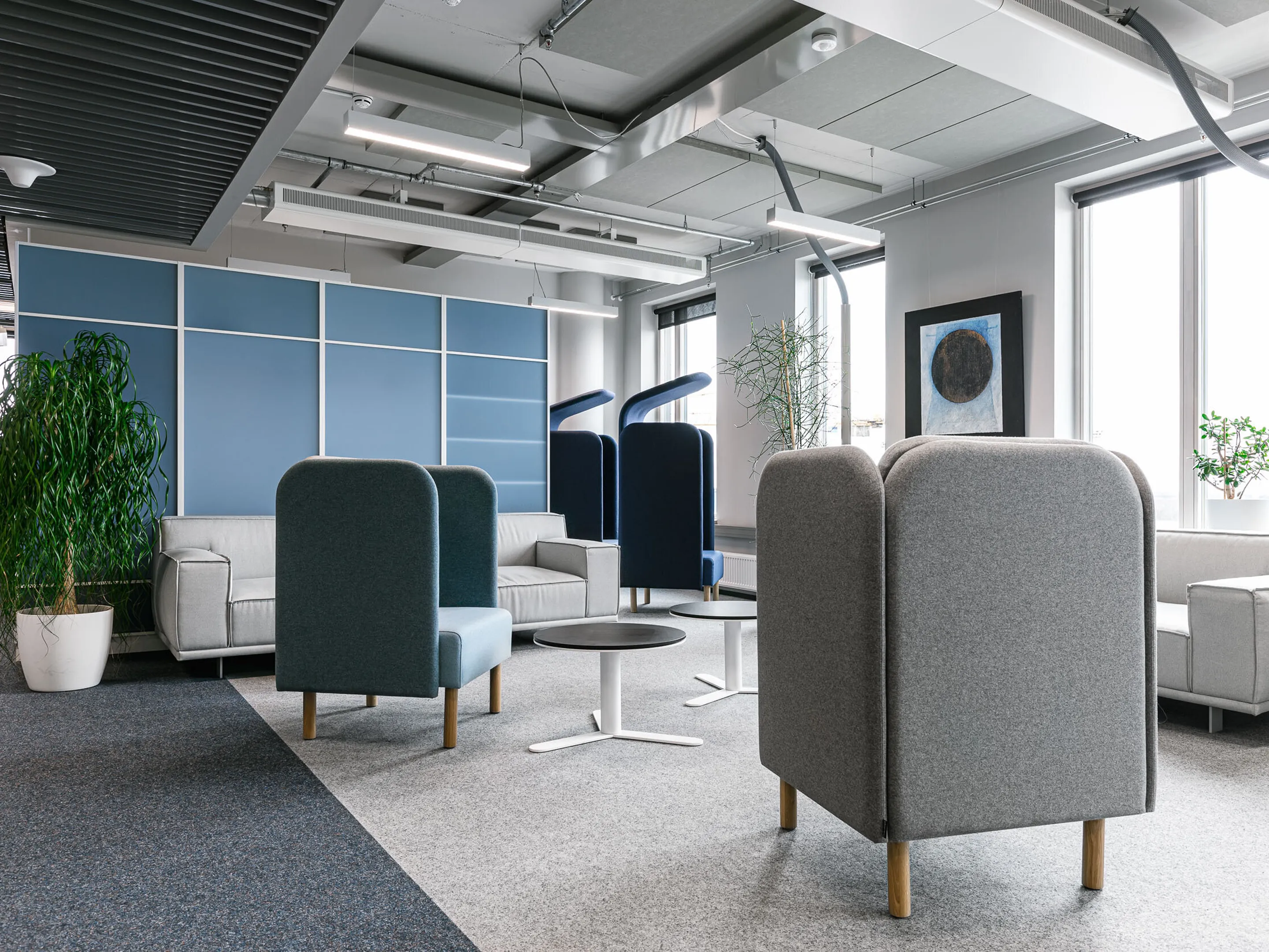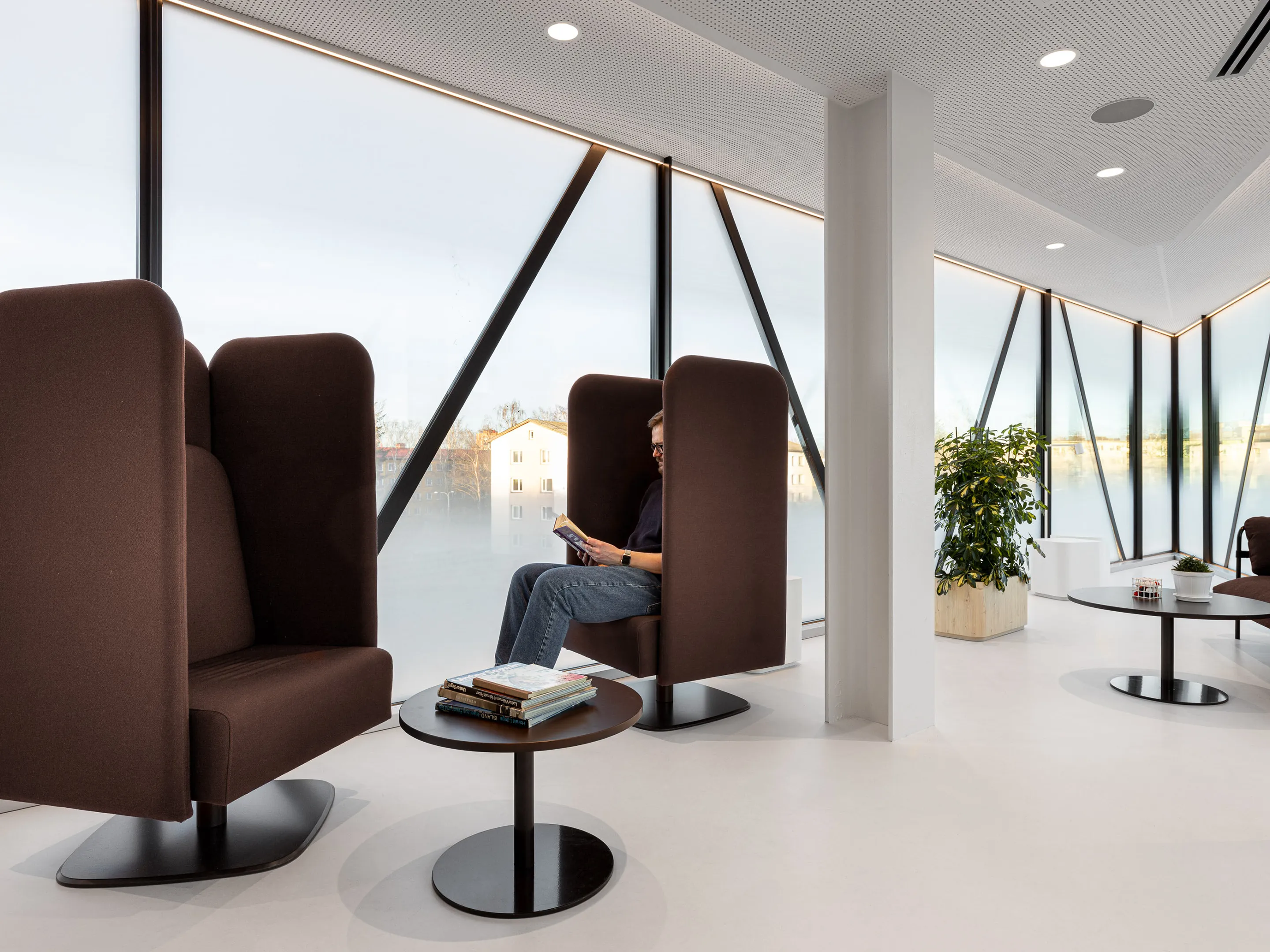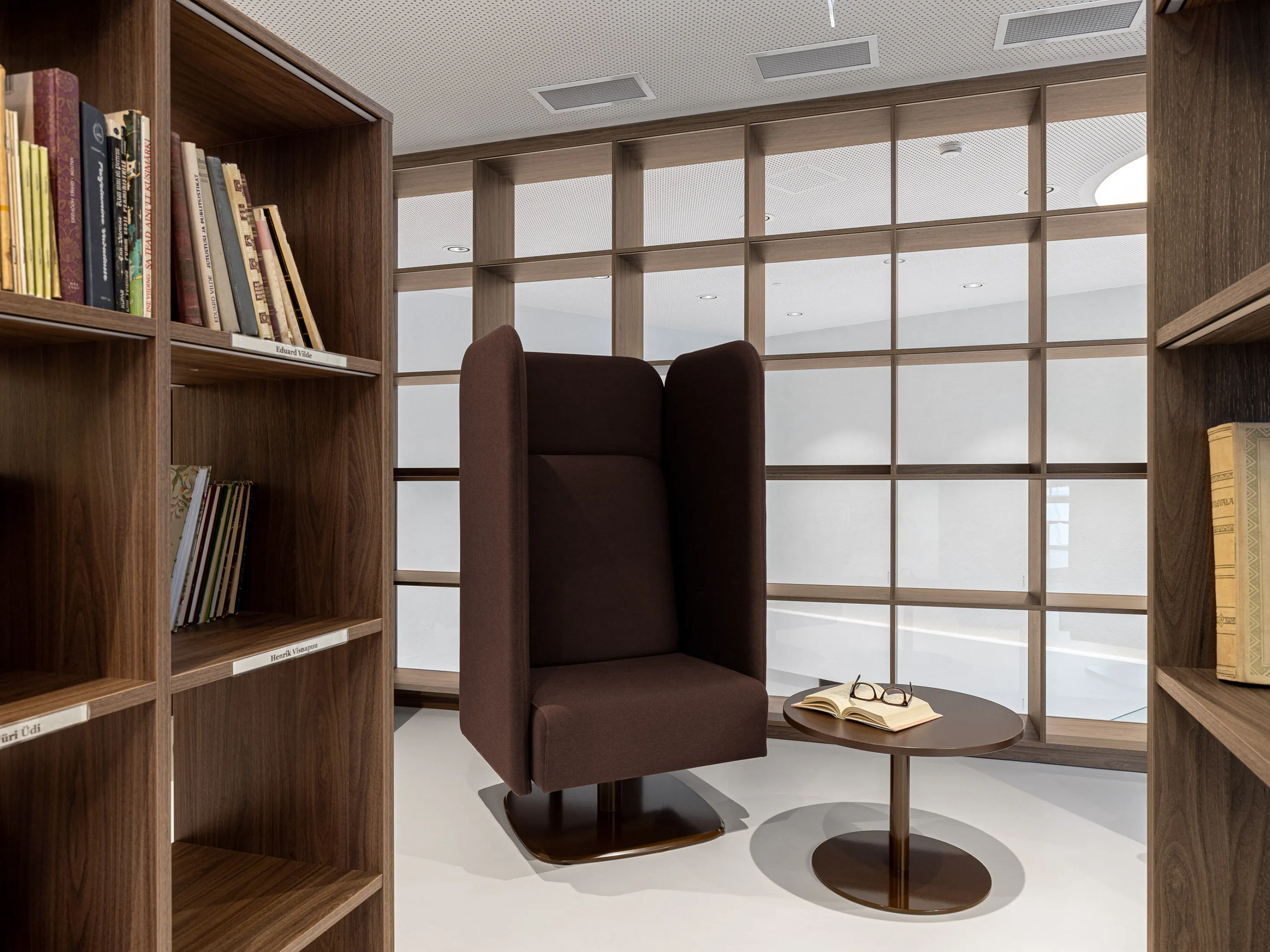 Volledig gestoffeerde 1-zits bank met extra hoge akoestische ombouw aan de zijkanten en achterkant en een schuin dak op een 360° draaibaar onderstel. 780 x 750 x 1850mm (B x D x H).