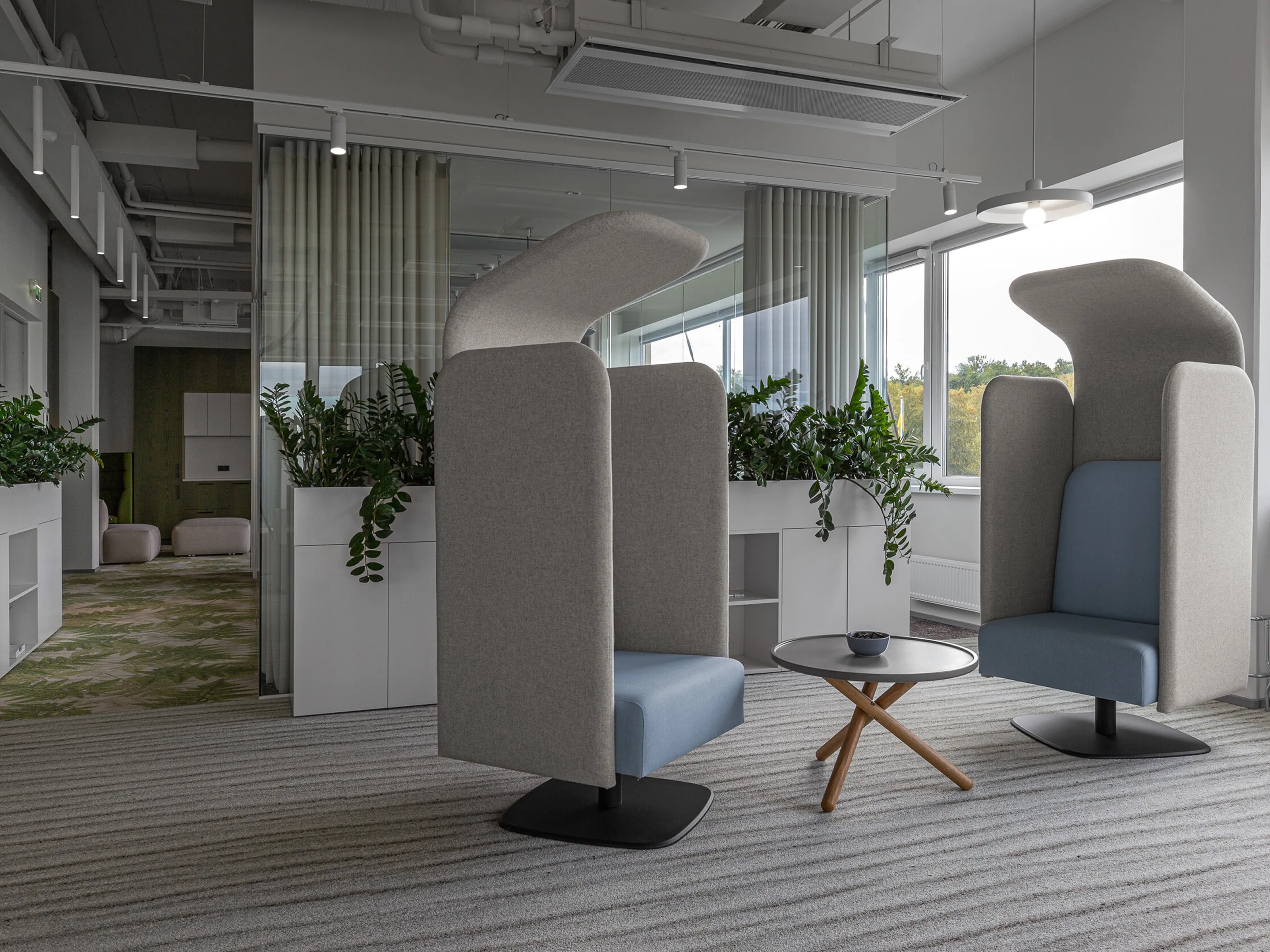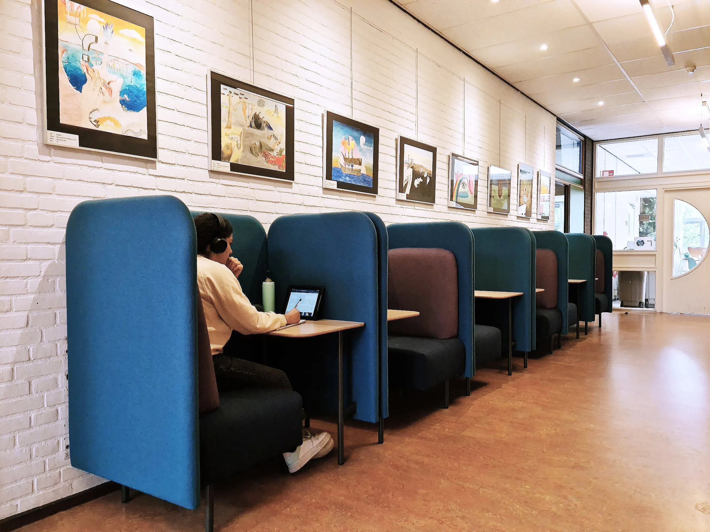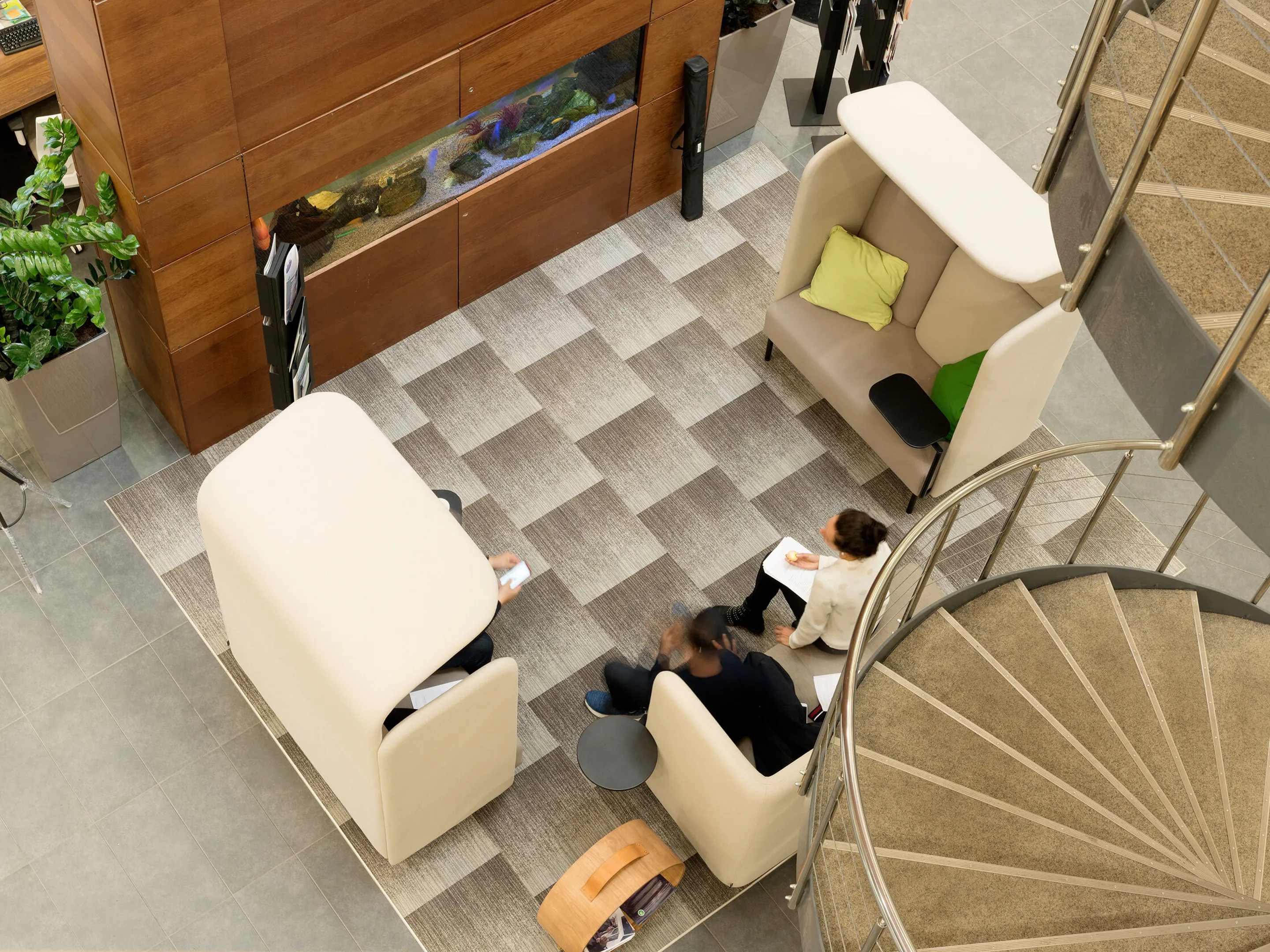 Volledig gestoffeerde 1-zits bank met hoge akoestische ombouw aan de zijkanten en achterkant op een 360° draaibaar onderstel. 780 x 750 x 1080mm (B x D x H).