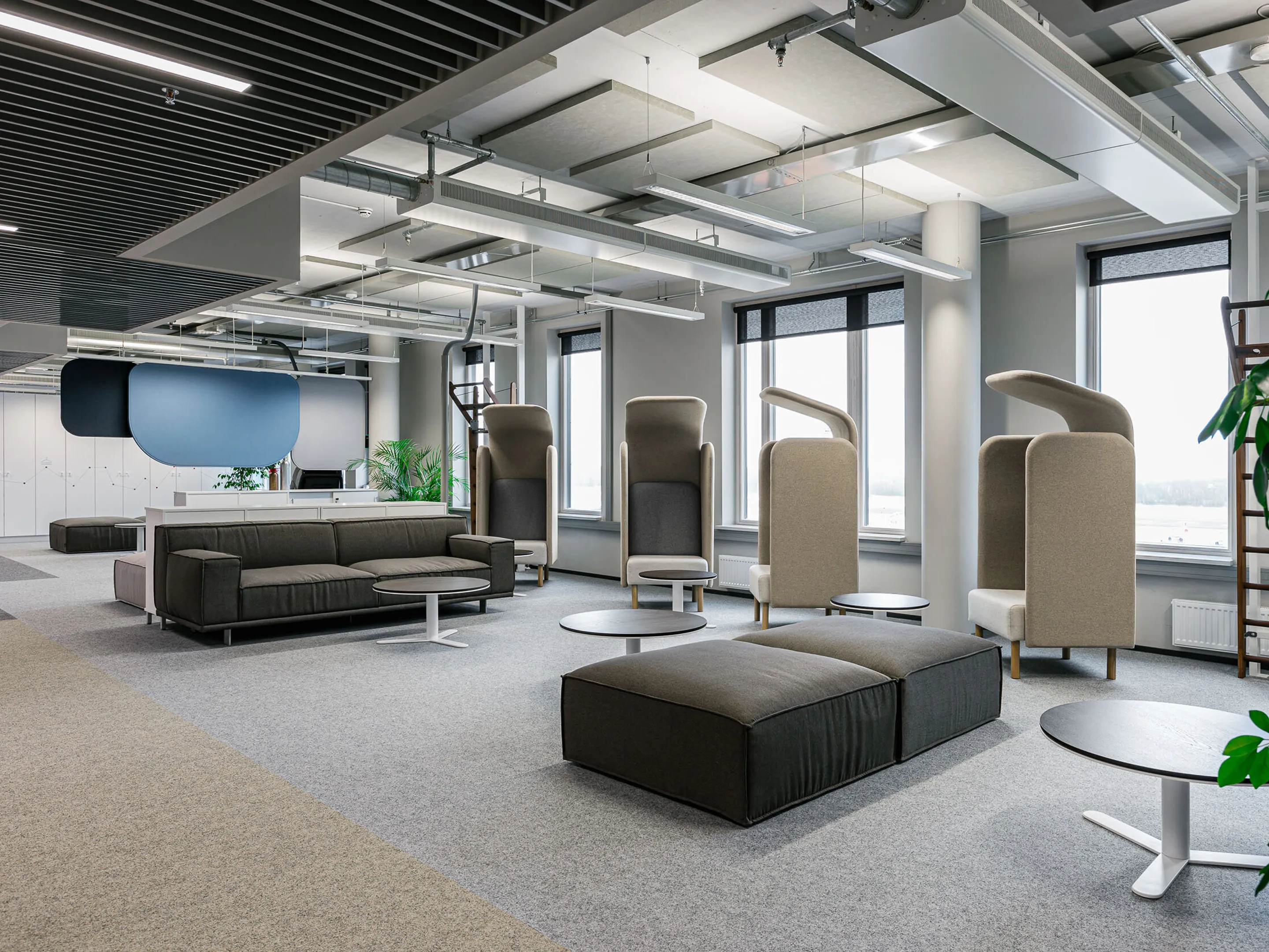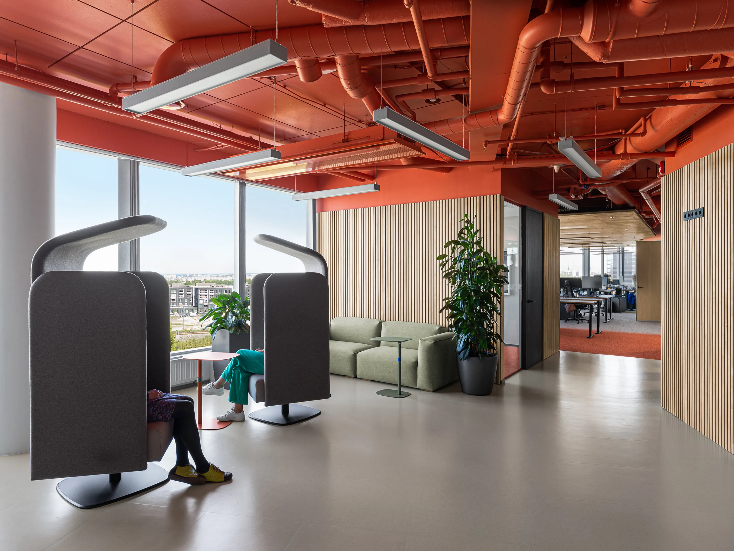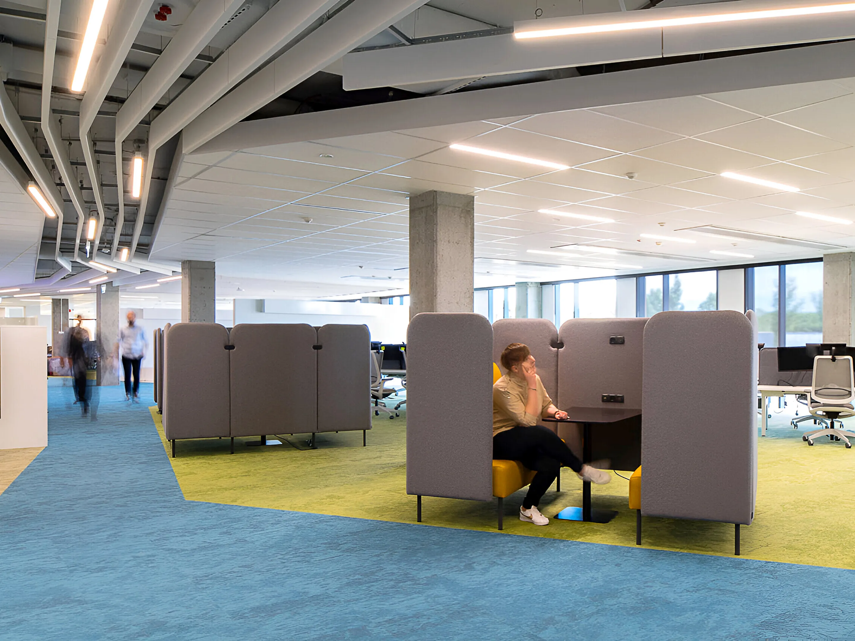 Volledig gestoffeerde 1-zits bank met hoge akoestische ombouw aan de zijkanten en achterkant op een 360° draaibaar onderstel. 780 x 750 x 1080mm (B x D x H).