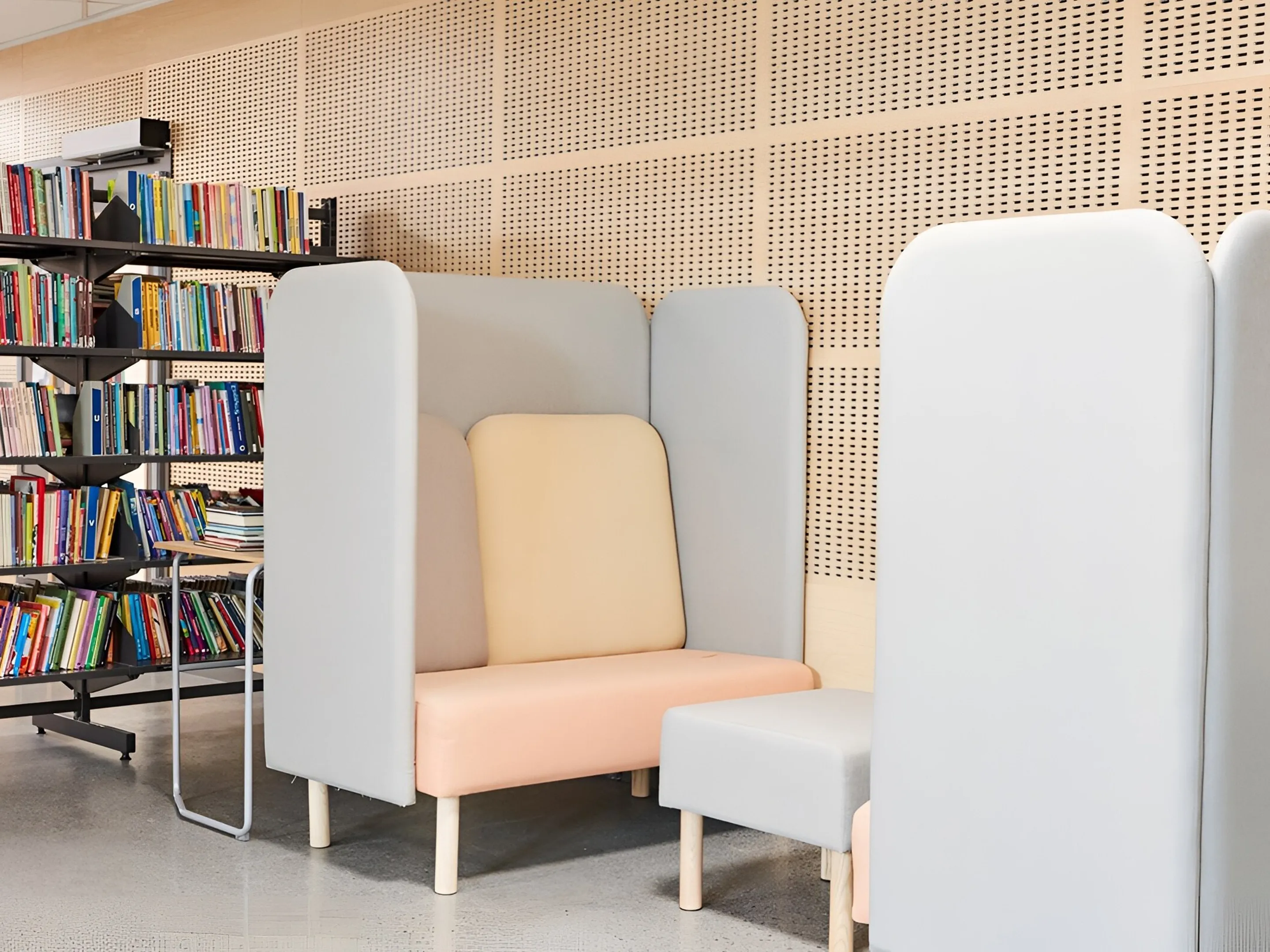 Volledig gestoffeerde 1-zits bank met extra hoge akoestische ombouw aan de zijkanten en achterkant op een 360° draaibaar onderstel. 780 x 750 x 1450mm (B x D x H).