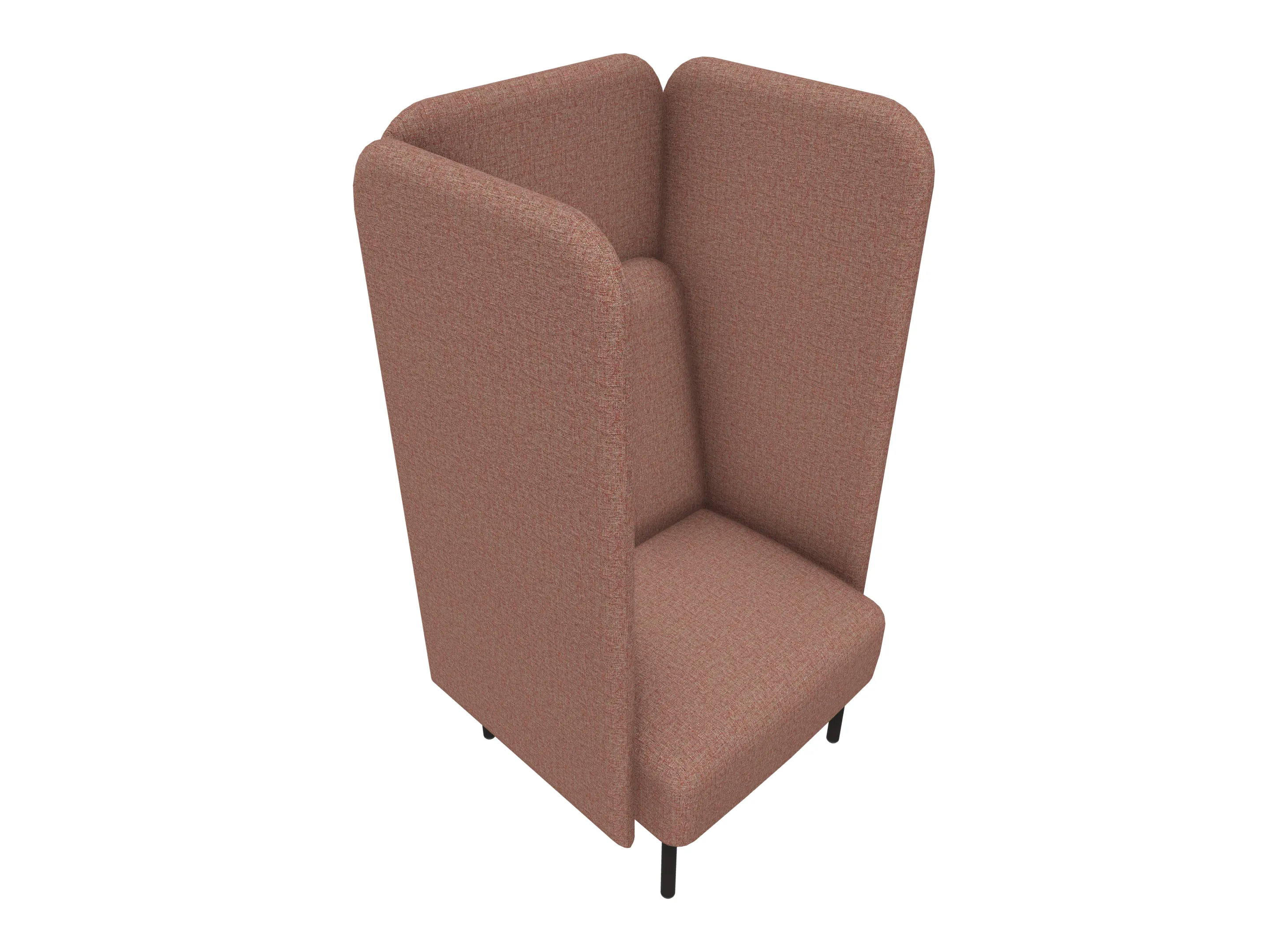 Volledig gestoffeerde 1-zits bank met hoge akoestische ombouw aan de zijkanten en achterkant op een 4-poots onderstel. 780 x 750 x 1080mm (B x D x H).
