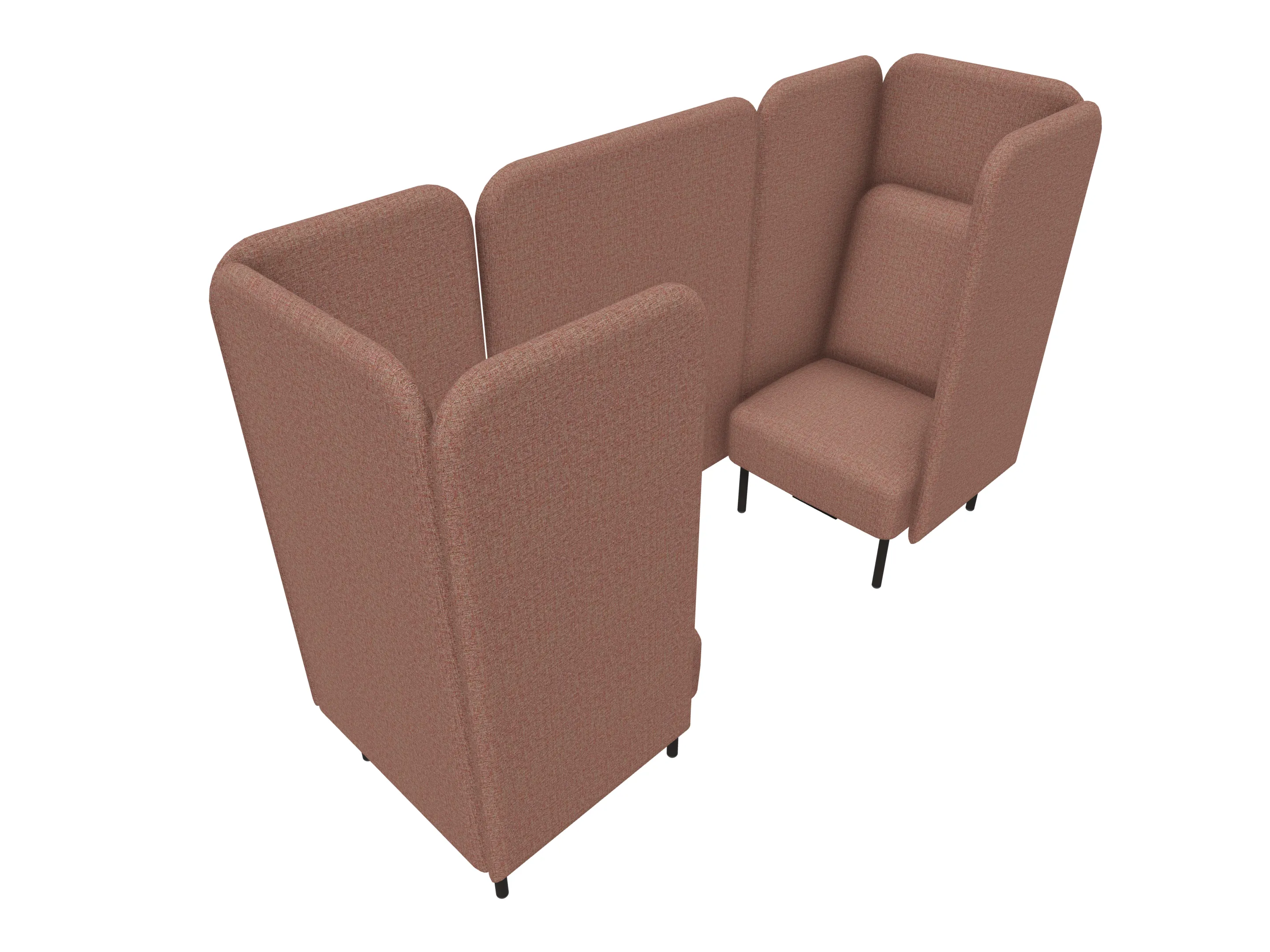 Volledig gestoffeerde 1-zits bank met extra hoge akoestische ombouw aan de zijkanten en achterkant op een 4-poots onderstel. 780 x 750 x 1450mm (B x D x H).