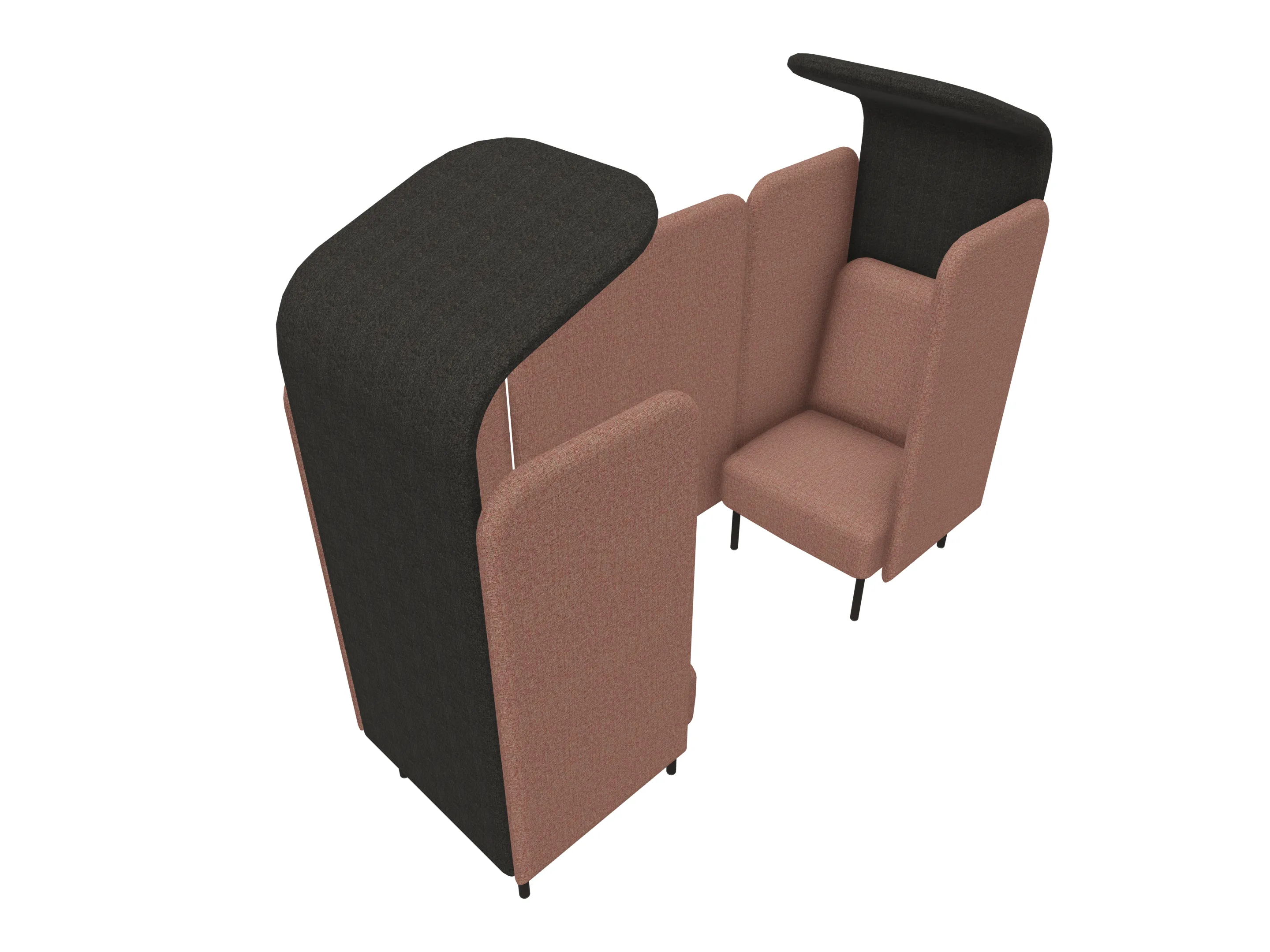 Volledig gestoffeerde POD met 2x 1-zits bank tegenover elkaar met extra hoge akoestische ombouw aan de zijkanten en achterkant en een schuin dak op een 8-poots onderstel. 2300 x 780 x 1450mm (B x D x H). Excl. tafel. Deze moet los worden bijbesteld.