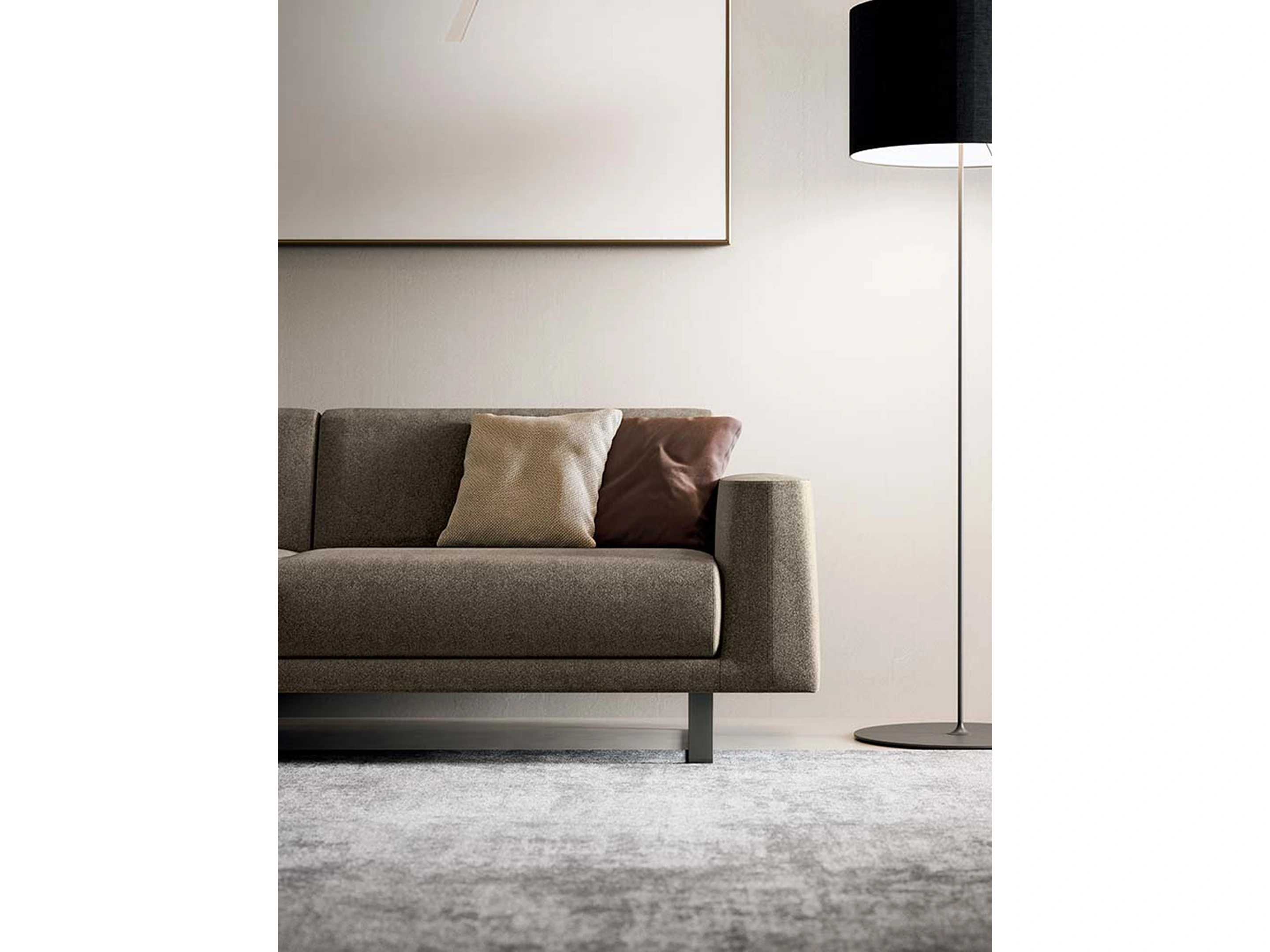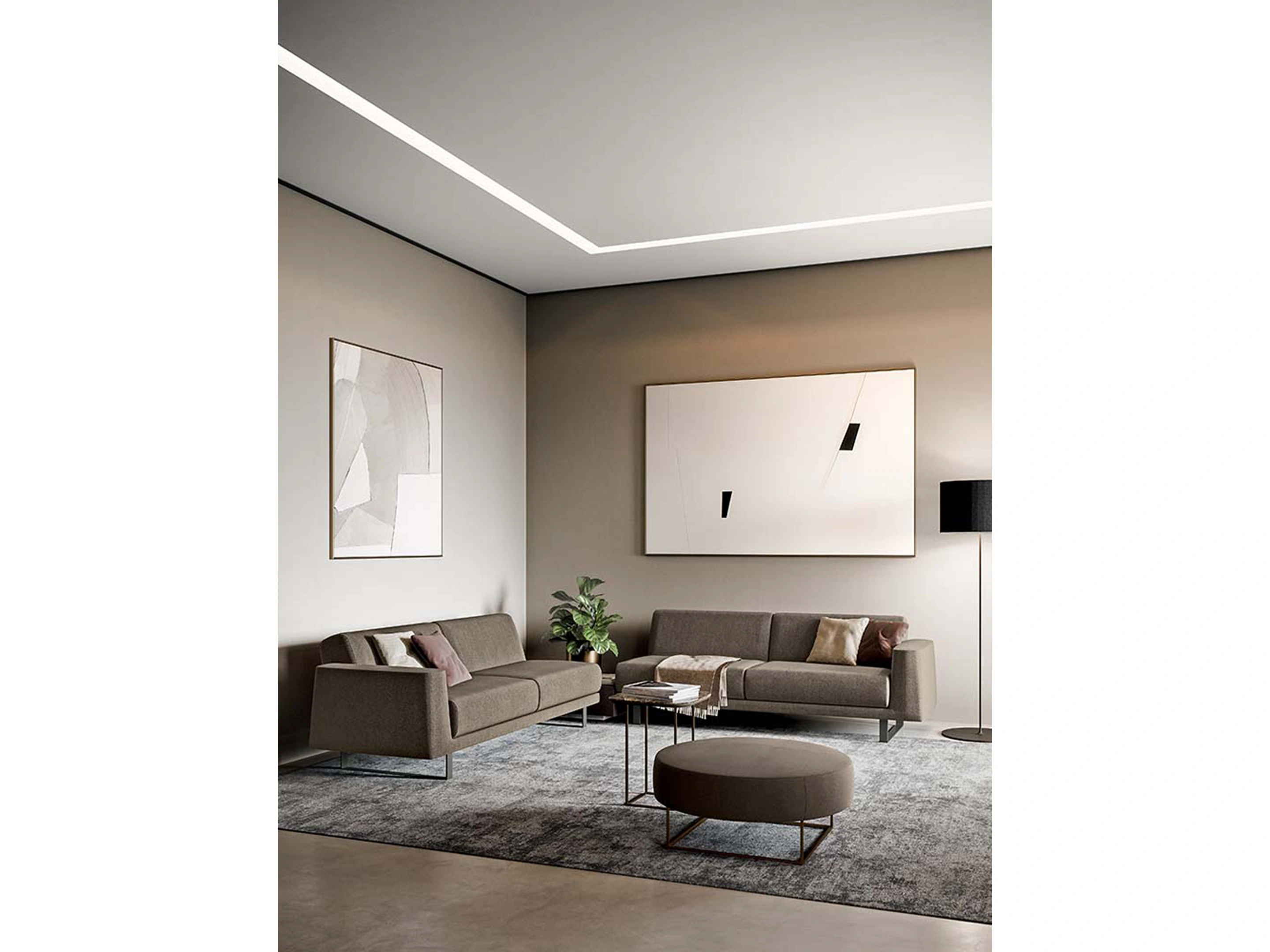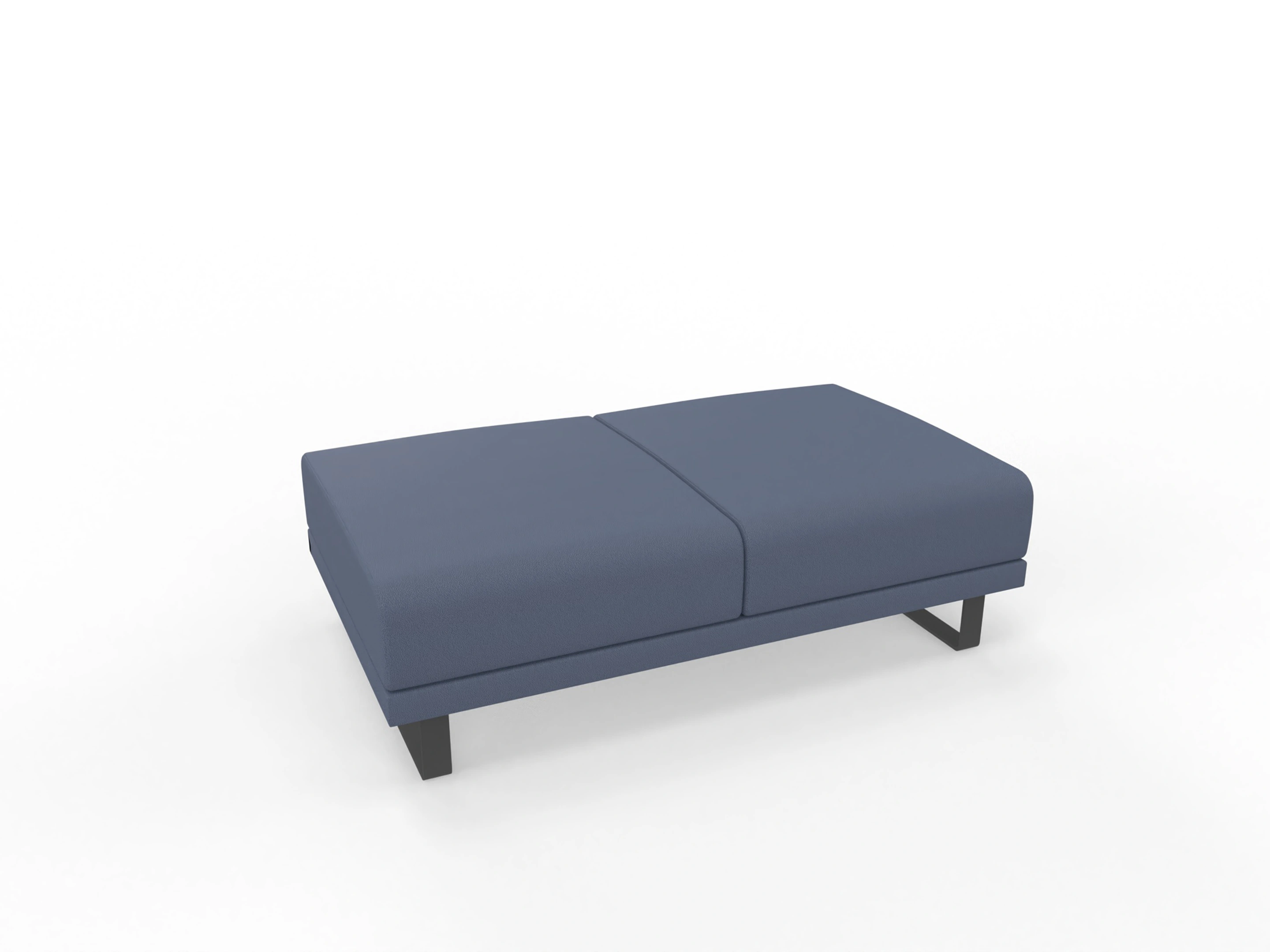 Volledig gestoffeerde 2-zits poef op een sledeframe, exclusief arm- en rugleuningen.