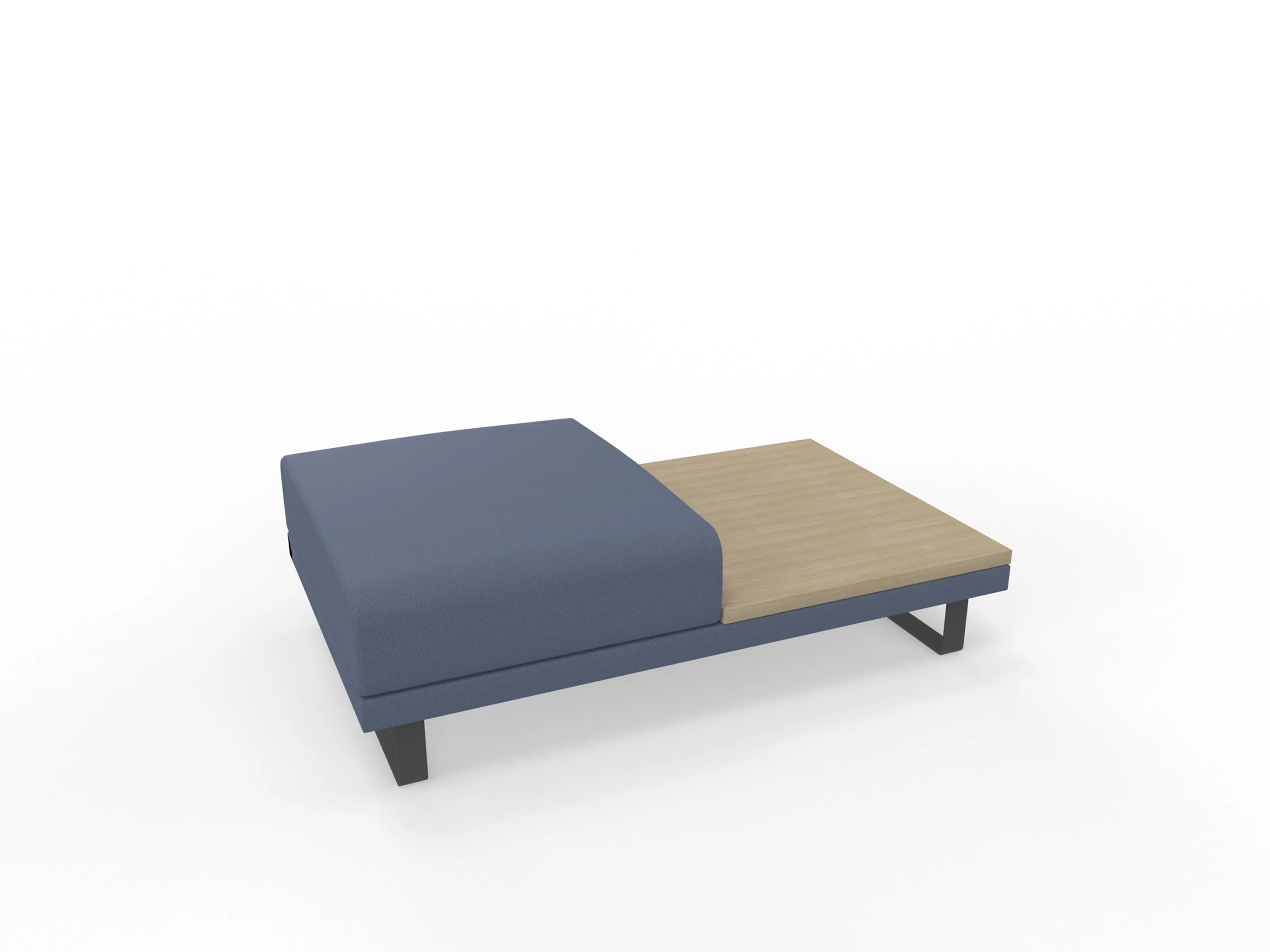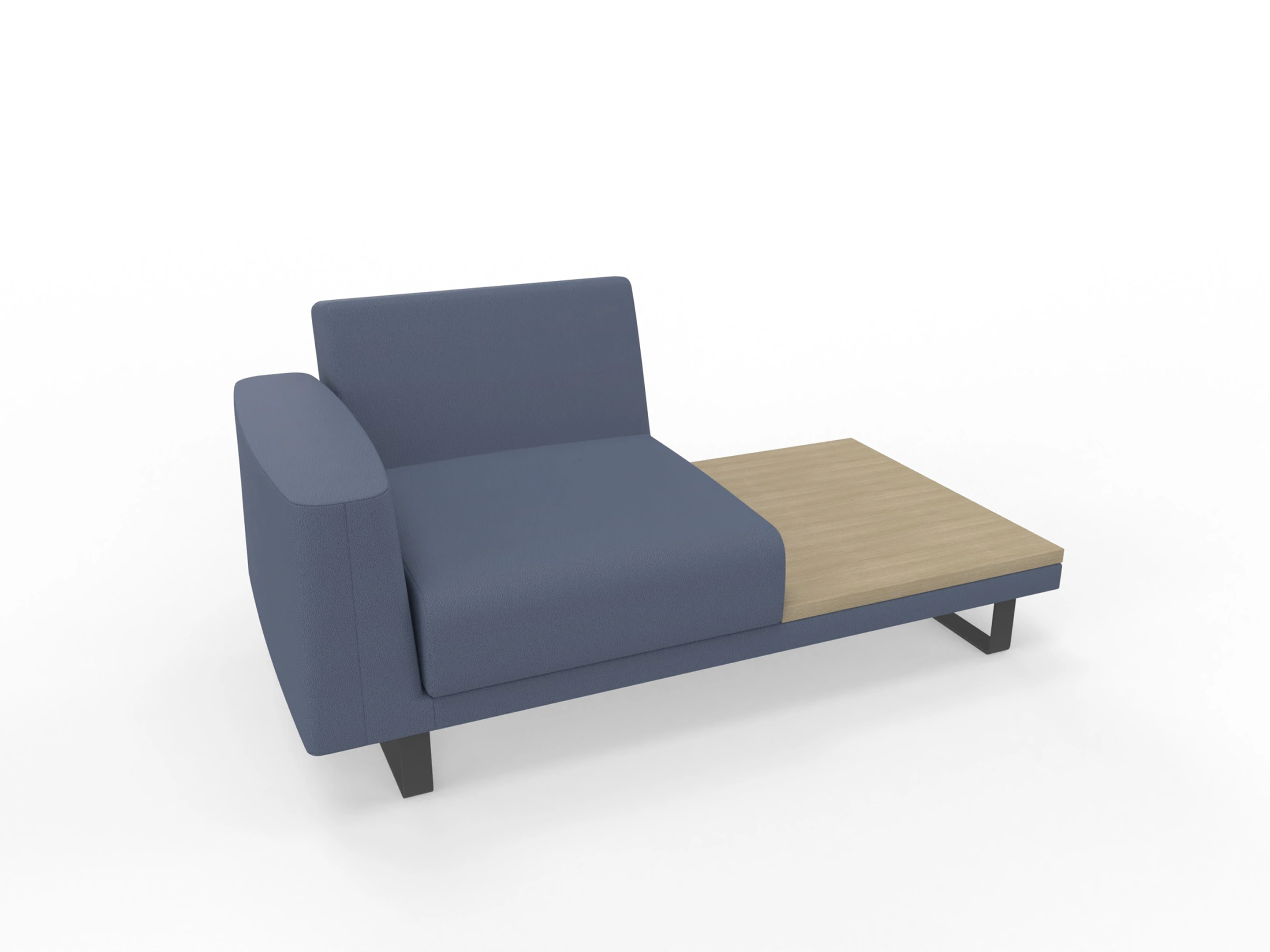 Volledig gestoffeerde 1-zits bank met een arm- en rugleuning aan de rechterzijde en een tafel aan de linkerzijde op een sledeframe