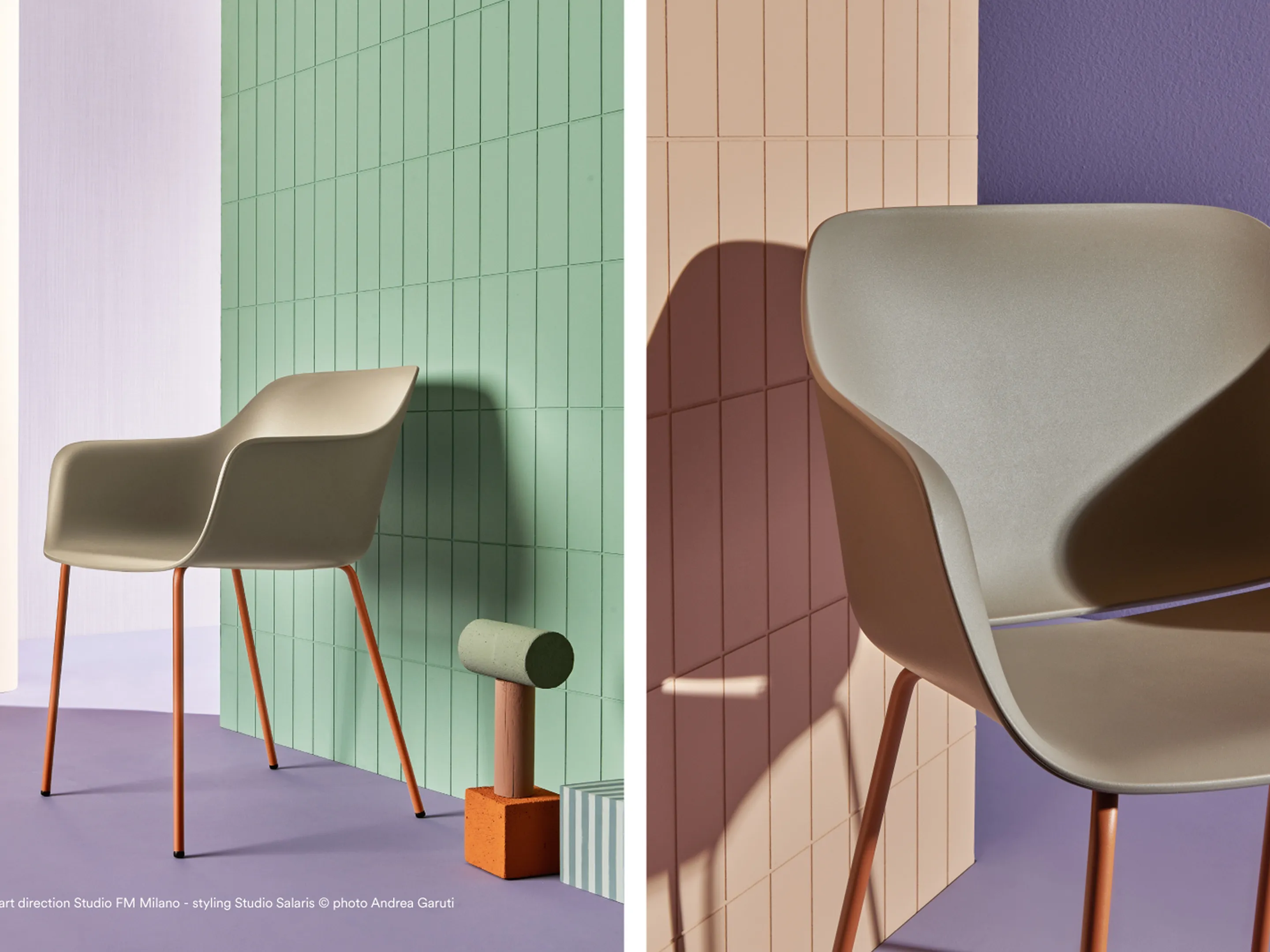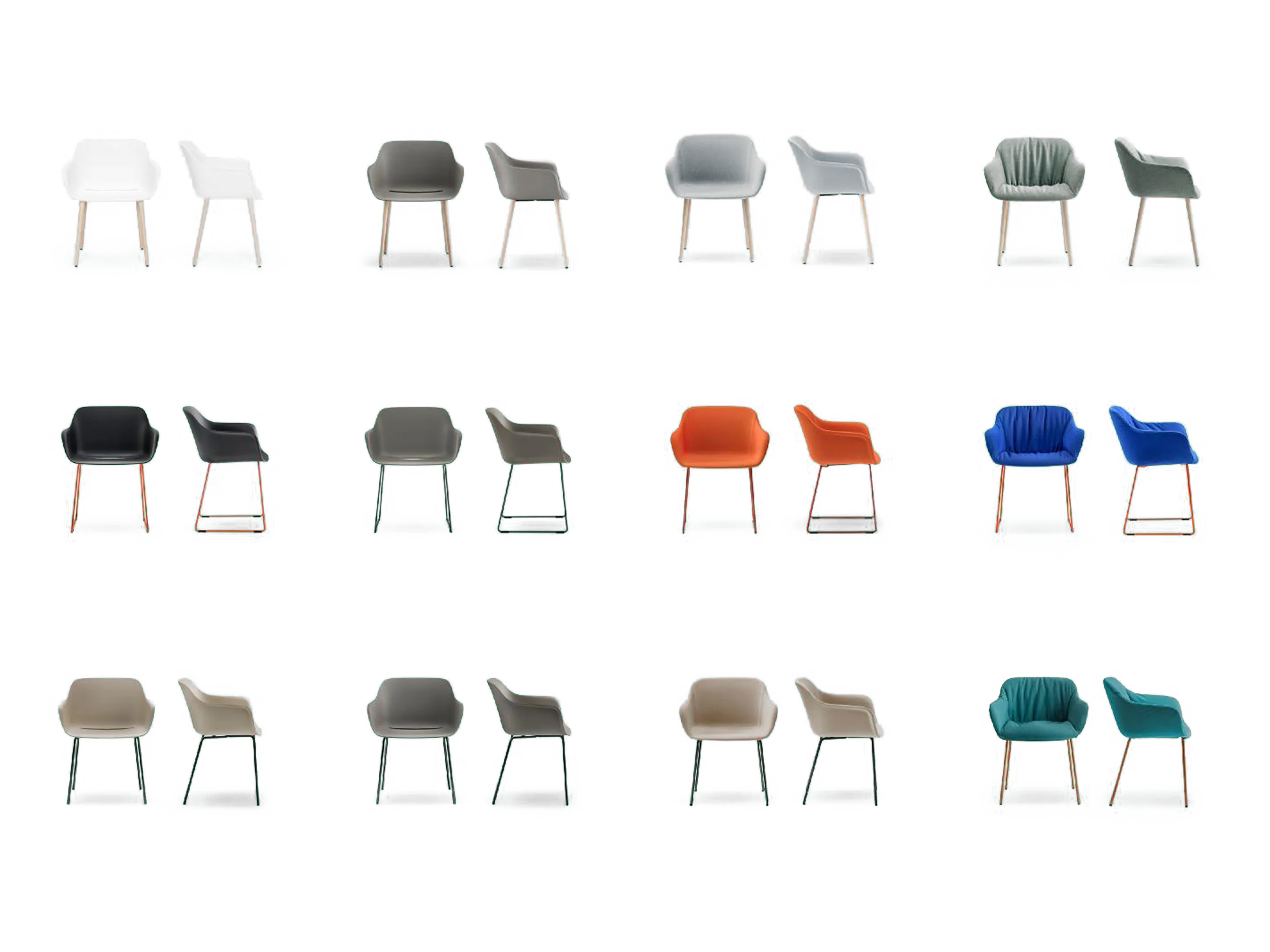 Metalen 4-poots frame met een kuip uit gerecycled polypropyleen. De stoffering zit er los overheen gespannen en is afneembaar.
