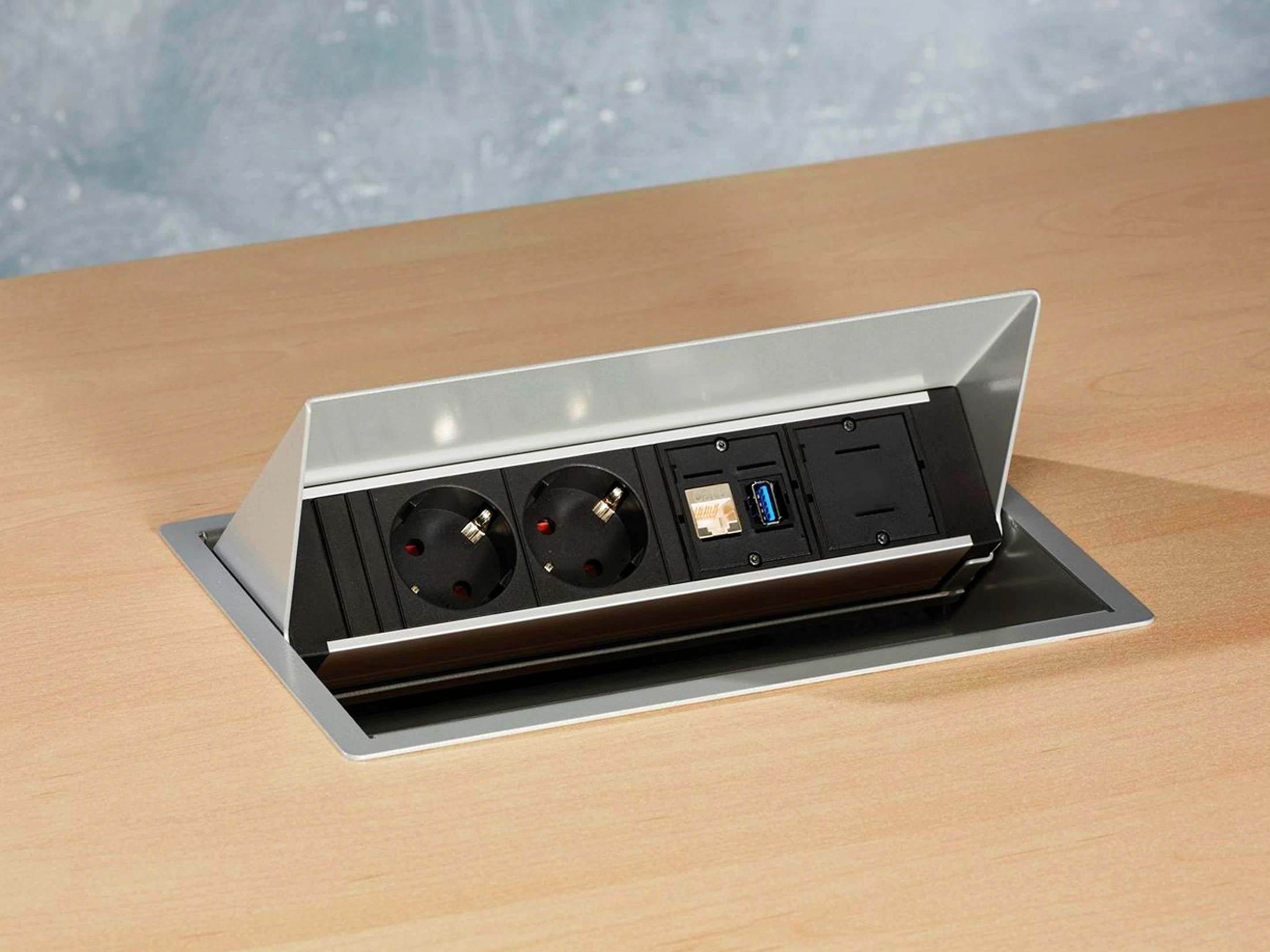 Inbouwframe incl. stekkervoorziening, 2x 230V (CEE7, voor Nederlands en Duits gebruik), 1x USB-A 15Watt Charger (2 uitgangen), 1x custom module. Incl. 0,2m GST18 doorverbindkabel.