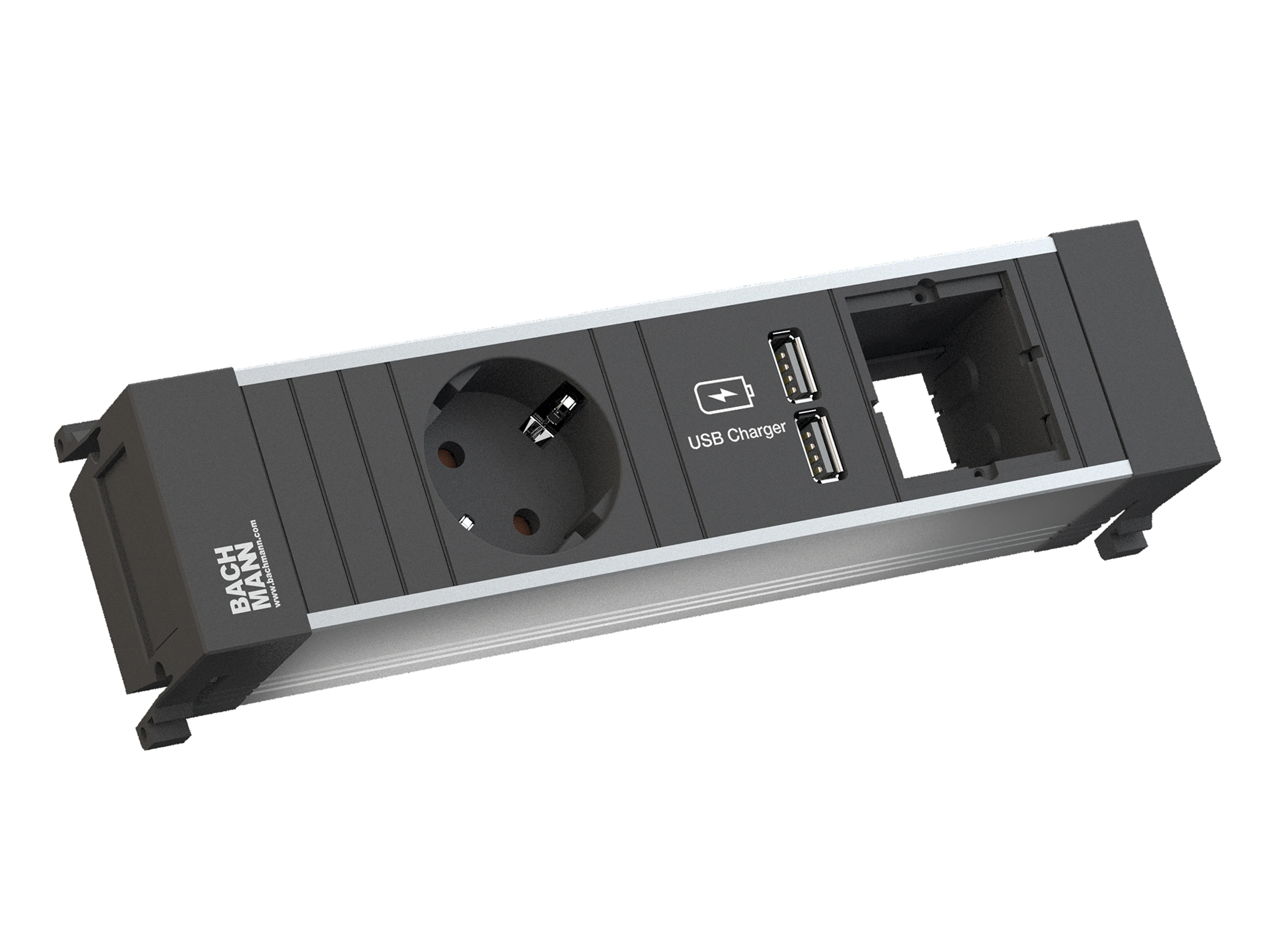 Stekkerdoos voor Powerframe en Powerframe Cover, 1x 230V (UTE, voor Belgisch en Frans gebruik). 1x USB-A (15W)Charger (2 uitgangen). 1x Custom Module. Incl. 0,2m GST18 stekker