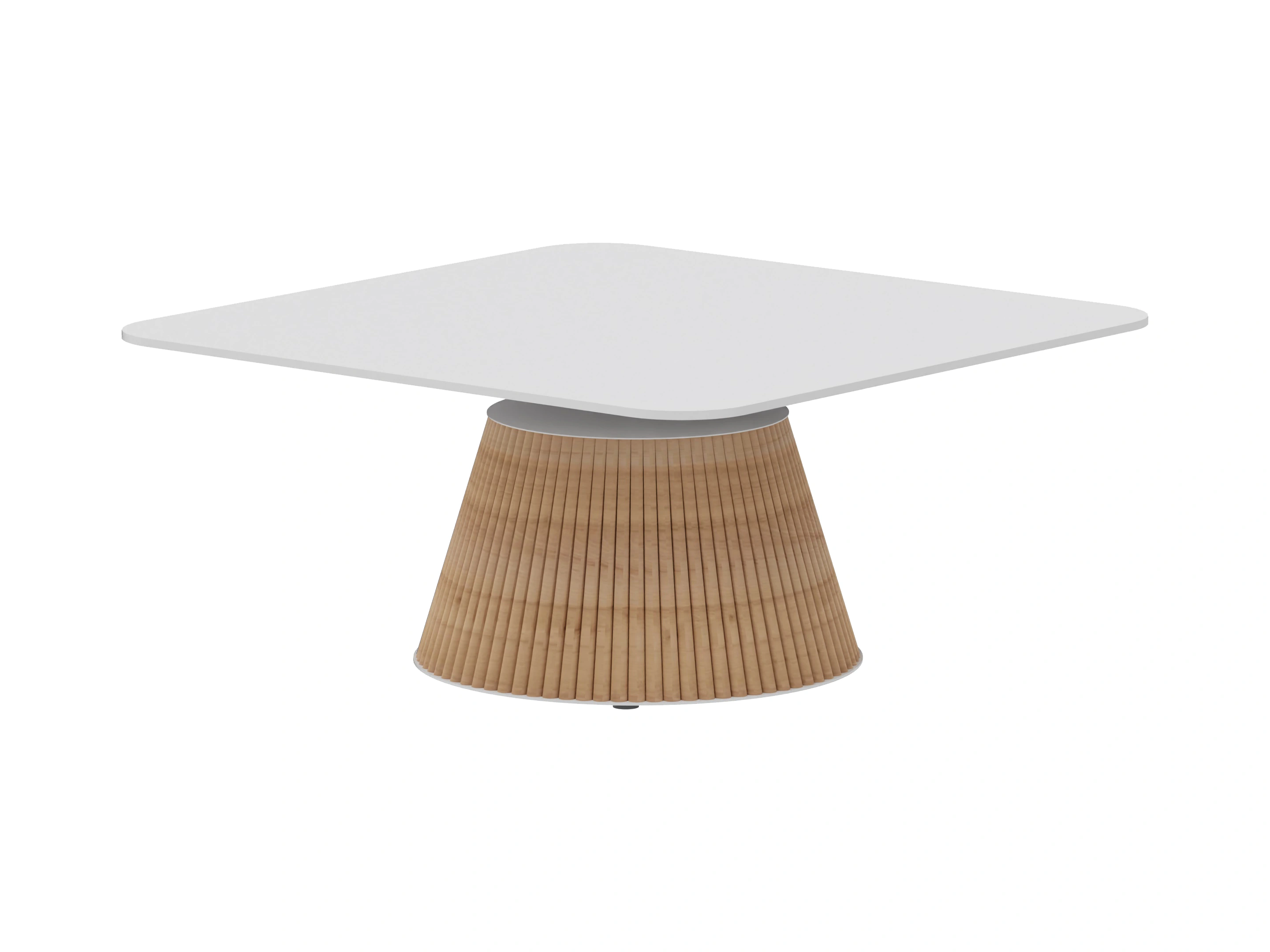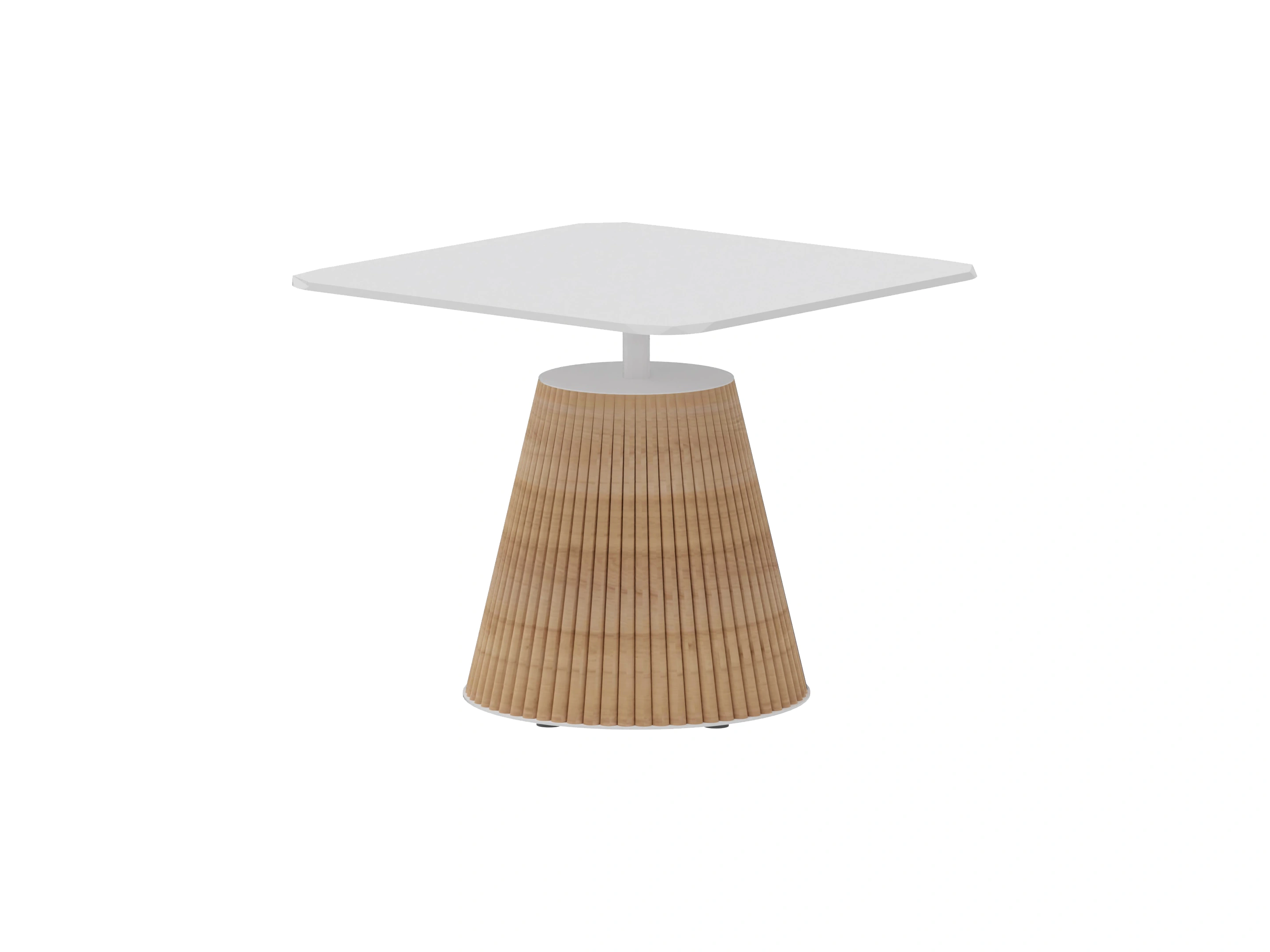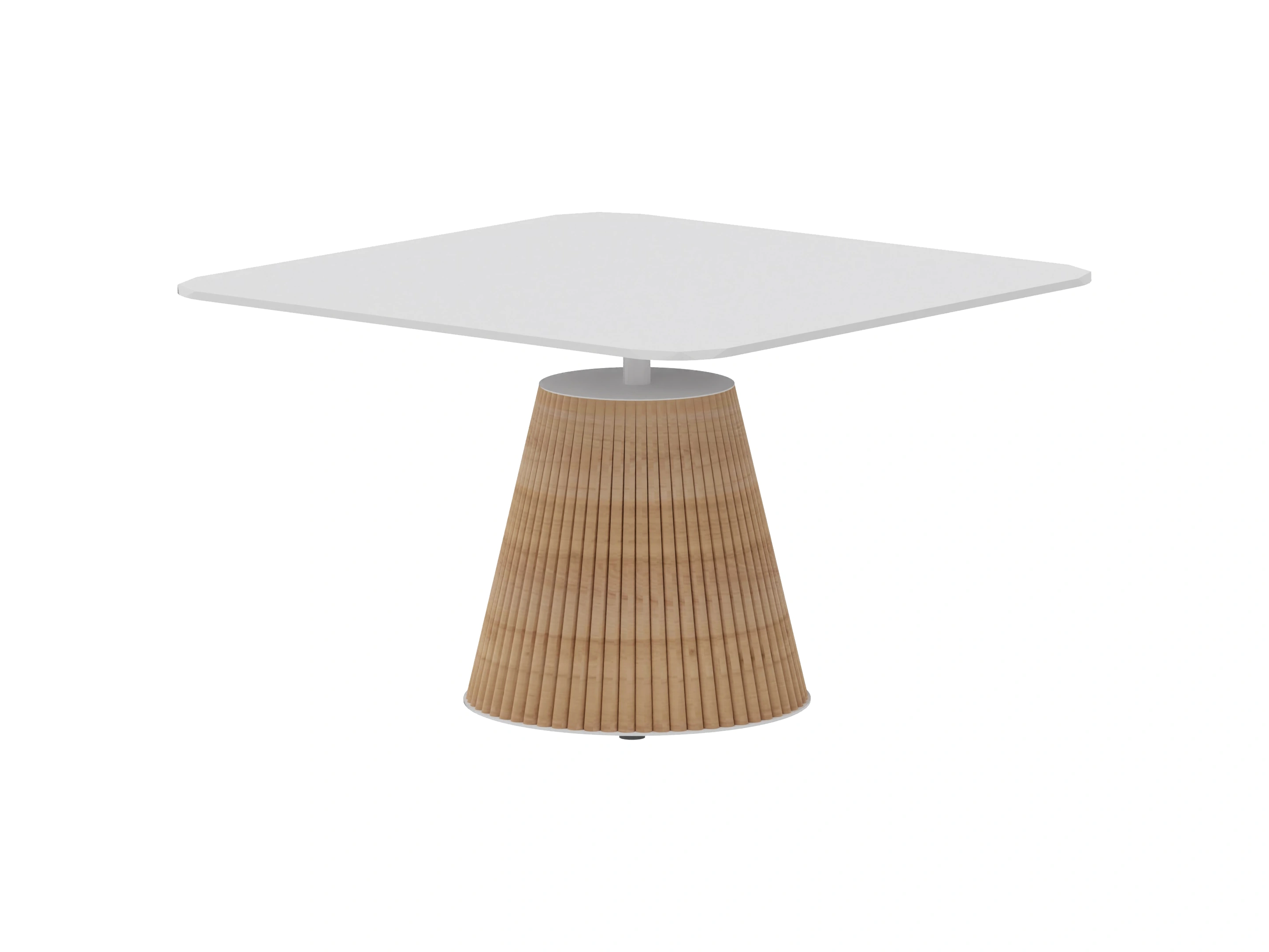 Vierkante bijzettafel met houten conus vormige voet en verhoogde koker, afmeting: 120 x 120 x 51cm (BxDxH).
