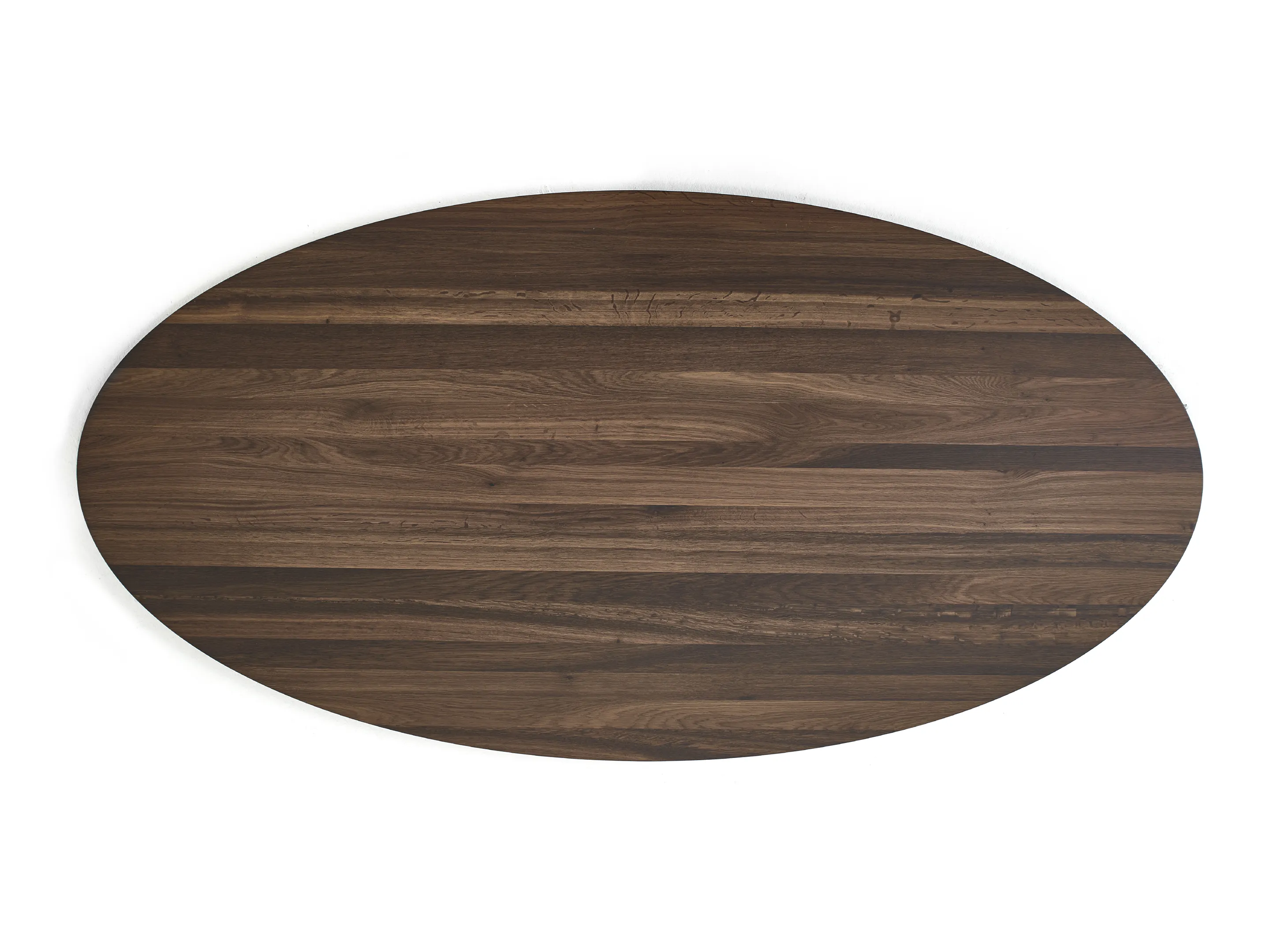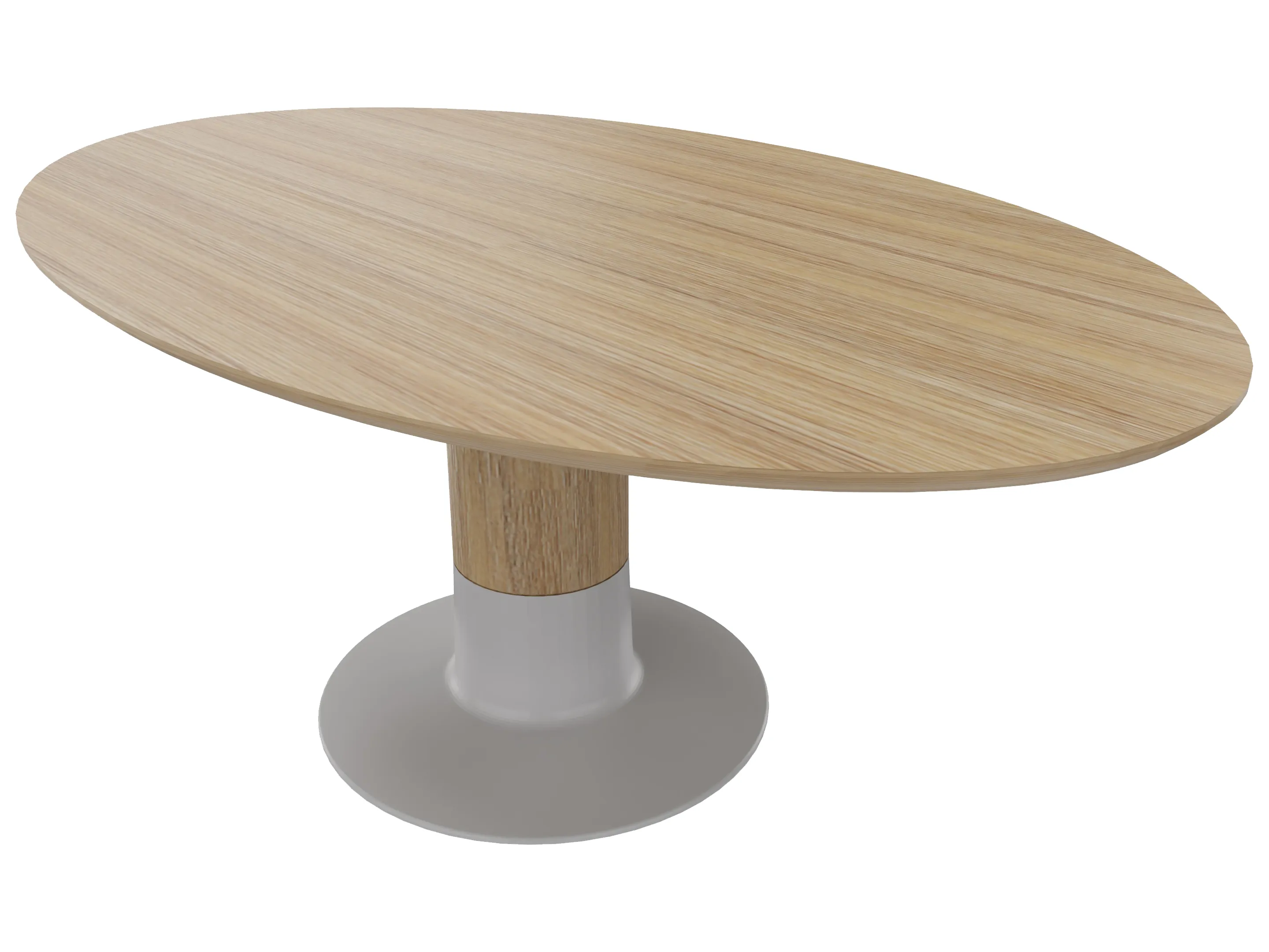Vergadertafel in ellipsvorm met aluminium voetplaat. Afmeting 2100 x 1360 x 750mm (BxDxH).