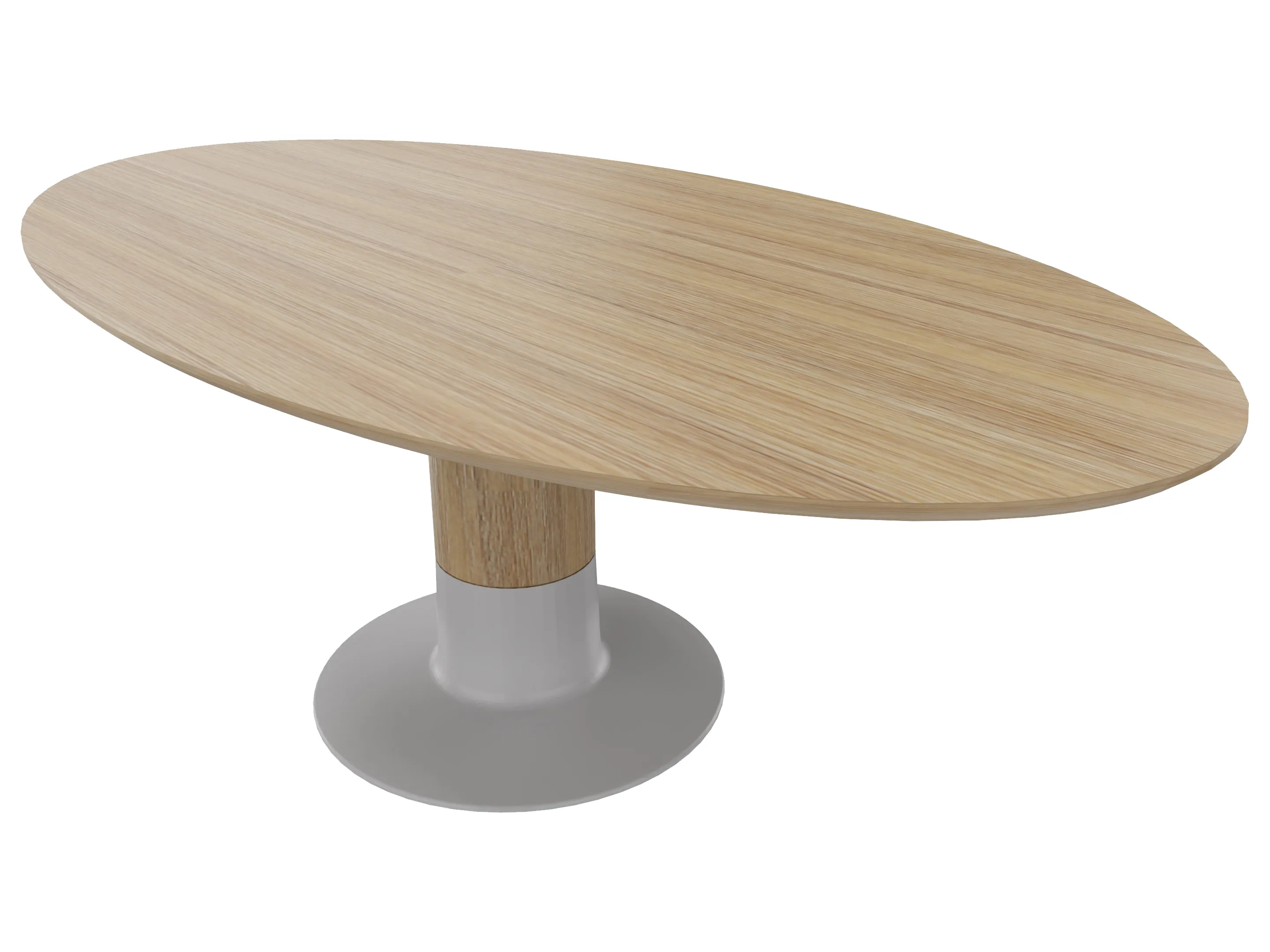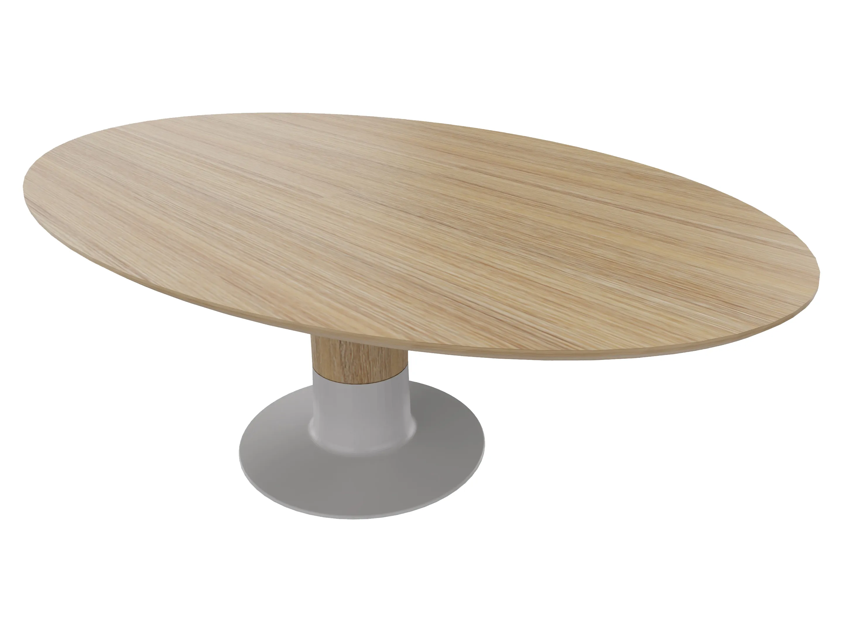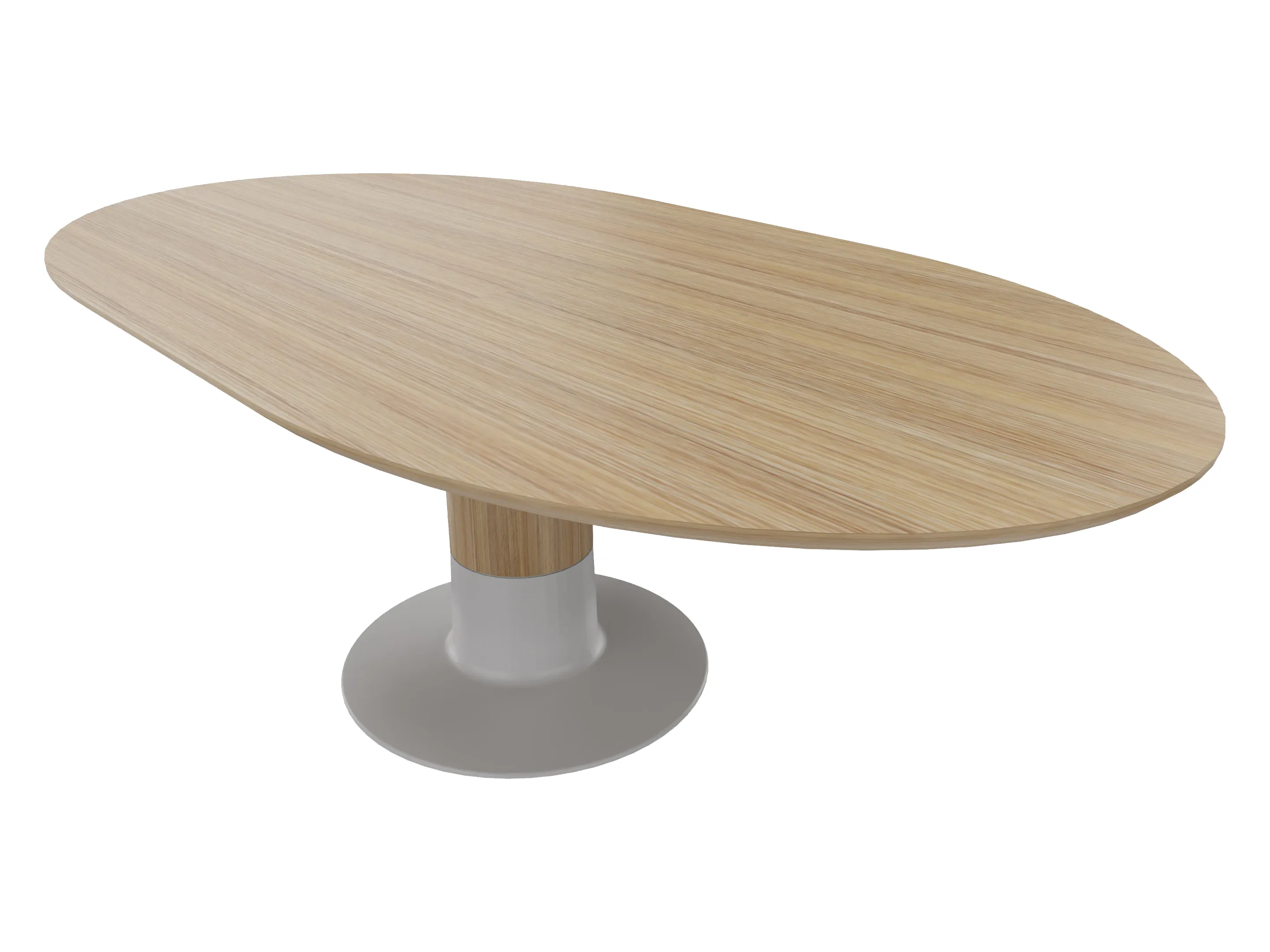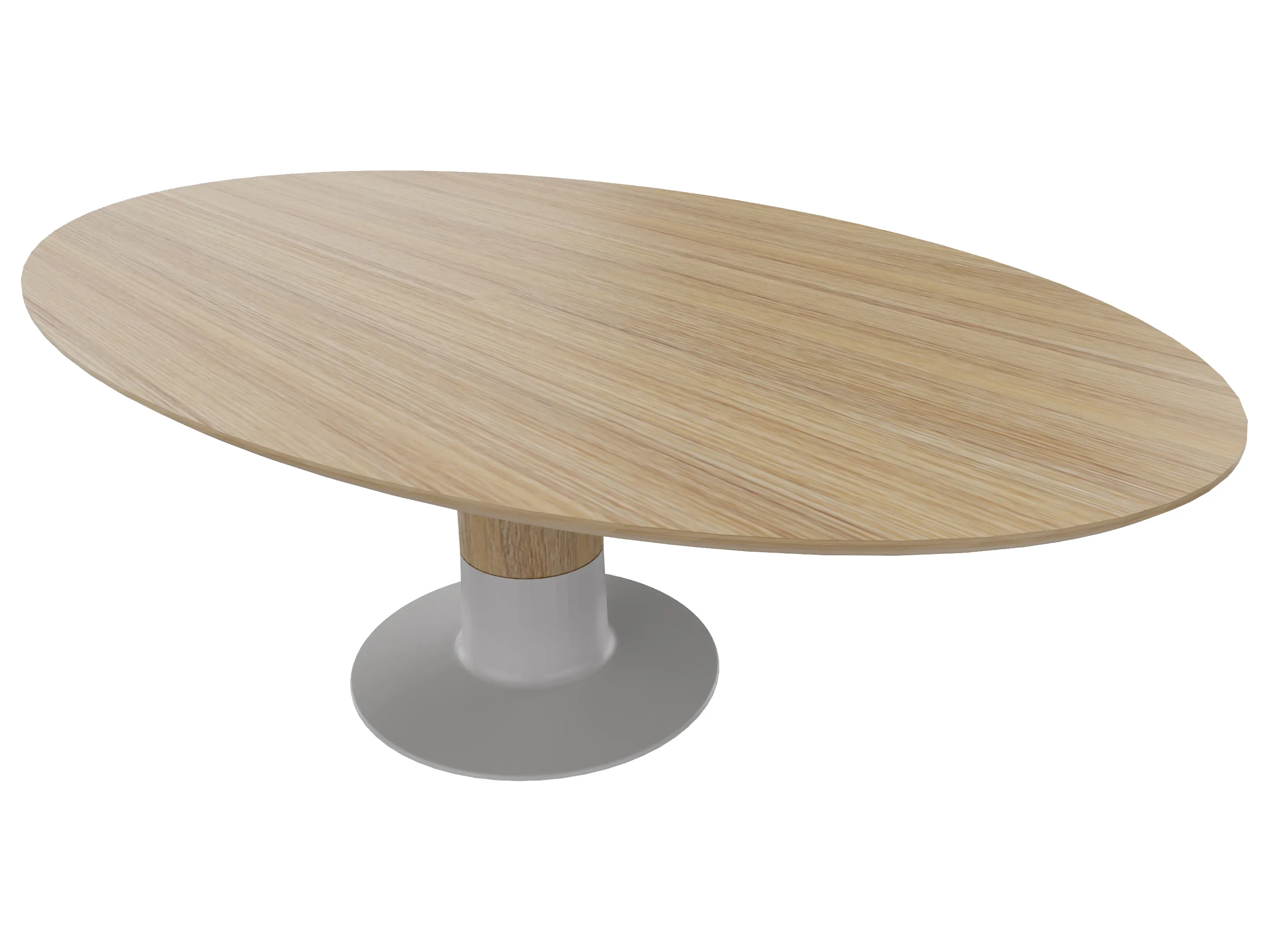 Vergadertafel in ellipsvorm met aluminium voetplaat. Afmeting 2190 x 1360 x 750mm (BxDxH).