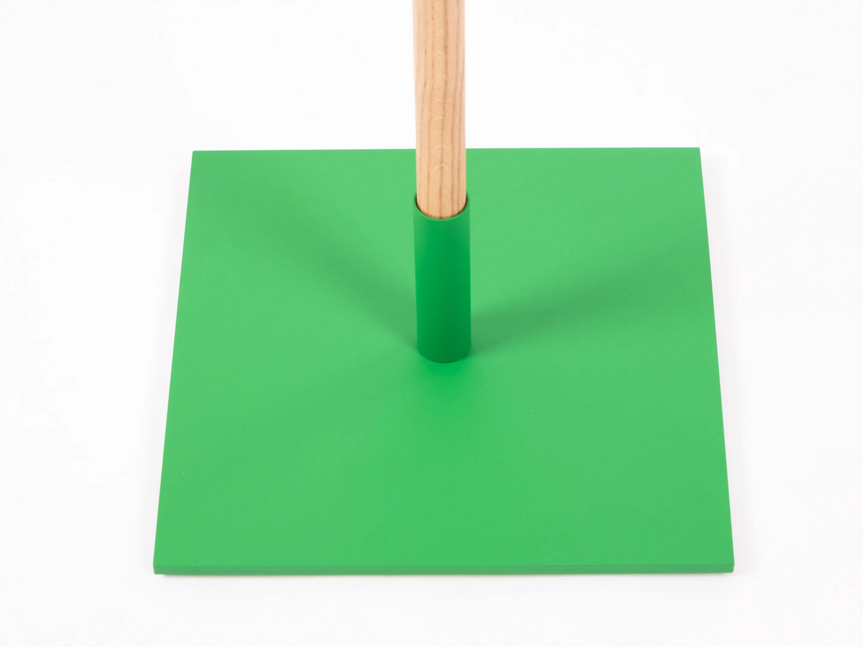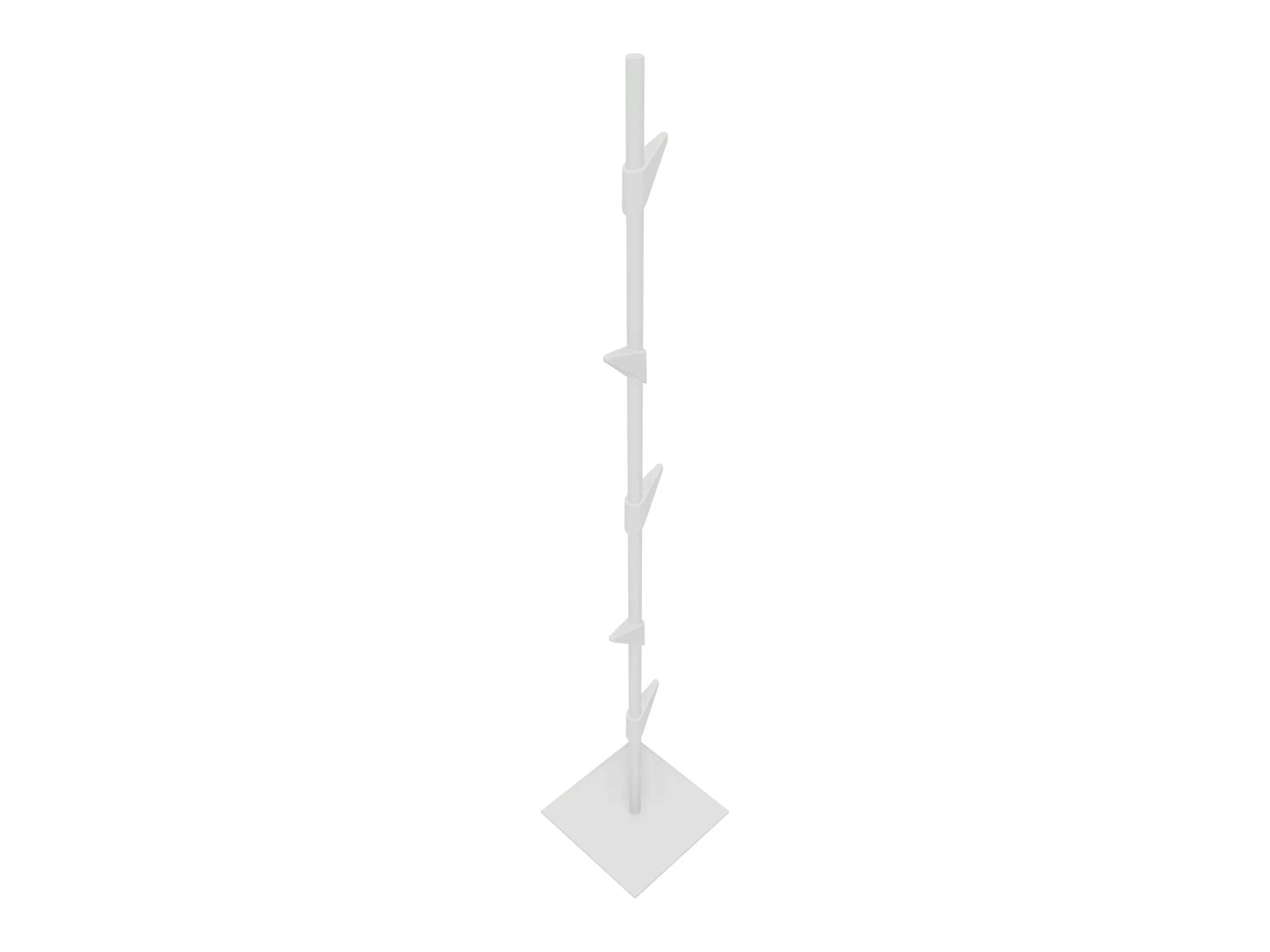 Staande kapstok met één stalen pilaar met hierop 5 kunststof haken (hoogte is vrij te bepalen). Afmeting: 330 x 330 x 1770mm (BxDxH)