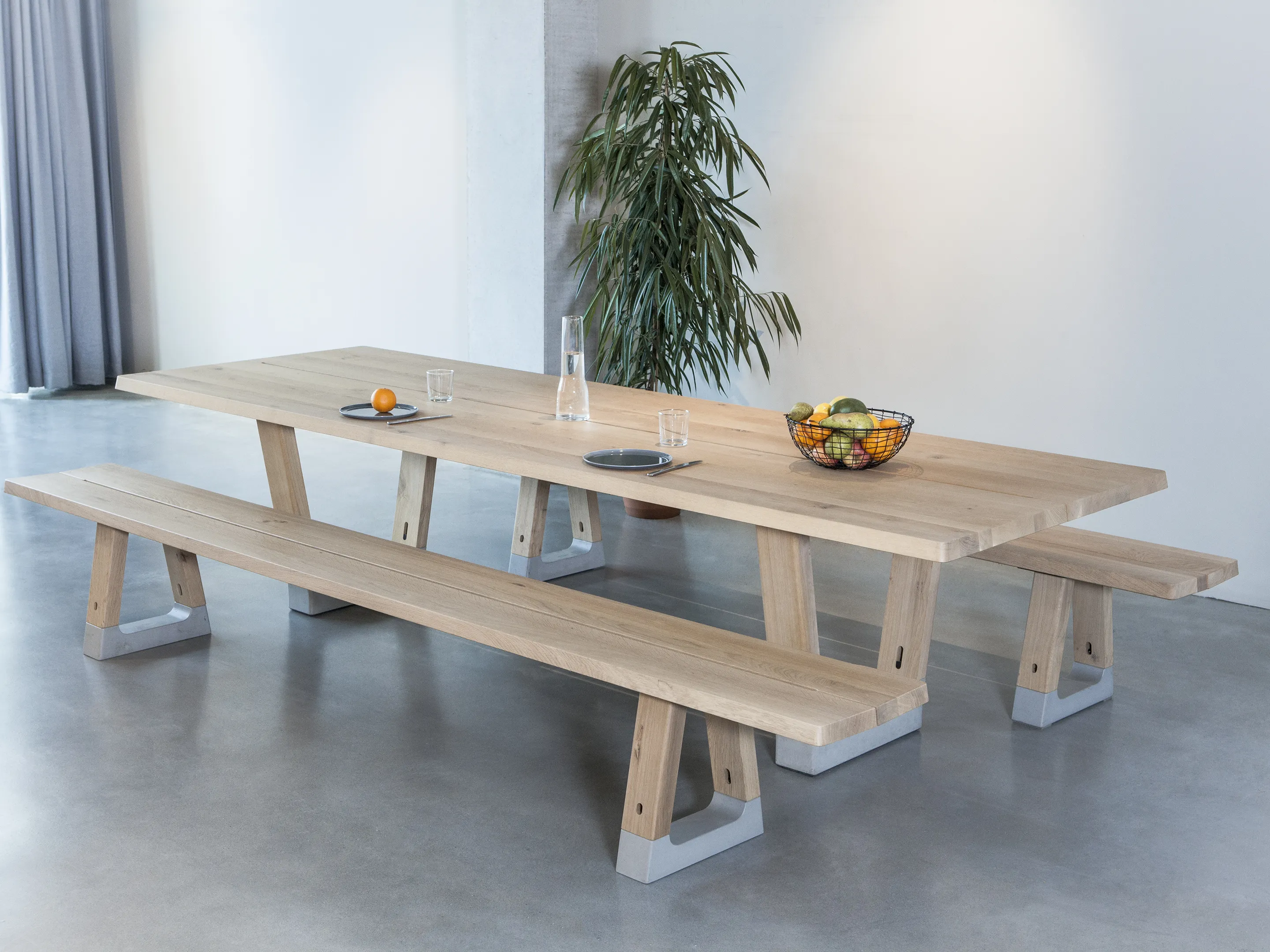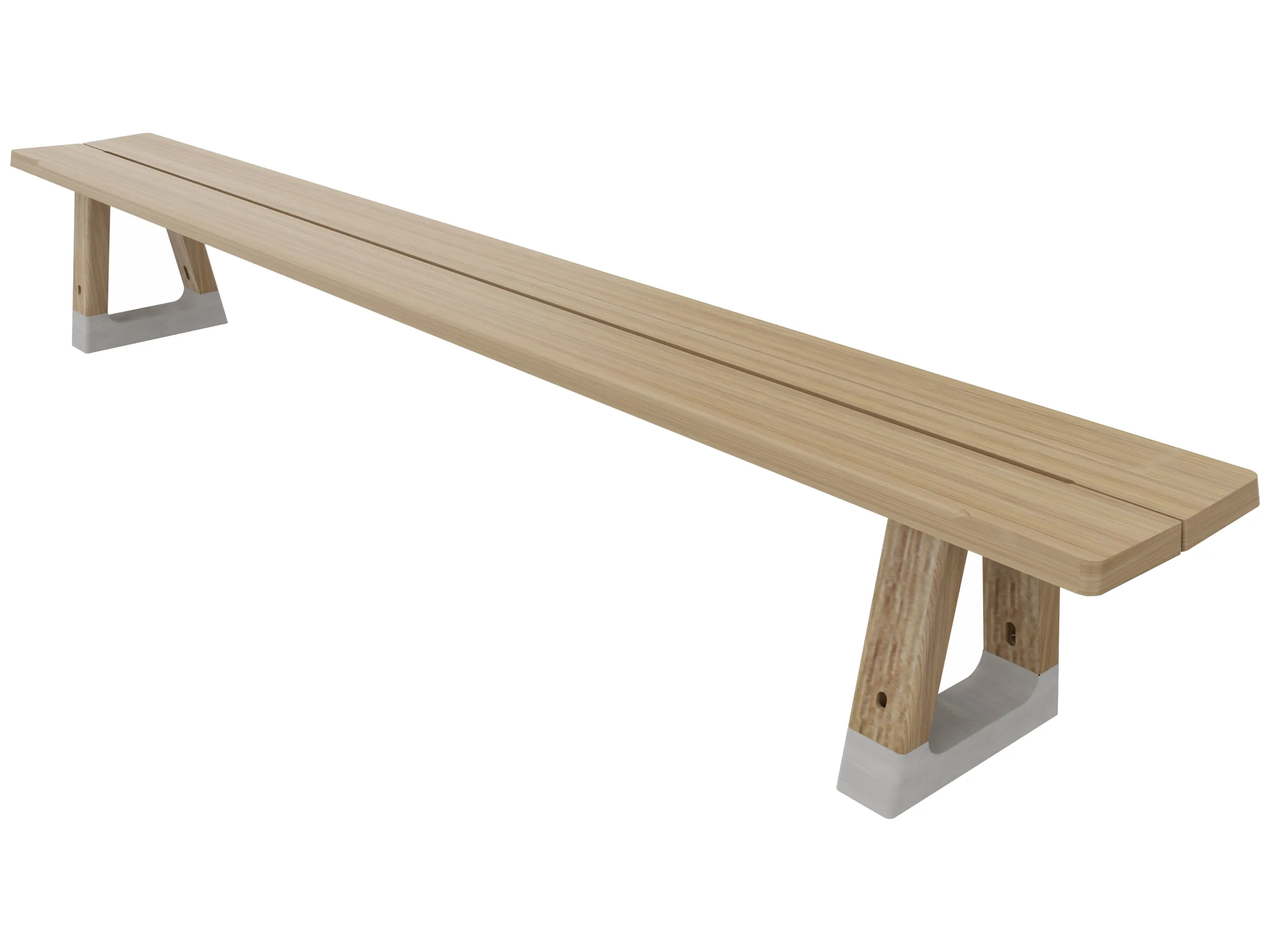 Bench in rechthoekige vorm, bestaande uit 2 bladen met 2 betonnen voeten. Afmeting: 3200 x 400 x 450mm (BxDxH).