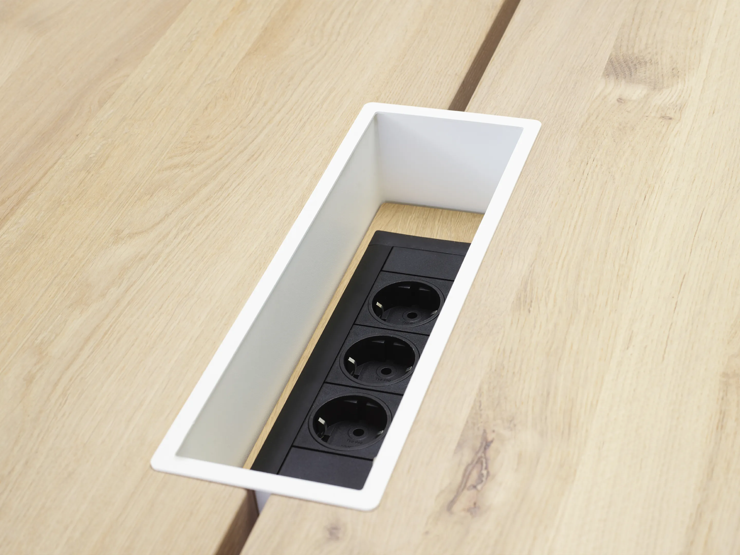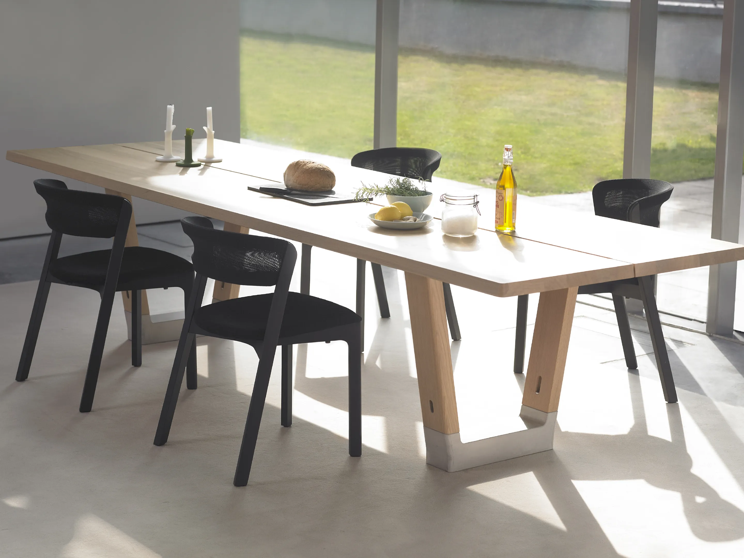 Vergadertafel in rechthoekige vorm, bestaande uit 2 bladen met 2 betonnen voeten. Afmeting: 3600 x 1200 x 750mm (BxDxH). Let op: Inspringing poot kan alleen op 52cm bij deze maatvoering.