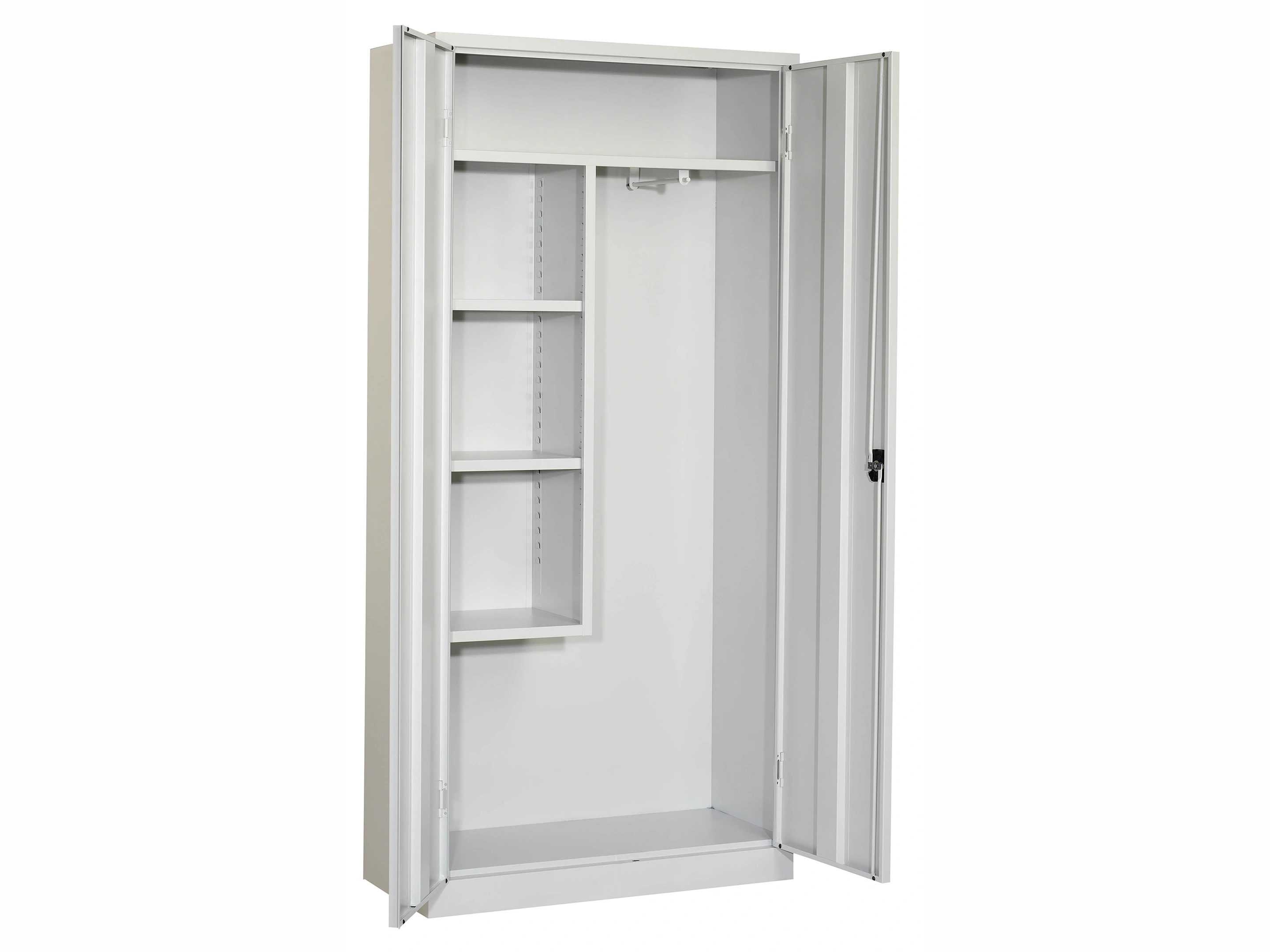 draaideur, type slot: cilinderslot. Kleur romp: grijs (RAL7035), kleur deuren: grijs (RAL7035). Afmeting: 180x80x50 cm (HxBxD). Indeling: Links 3 vakken, rechts, stang met haken. Aantal deuren: 2, aantal sleutels: 2.