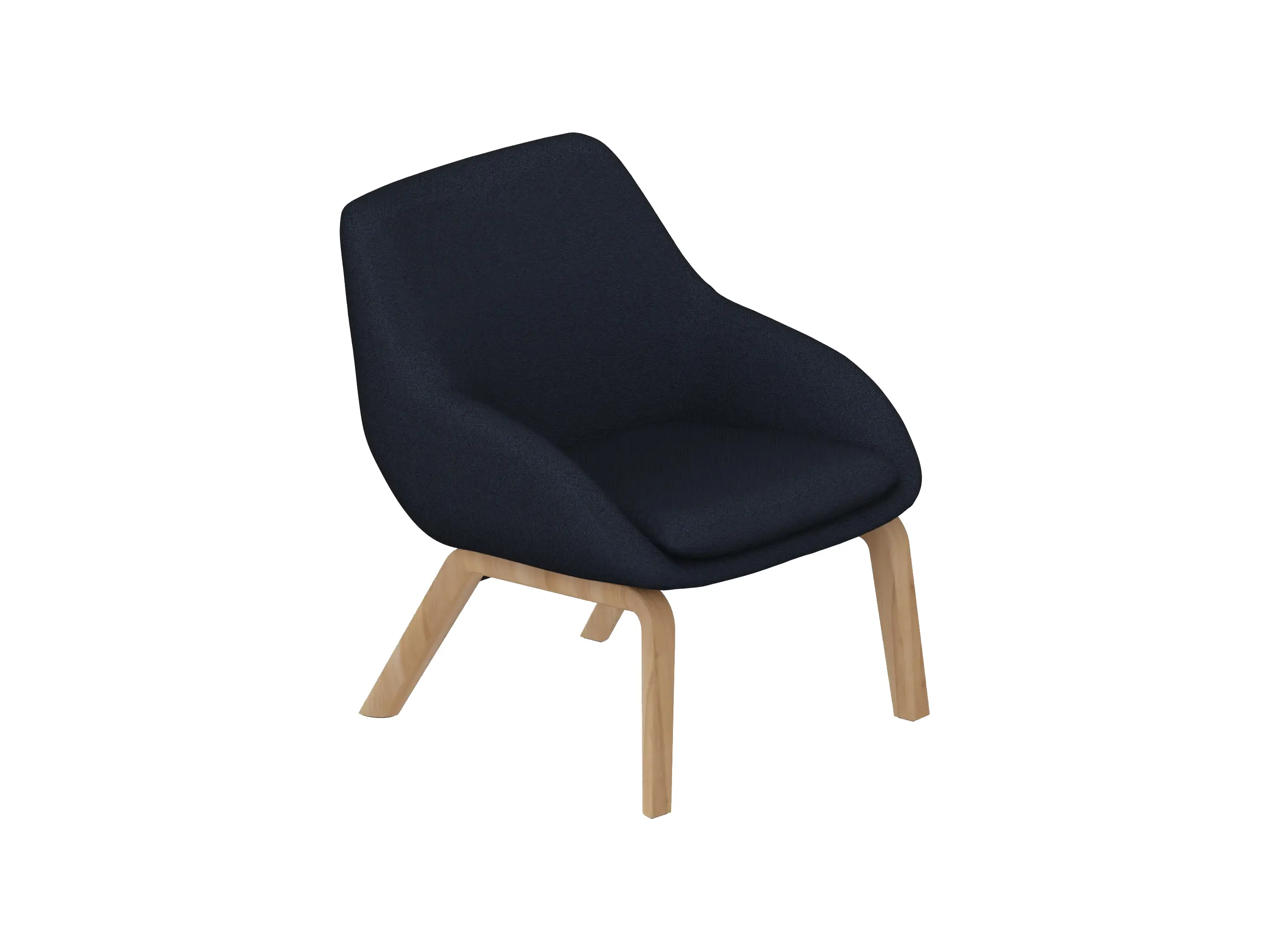 Fauteuil met volledig gestoffeerde kuip met een lage rug op een houten 4-poots frame voorzien van glijders