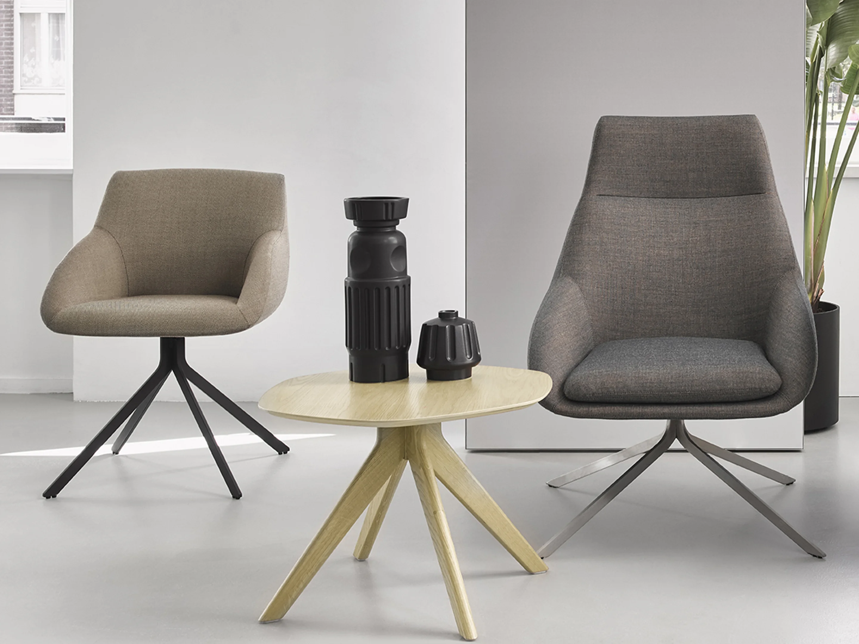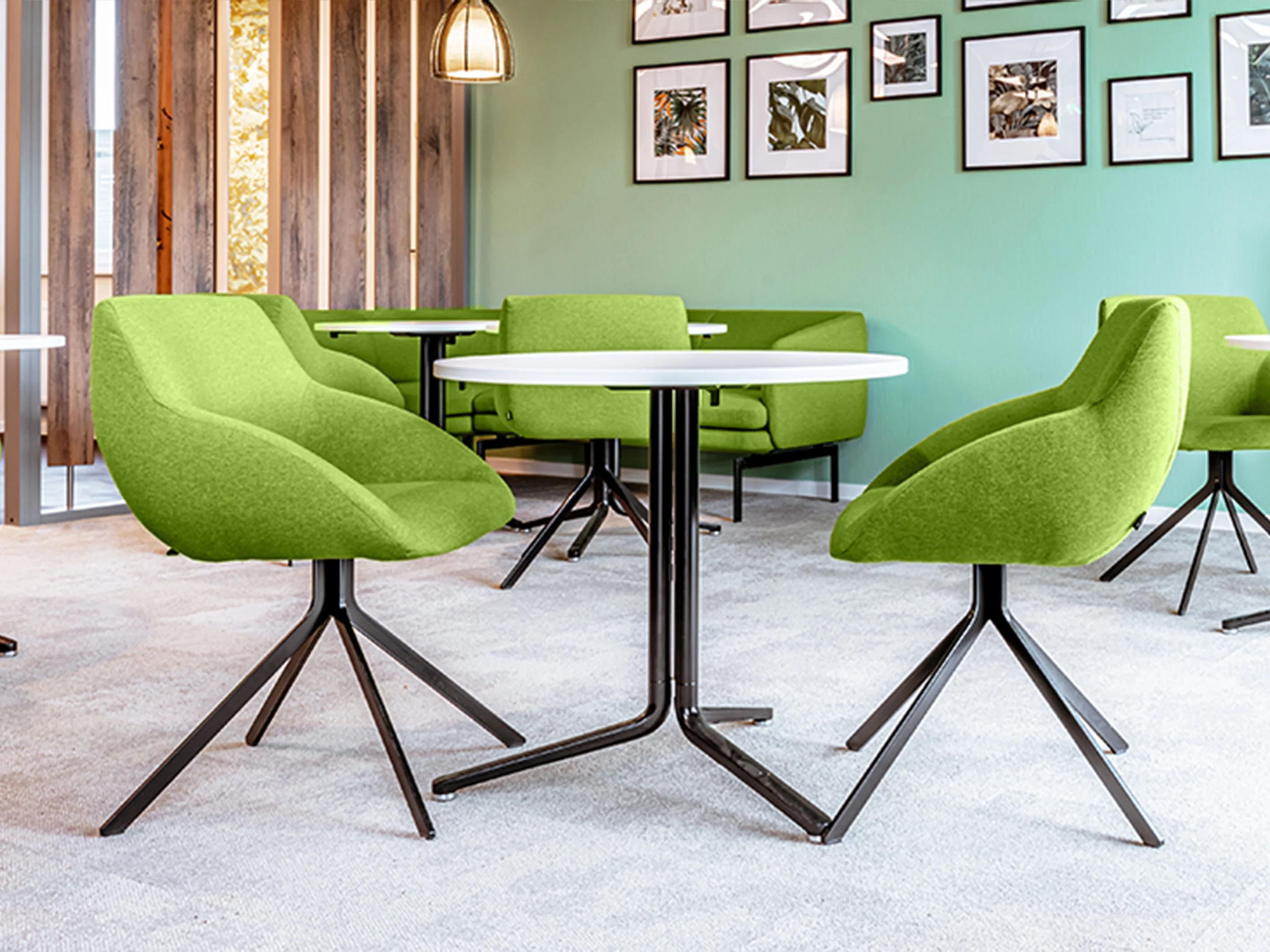 Vergaderstoel met volledig gestoffeerde kuip en op 4-teens kruis (standaard niet draaibaar).