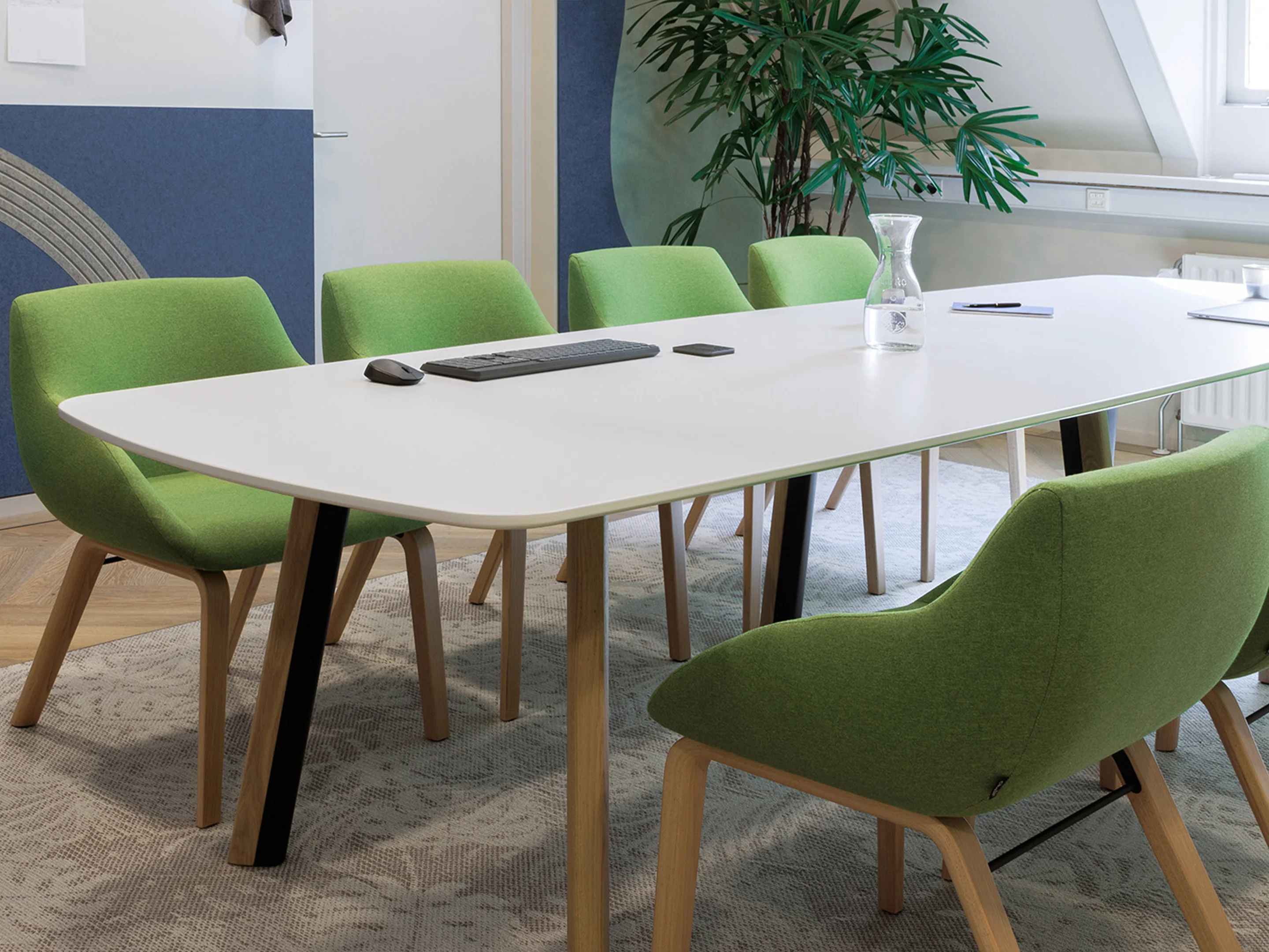 Vergaderstoel met volledig gestoffeerde kuip en op houten 4-poots onderstel.