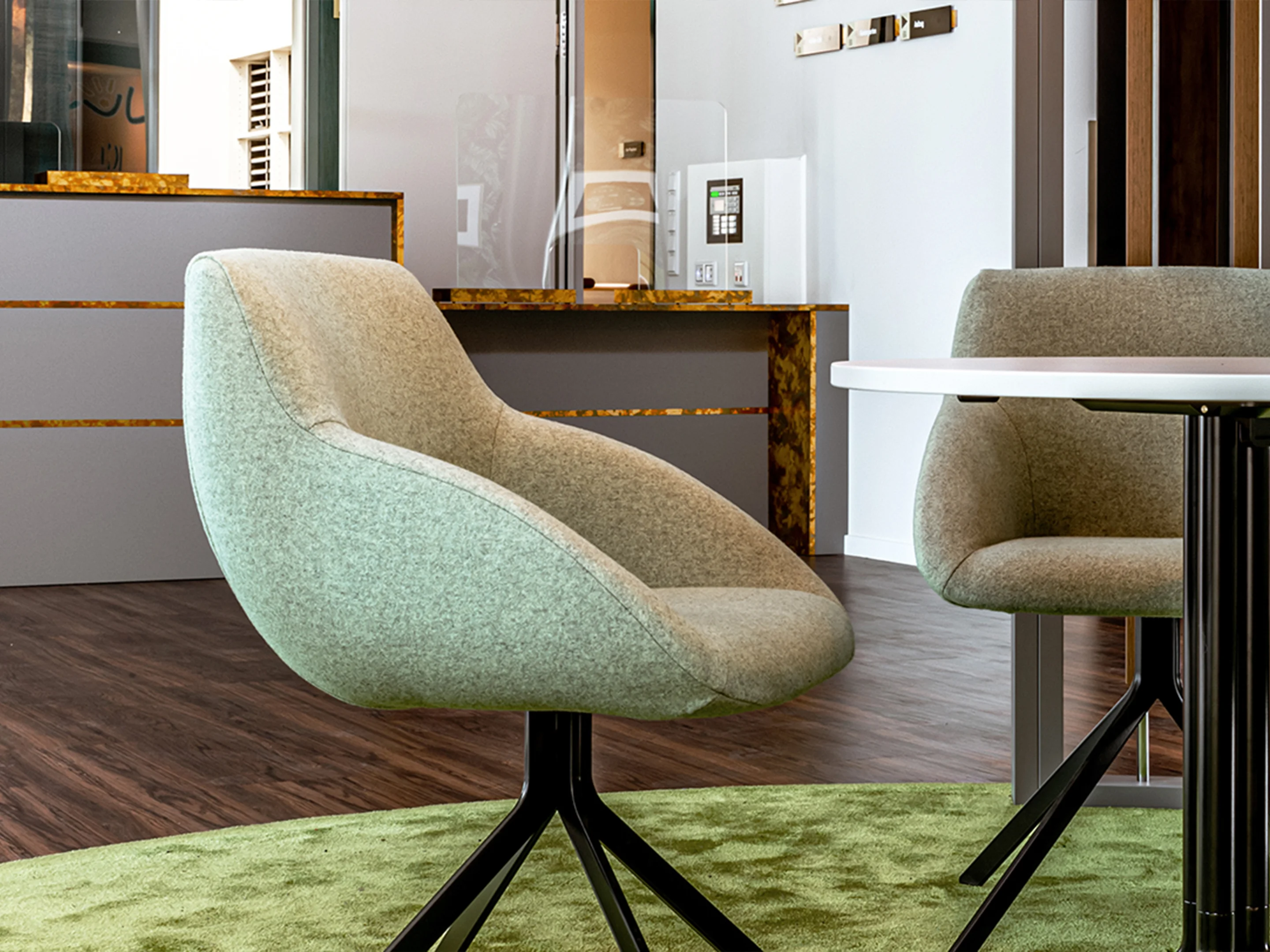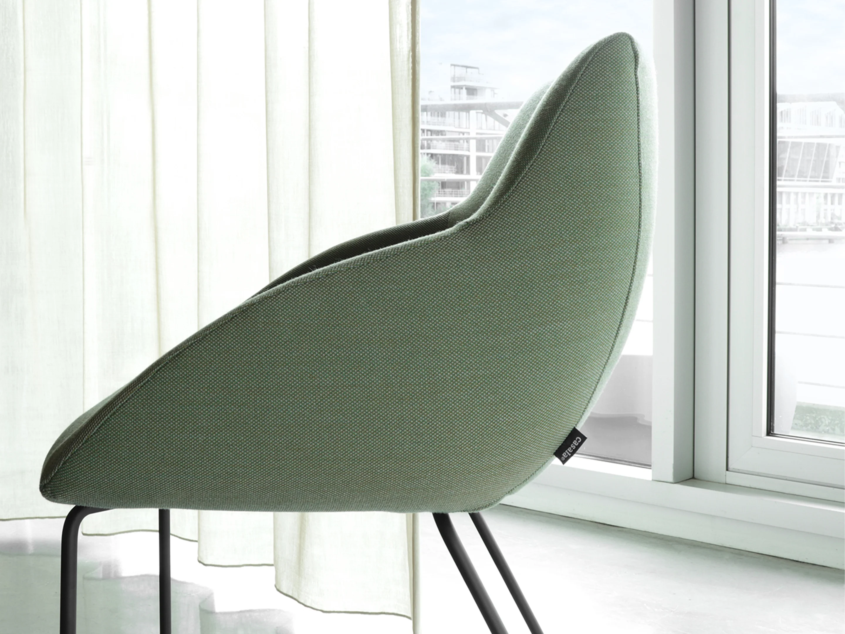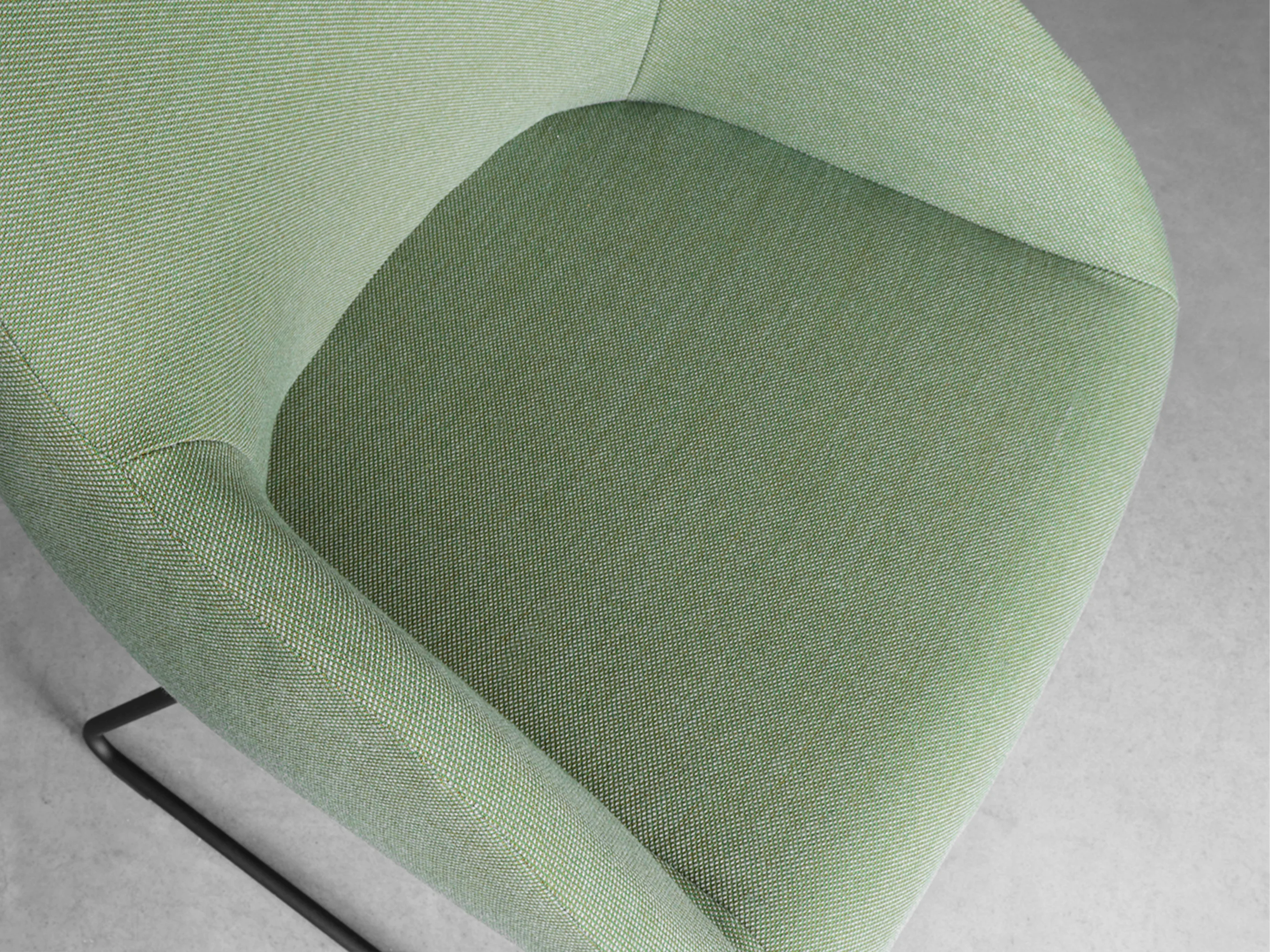 Vergaderstoel met volledig gestoffeerde kuip en op sledeframe.