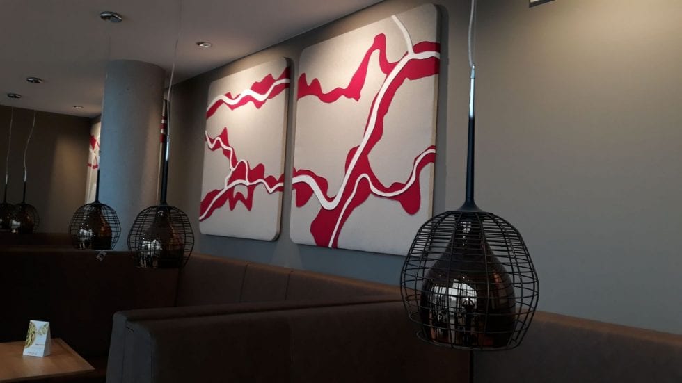 Opgebouwd uit een 40mm berken multiplex frame, gevuld met gerecycled katoen, absorbtieklasse A/NRC waarde 0,95.