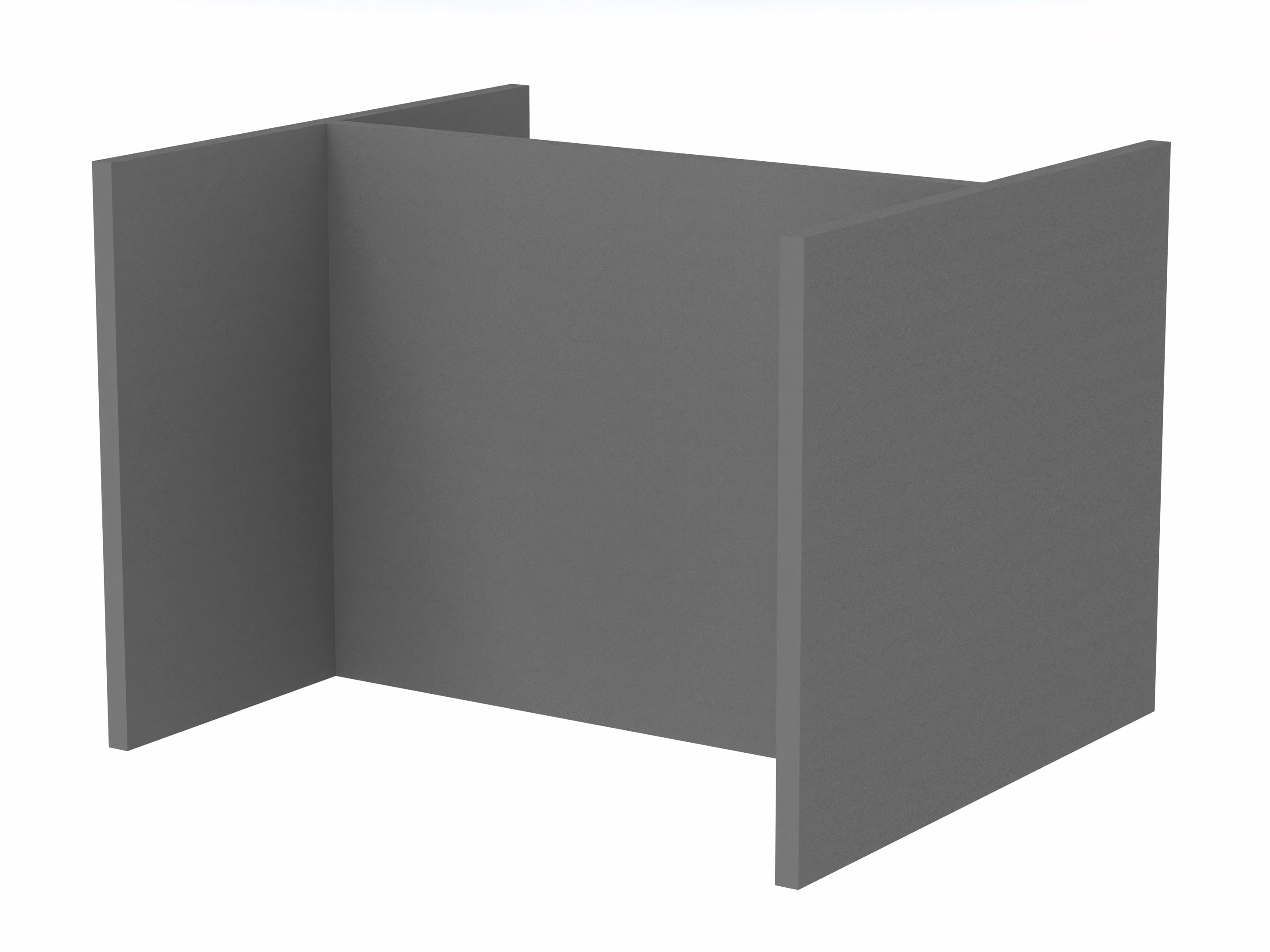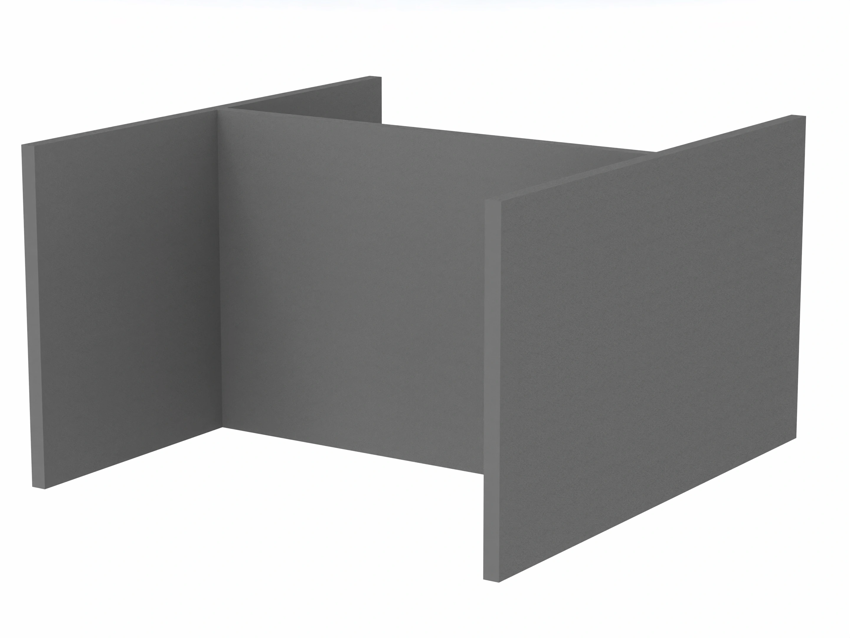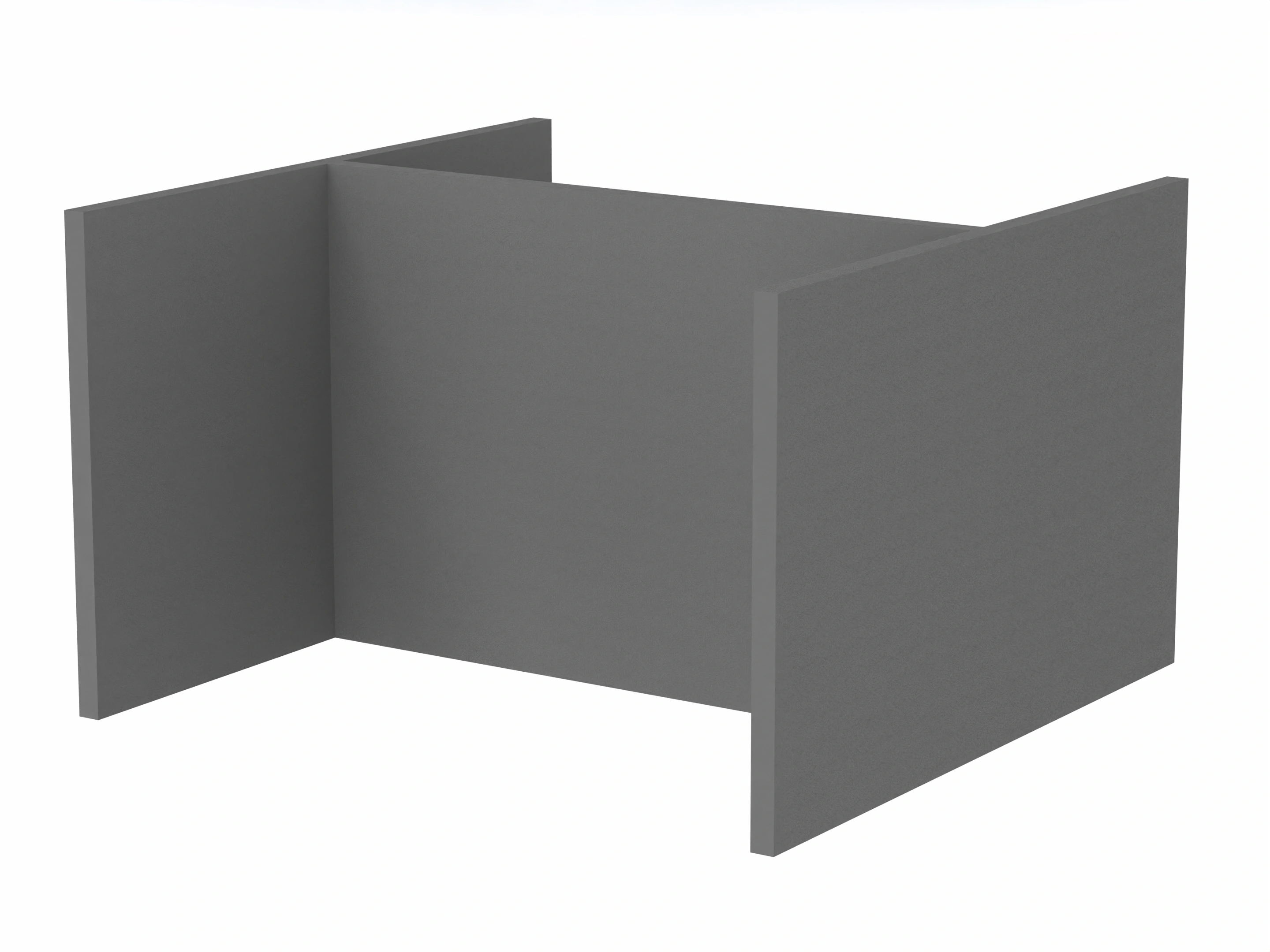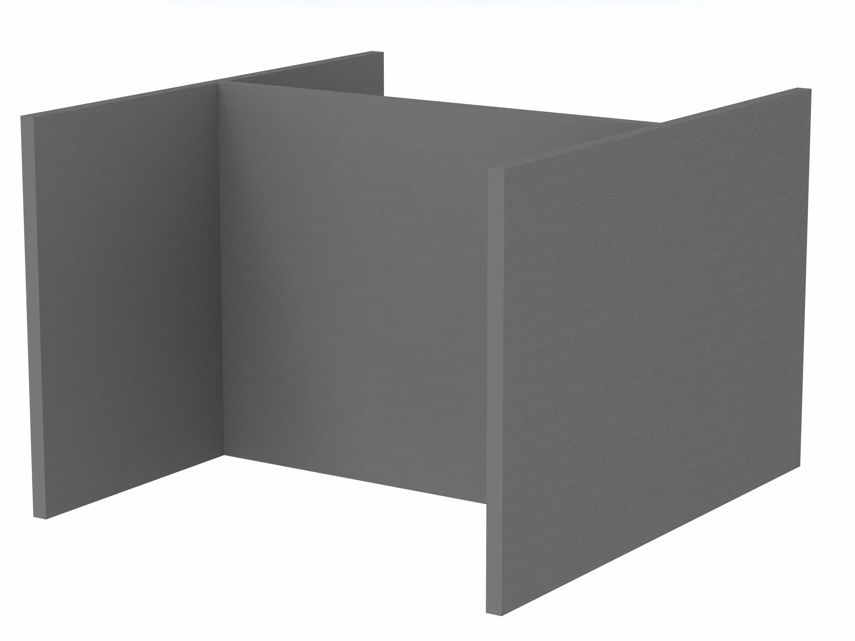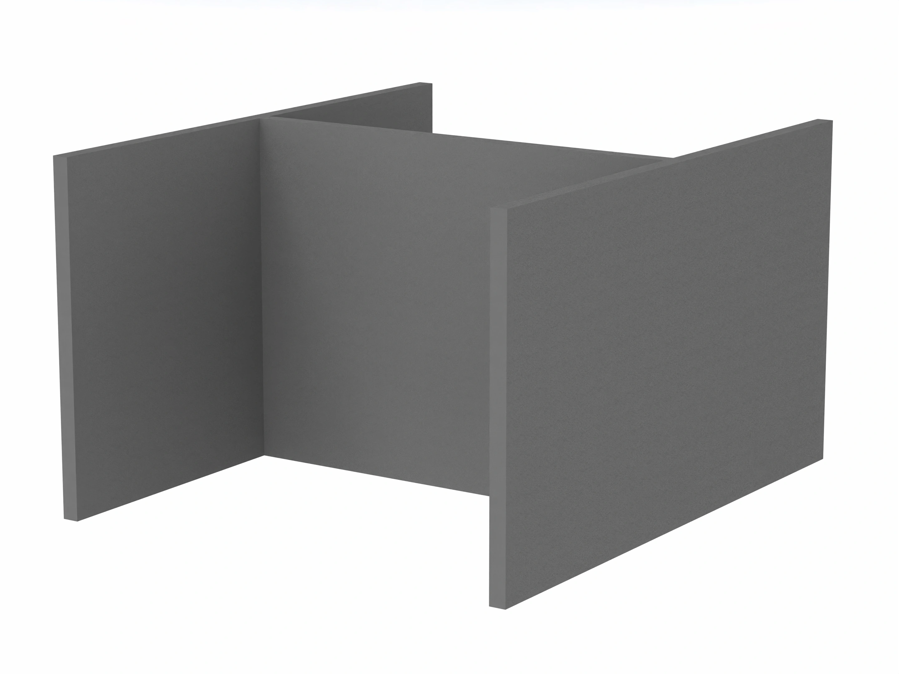 Bestaande uit 1 staand frontpaneel tussen 2 staande zijpanelen. Panelen zijn opgebouwd uit een 40mm berken multiplex frame, gevuld met gerecycled katoen, absorbtieklasse A/NRC waarde 0,95. Gegeven maatvoering zijn bureaumaten